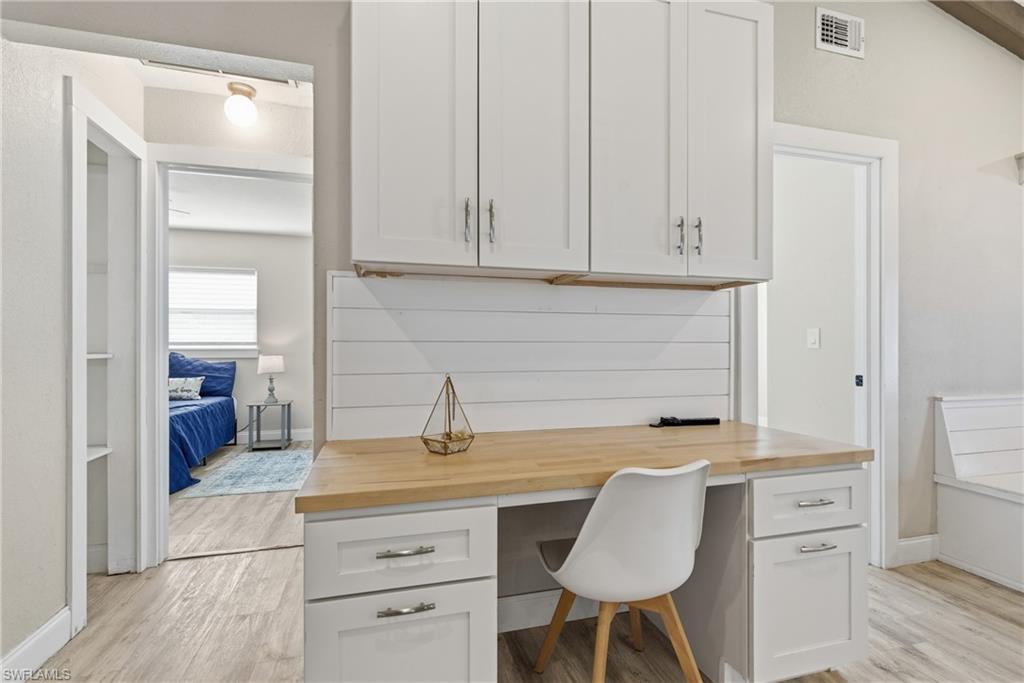 Step into a home where modern luxury meets timeless character, thoughtfully designed to combine style, functionality, and comfort. From the charming wood beam ceilings to the custom hanging shelving, every detail has been meticulously curated. At its heart, the updated kitchen stands out with granite countertops, stainless steel appliances, and a built-in table with a snack bar island, perfect for casual meals or entertaining. Elegant wood flooring flows throughout, creating a warm, inviting ambiance, while the primary bedroom serves as a tranquil retreat with a wood herringbone accent wall and a spa-like en-suite featuring a walk-in shower. Located in Cape Coral, this home offers the quintessential Florida lifestyle. Enjoy proximity to world-class beaches, championship golf courses, and scenic waterways, perfect for boating and fishing. With year-round sunshine and the added benefit of no state income tax, this property provides the perfect mix of beauty, relaxation, and financial advantages in Southwest Florida. This is more than just a house—it’s your gateway to coastal living. Don’t miss the opportunity to make this dream home yours. Schedule your private tour today!