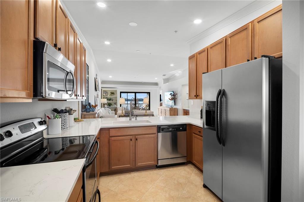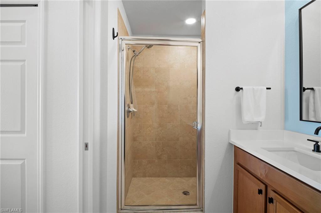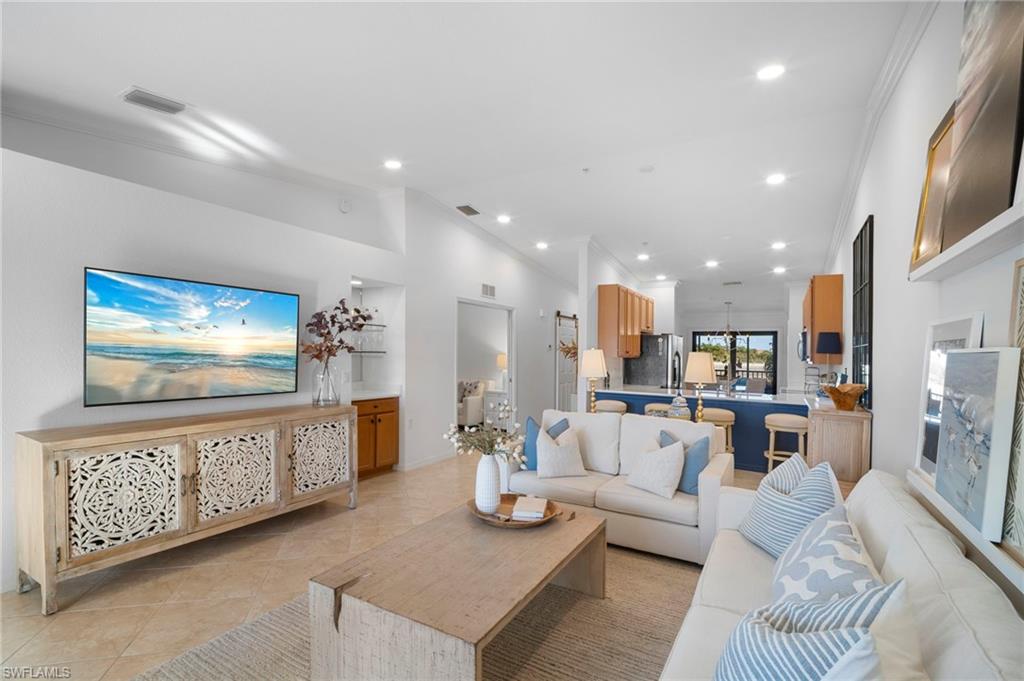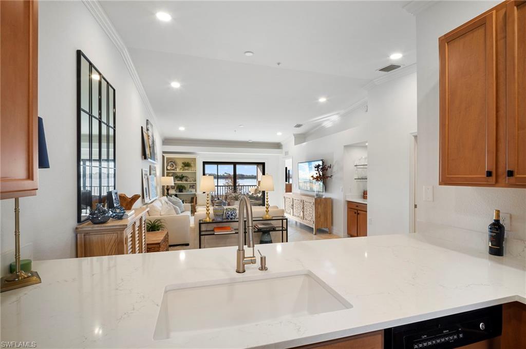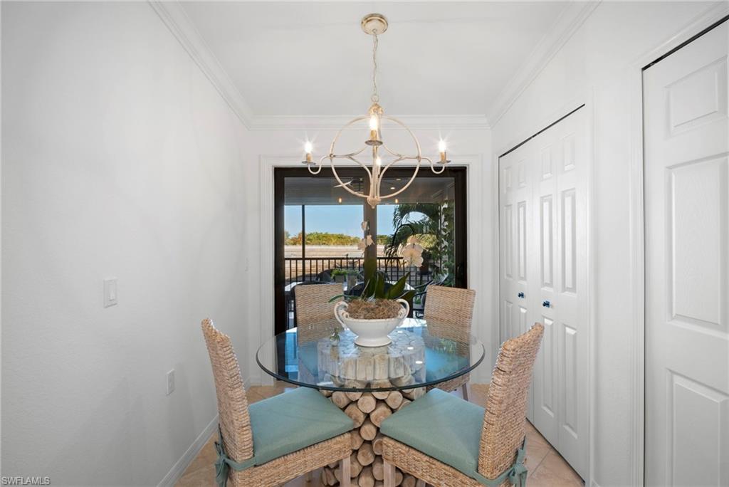 Golf membership included with this nicely updated, top floor Veranda condo, featuring a southern lake & golf view from the master bedroom & back lanai. Updates include QUARTZ kitchen, bathroom & bar countertops; NEW sinks & faucets; brand NEW luxury VP wood floors in bedrooms & den; new recessed lighting, fans, fixtures and bathroom mirrors; custom window coverings and sun shades; noseeum screens on both lanais. Turnkey and move-in ready with designer furnishings & freshly painted throughout! Heritage Bay features a stunning 27-hole Lewis-Azinger designed golf course and aqua driving range. The grand clubhouse offers diverse dining options, elegant event spaces, and a lively social scene. Have a bite to eat in The Grille Room- a casual indoor/outdoor bar & dining area, with an incredible southern view of the 27th green. Members can also enjoy a resort-style pool area with heated spa & 'The Cabana' poolside bar & grille with a full service kitchen. The community also includes a top-notch tennis program with 6 har-tru clay tennis courts, 6 pickleball courts, bocce, and a state-of-the-art fitness center. With a calendar full of events and activities, Heritage Bay ensures a vibrant and luxurious lifestyle for its members. Whether you're a golf enthusiast or simply looking for serene views and luxury living, Heritage Bay offers it all.