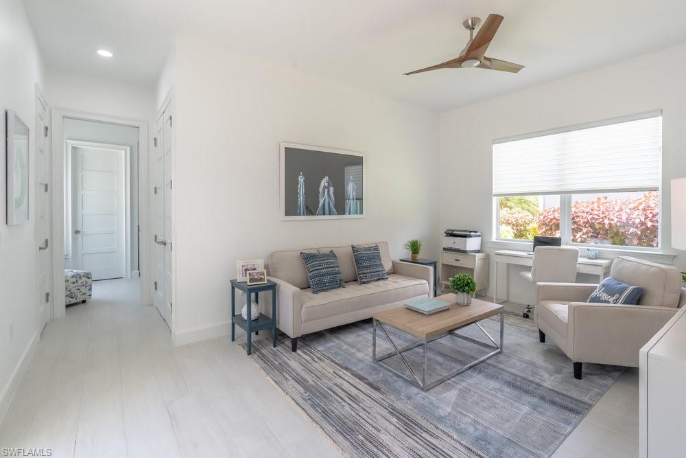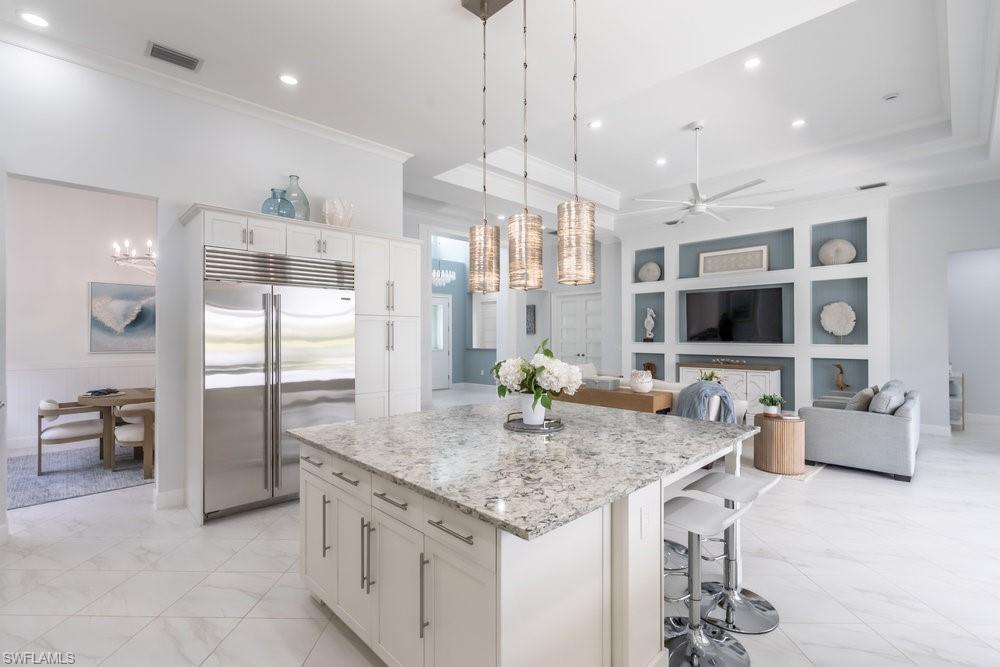Bathed in natural light, this home exudes calm coastal sophistication and timeless elegance. Impeccably maintained and thoughtfully enhanced, every element reflects today’s elevated luxury expectations. The spacious great room opens effortlessly to the outdoors through oversized glass sliders that disappear into the wall, creating a seamless indoor-outdoor flow ideal for the relaxed Florida lifestyle buyers seek.
