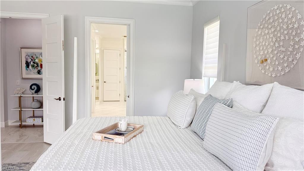 Located in its own wing, the owner’s suite is a tranquil retreat with soothing tones, huge water views, a soaking tub, a natural light-infused shower, dual vanities, and two generous walk-in closets. Two additional ensuite guest bedrooms provide comfort and privacy, while a fourth flex room serves as a den, office, or bedroom.