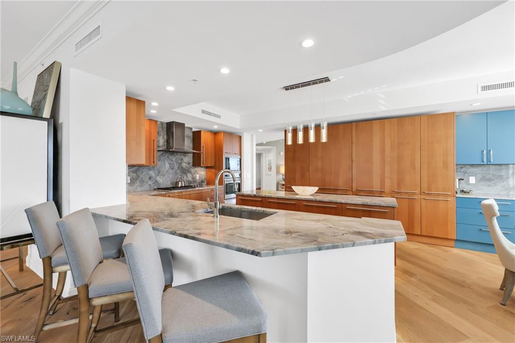 Sun-filled interiors and walls of glass showcase sweeping vistas across Wiggins Pass, the Gulf, private marinas, and lush fairways of Kinsale Golf Club; creating a sense of calm and openness rarely found. The residence is equally suited for intimate moments and stylish entertaining, with a flowing layout that connects formal and casual living spaces to a gourmet kitchen appointed with Wolf gas cooking, premium appliances, custom cabinetry, and dedicated wine and beverage refrigeration.