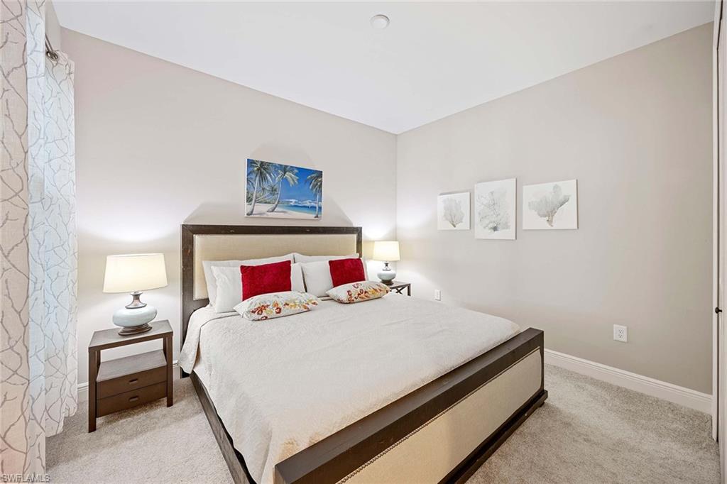 Experience Coastal Luxury at Its Finest in Marquesa Isles. The essence of refined living in this exceptional two-bedroom plus den residence, blending timeless design with modern upgrades, this home offers an unmatched lifestyle. As you step into the welcoming foyer, you're immediately embraced by an atmosphere of sophistication, featuring 9-foot ceilings, 8-foot doors, and elegant 24'' x 12'' ceramic tile flooring throughout the main living areas. A set of glass French doors opens to a spacious 11' x 12' den, offering the ideal space for a home office, reading room, or guest retreat. The open-concept kitchen is a true centerpiece, thoughtfully designed with an oversized quartz island, G. E. stainless steel appliances, and a designer tile backsplash that adds both function and flair. 42-inch cabinetry adorned with crown molding and under-cabinet lighting provide both elegance and practicality, making this kitchen a dream for any culinary enthusiast. Flowing effortlessly into the 16' x 17' great room, the living space is highlighted by a coffered ceiling with crown molding and expansive southern exposure lake views that bring the outdoors in with natural light and a tranquil ambiance. It's the perfect setting for both entertaining and relaxing. The primary bedroom suite is a luxurious retreat, beautifully appointed with Belle Meade designer furniture, including a dresser and matching end table. It also features a large walk-in closet, a second additional closet, and a well-appointed en-suite bath with dual sinks and an oversized, designer-tiled shower, all crafted with premium finishes for a spa-like feel. Step outside to a 14' x 10' screened lanai with 10 ft extension, complete with a sunshade and southern exposure, offering the perfect place to enjoy your morning coffee or unwind at sunset with serene lake views. Additional thoughtful features include Impact pocket sliding doors with unobstructed lake views, plush carpeting in the bedrooms, custom blinds and curtains throughout. Smart Hub connects to Z-wave devices to the front door lock, thermostat, doorbell camera and garage door opener along with Hotwire fiber-optic service for high-speed TV and internet. The 18' x 20' garage has been upgraded with a durable epoxy floor, R-31 insulated garage door and attic insulation, enhancing comfort and energy efficiency year-round. Residents of Marquesa Isles enjoy access to exclusive amenities including a Clubhouse, resort-style pool and hot tub, dog park, and beautifully maintained grounds—all within a private, gated community that epitomizes coastal luxury and carefree living. Just minutes from Naples' best shopping, golf courses, and world-renowned beaches.