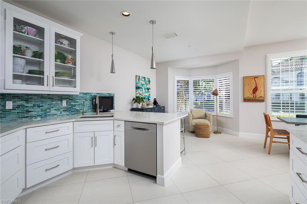 This beautifully renovated end residence in Colonade at Park Shore offers a premier lakefront setting near the community clubhouse and pool. The open-concept kitchen features quartz countertops, white cabinetry with glass inlays, and stainless-steel appliances. The primary suite includes an elegant bathroom with a designer tile and lighting package. Additional upgrades include a newer roof, some impact-resistant windows (excluding mitered glass windows), new shaker-style interior doors, and renovated baths. The home showcases white 48-by-24-inch porcelain tile flooring, 8-inch baseboards, and plantation shutters throughout. The flexible third bedroom can serve as an office or media room. A screened lanai overlooks the lake and water fountain, creating a tranquil outdoor living space. Colonade residents enjoy a gated community with a renovated clubhouse, fitness center, pool, spa, and convenient access to Venetian Village and the private Park Shore beach and berm path.