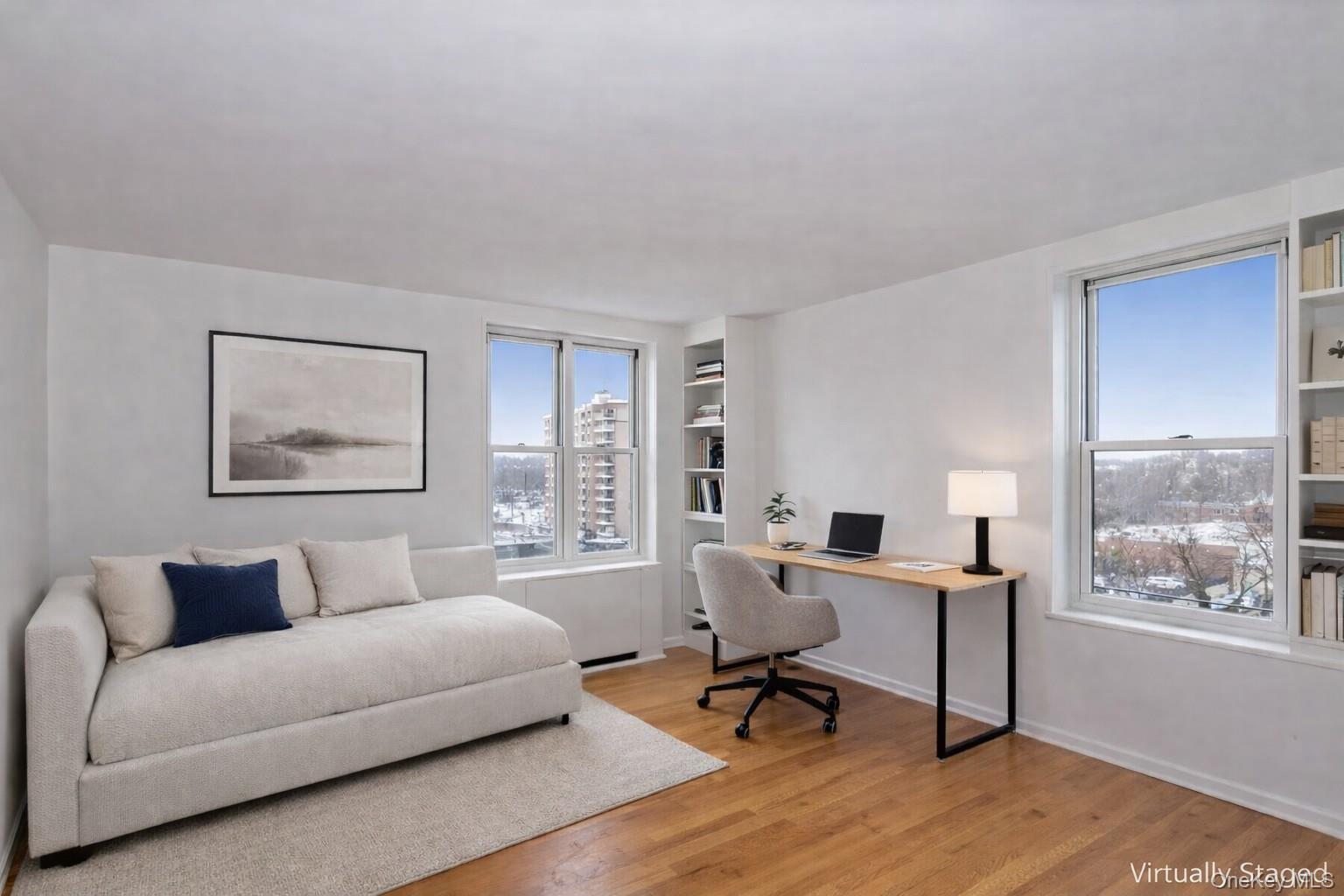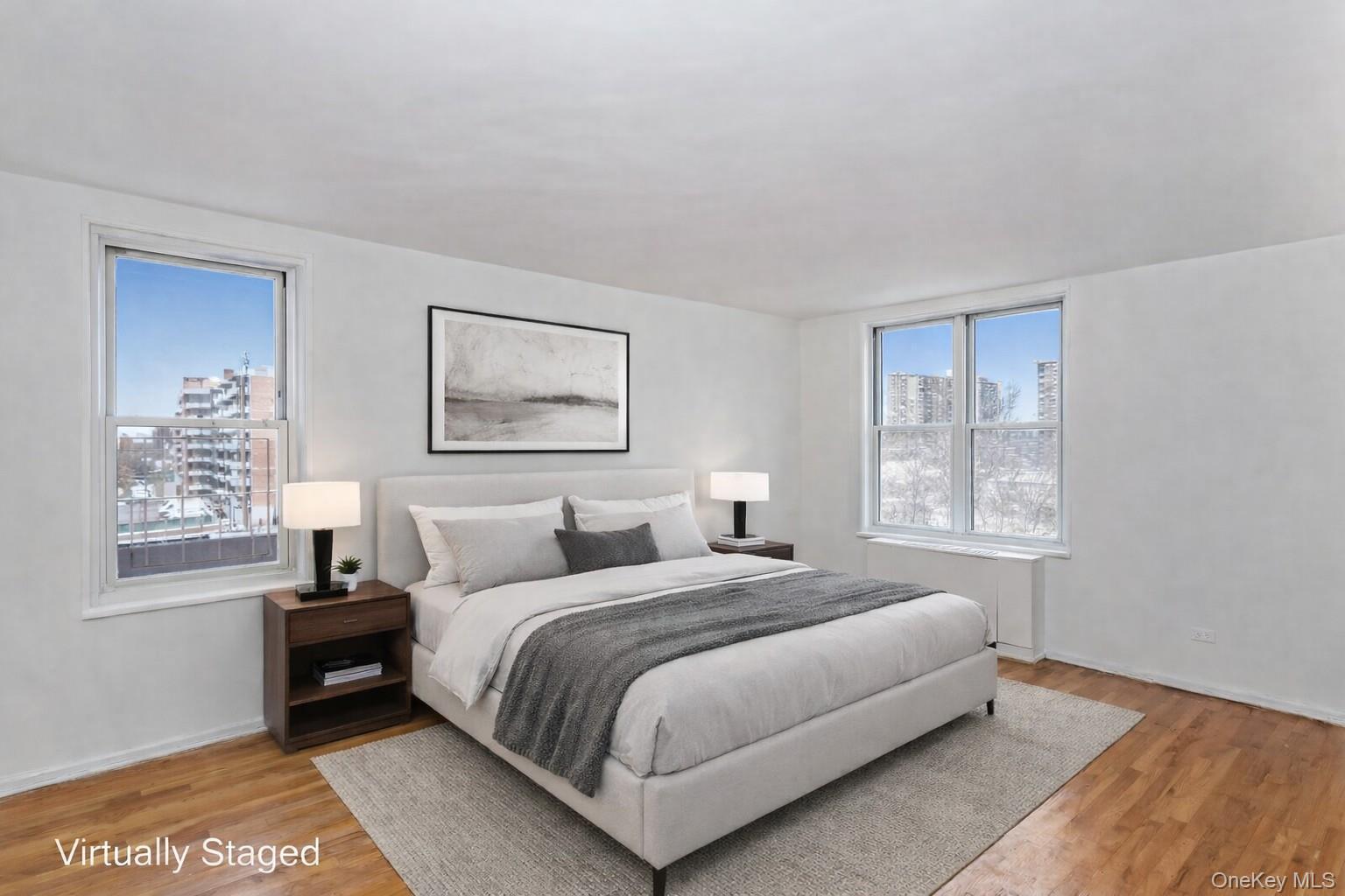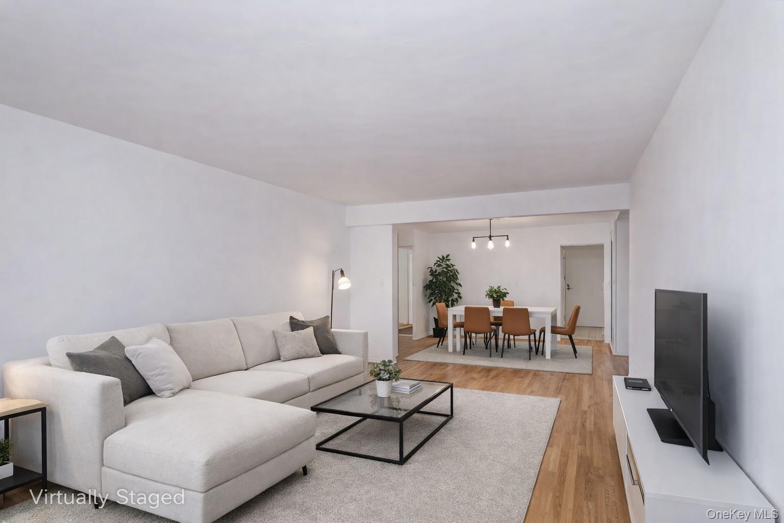 Welcome to this spacious top-floor 2-bedroom offering over 1, 000 sq ft and a private blacony in a highly sought-after community. From the moment you enter the foyer, with its convenient half bathroom, you’re greeted by hardwood floors and a long, flowing living and dining area that opens to a large private balcony with beautiful views of the Throgs Neck Bridge and partial views of Little Neck Bay. The layout includes a generous eat-in kitchen, ample closets throughout, and two very large bedrooms situated along a quiet back hallway, accompanied by a full bathroom. The building offers excellent amenities, including a private pool with membership included in the maintenance and excellent access to Bay Terrace Shopping Center. Monthly maintenance also covers all utilities and real estate taxes, providing exceptional value. Near to highways, Queens-Manhattan express buses and LIRR. A rare combination of space, views, and top-floor living. Seller is willing to offer a renovation credit.