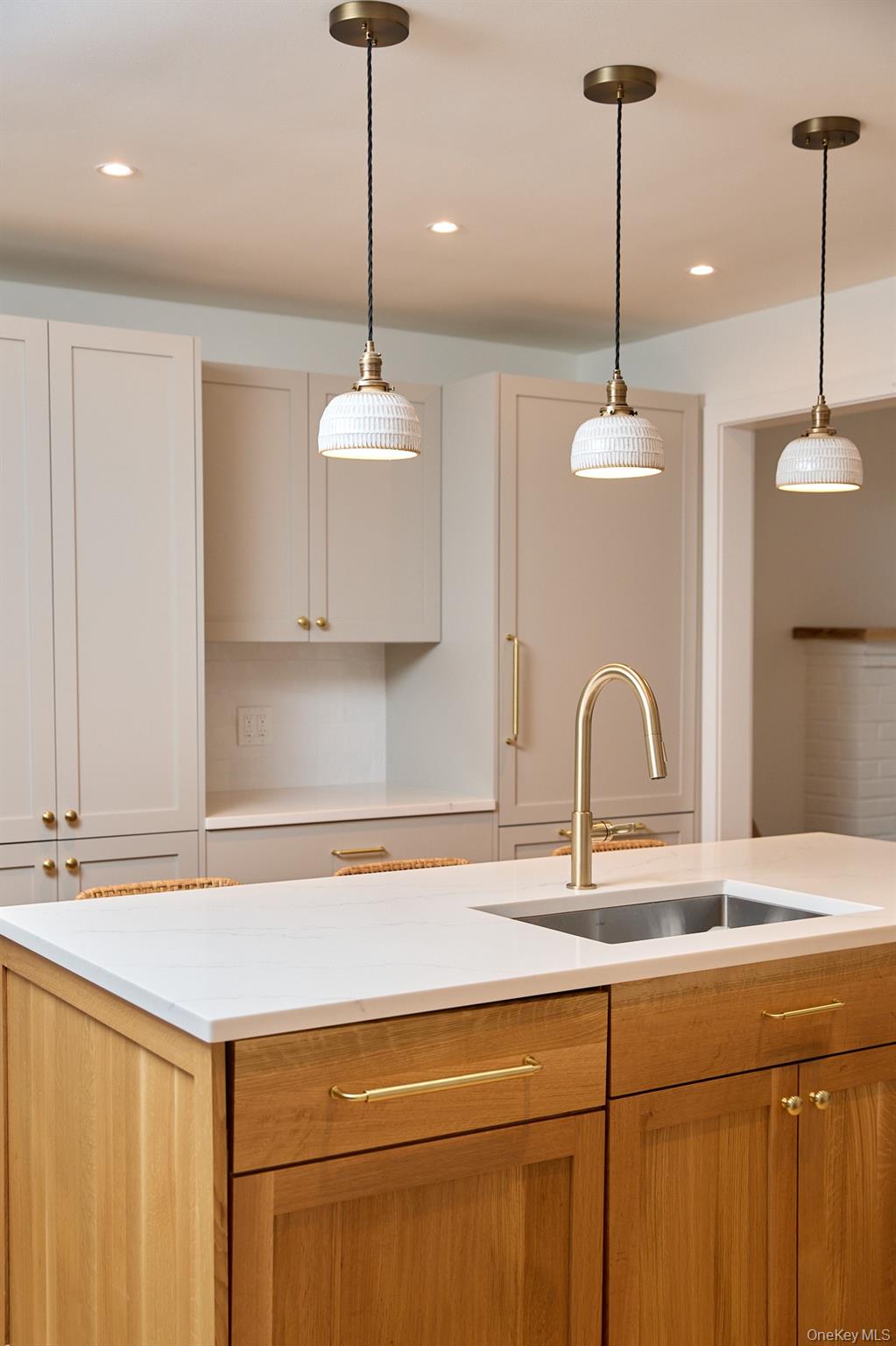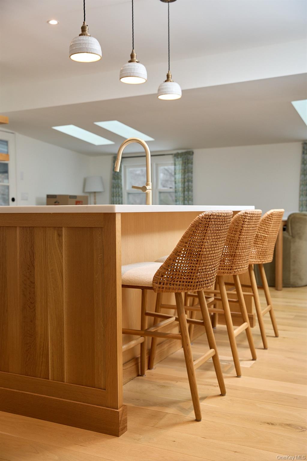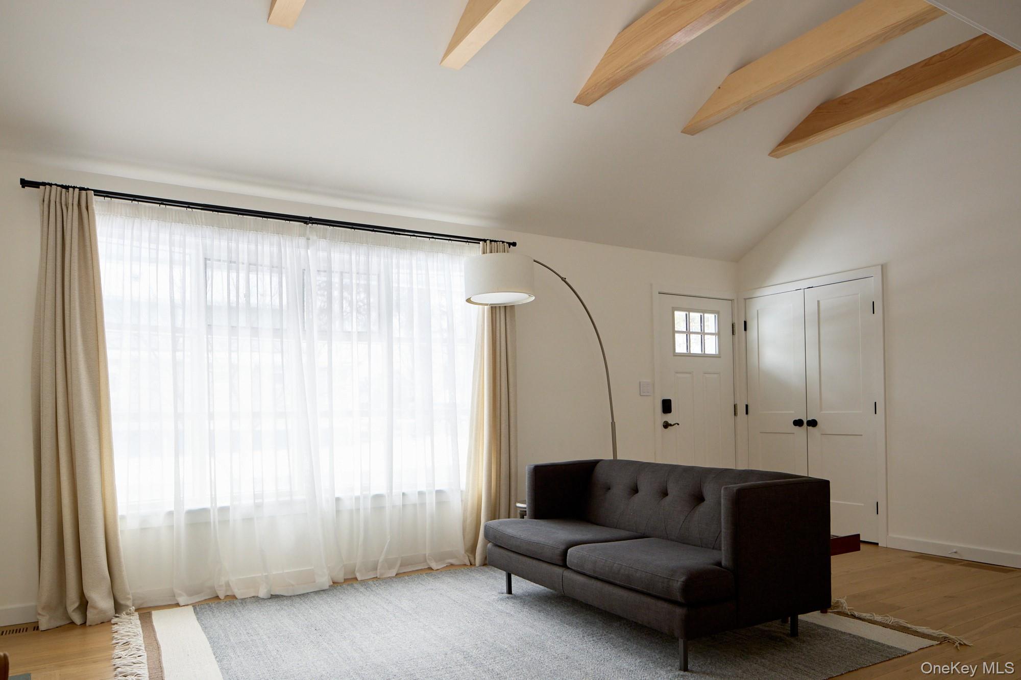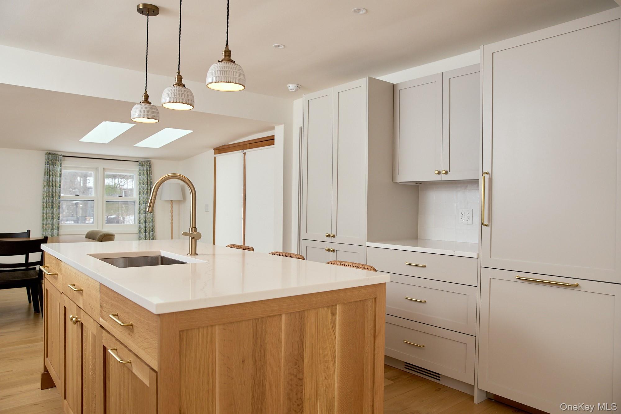 Set on the corner of Grove Street and John Street, this renovated ranch is perfectly located to enjoy village living in vibrant New Paltz. Mature maples shade the west side of this level, easy-care lot, and a cheery redbud stands out front. Inside, a professional redesign has created a home that offers a serene palette, clean lines, and simple luxuries, including new white oak hardwood floors throughout. The front door opens to the cozy living room, with its vaulted ceiling, brick fireplace, and bay window. Adjacent is the kitchen, the heart of this home, featuring soft gray custom cabinetry, quartz counters, streamlined hardware, Bertazonni appliances, and a super functional layout. Ceramic pendant lights add texture, while open wood shelving and the eat-in island's wood cabinetry add warmth. The dining room overlooks the backyard and receives sunshine from skylights and a french door leading to the new back deck. The main hall off the living room leads to a bedroom, a bathroom with modern styling and a deep Duravit tub, and a primary bedroom suite with walk-in closet. The ensuite bathroom is outfitted with radiant heat, a mid-century style double vanity and an enclosed shower with a deep mini tub—both bathrooms feature Toto Washlets. Off the kitchen is a third bedroom, with deck access, which is currently used as an office/playroom. The basement level offers tons of storage, washer and dryer, and potential to finish for additional living space. There’s also a convenient one-car attached garage. Systems updates include a fully upgraded electrical system including new breaker panel and new wiring, new HVAC system with smart thermostats, wireless smart home LED dimmer switches, new interior doors, new drywall, trim and fresh paintwork, and an EV charger. From this location, everything in downtown New Paltz is at your fingertips: dining, drinks, shopping, Elting Library, Hasbrouck Park, SUNY New Paltz, Trailways Bus Station, Moriello pool, Empire State Trail and Wallkill Valley Rail Trail. Call to book a showing today!