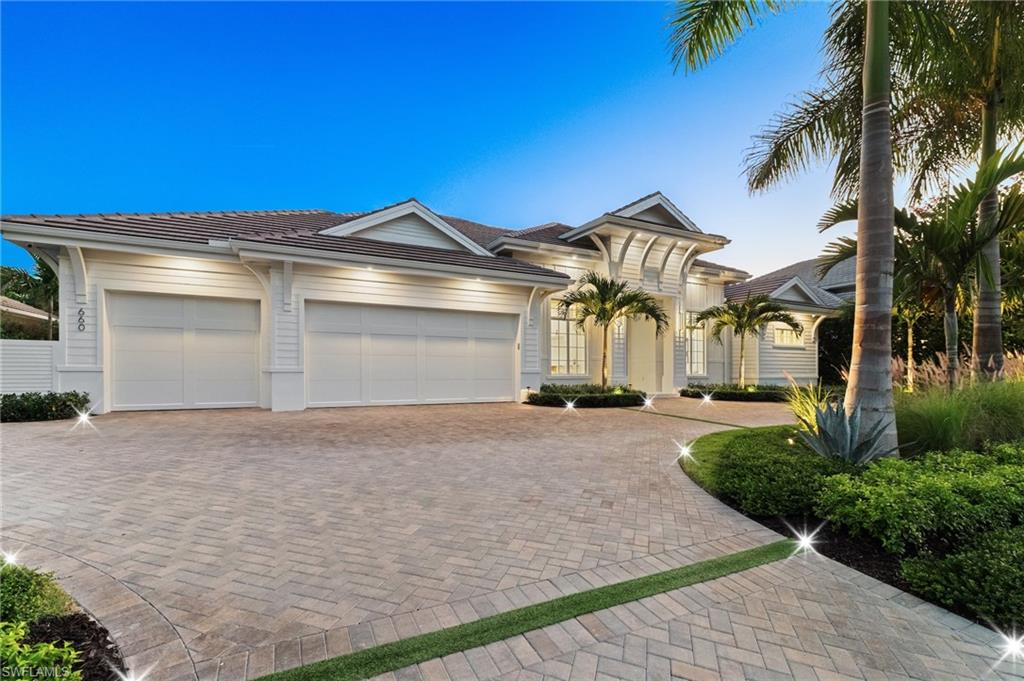 Breathtaking and luxurious, this newly constructed single-story Moorings residence is the epitome of refined coastal living. Crafted with uncompromising attention to detail, the home showcases the highest level of finishes—immediately evident upon entry. Designed for effortless living, the thoughtfully curated floor plan offers four spacious bedrooms plus a private office and four-and-a-half baths, perfectly accommodating both family and guests.