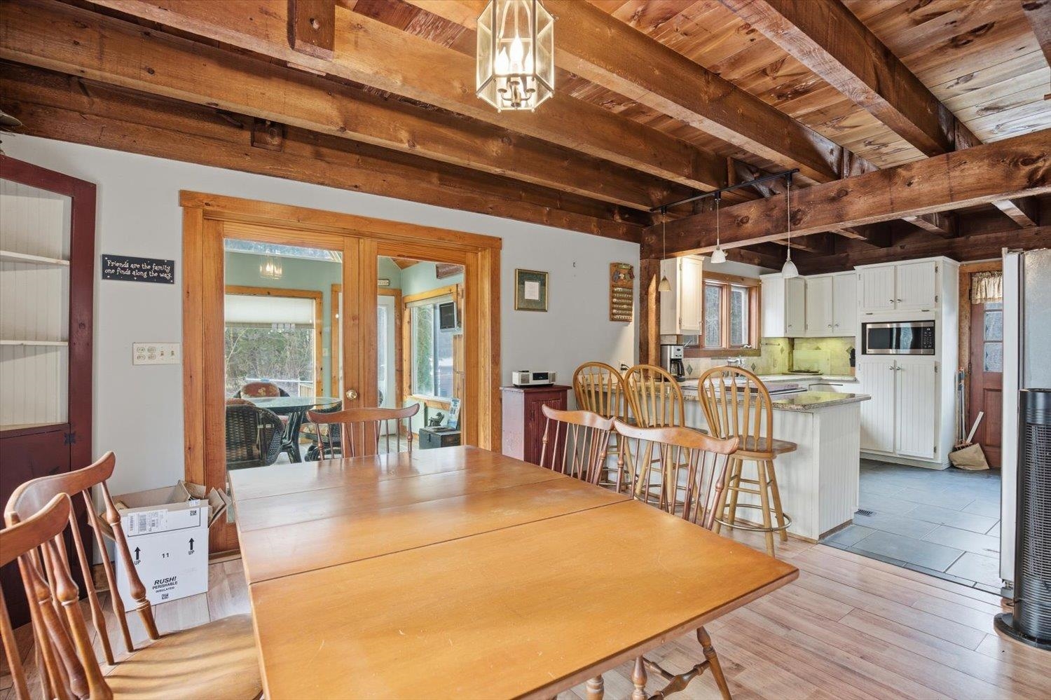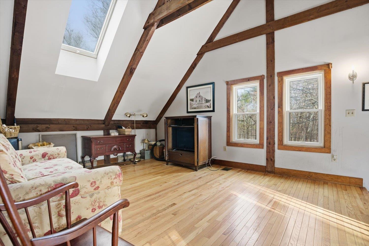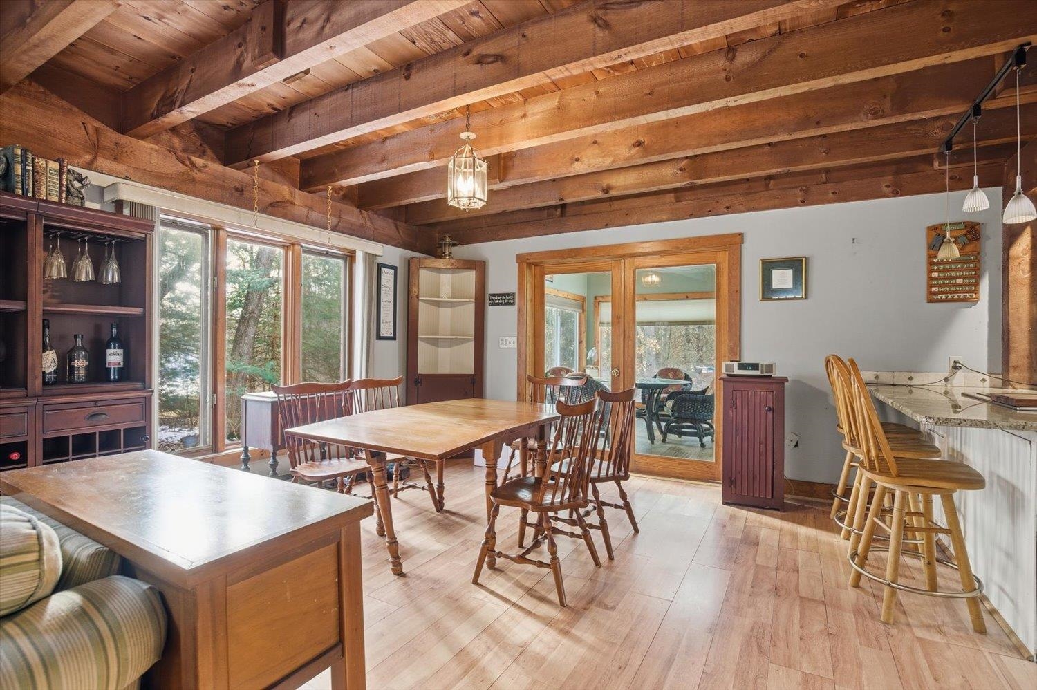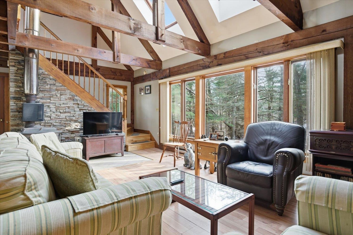 Nestled in a serene wooded subdivision this post and beam Cape Style home blends rustic charm with space for relaxation and entertaining. Exposed beams and skylights fill the interior with natural light. Hardwood floors throughout with an open interior design, updated Kitchen with granite countertops and stainless dishwasher and refrigerator. New furnace and central air in 2024. Sunroom overlooks the backyard with you in-ground gunite pool -perfect for enjoying all Seasons.