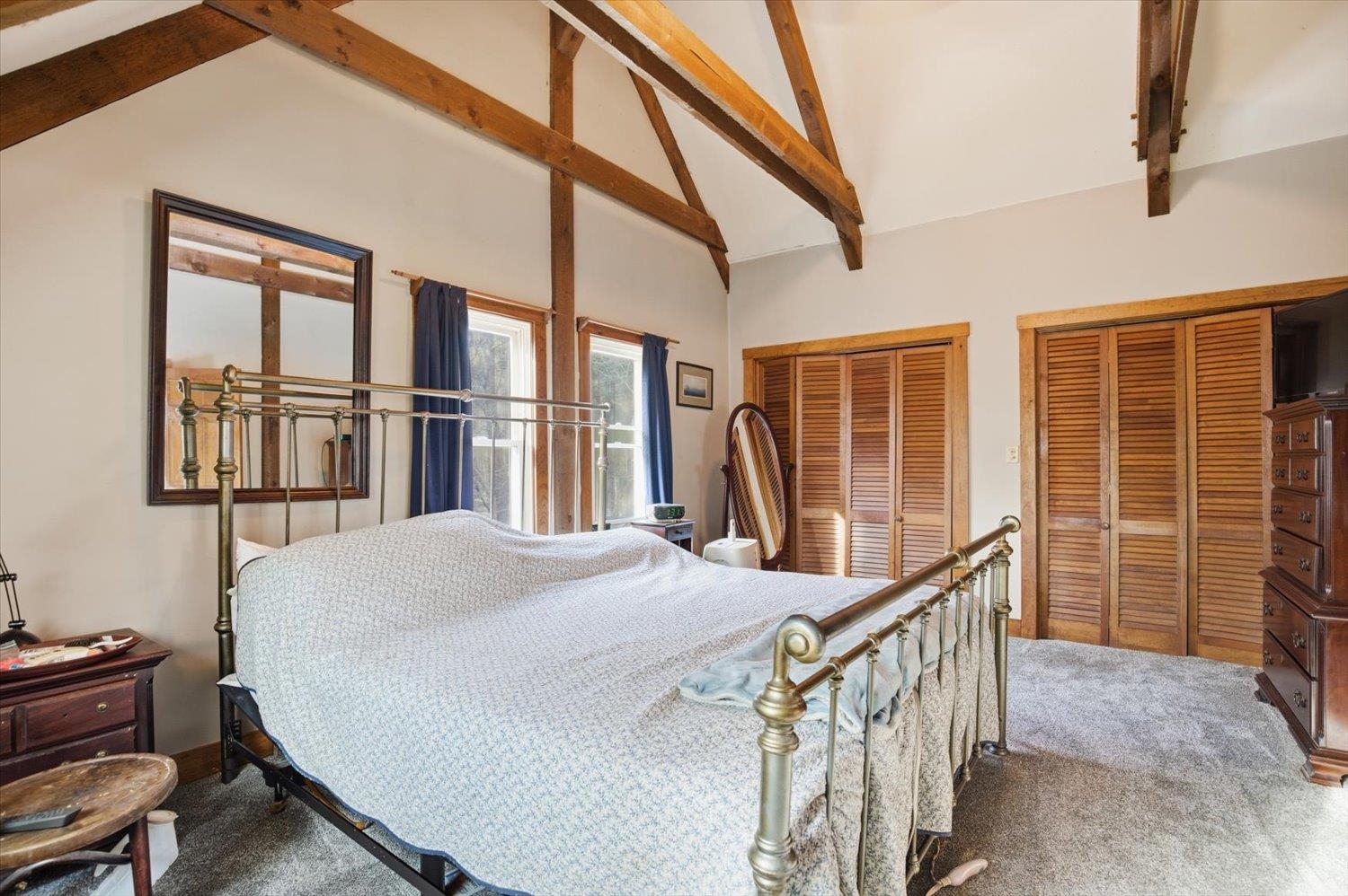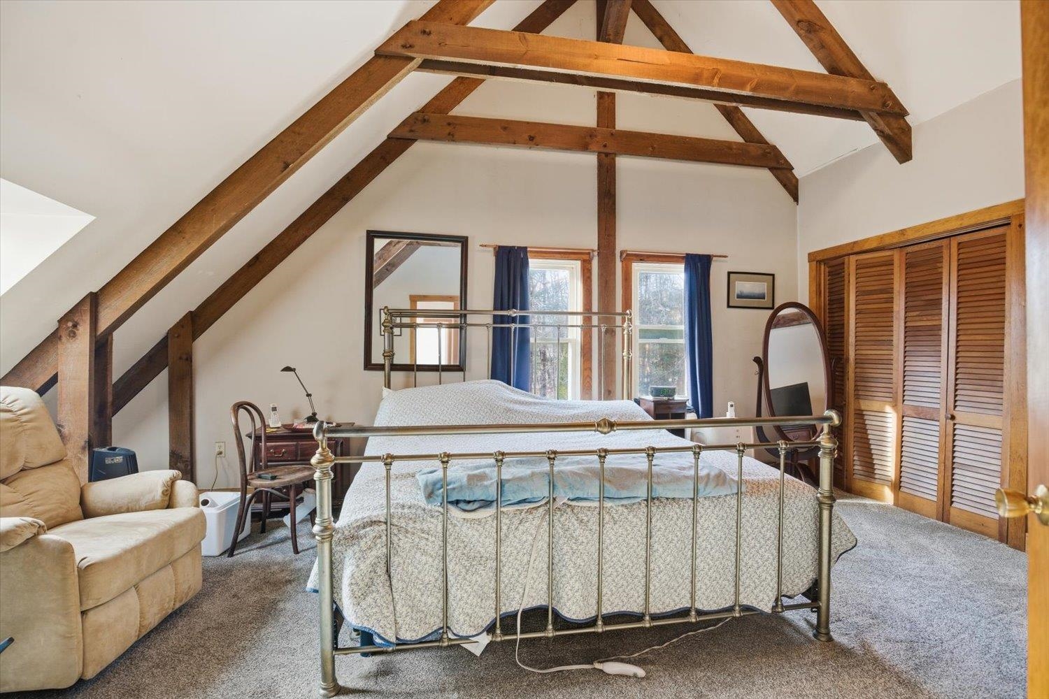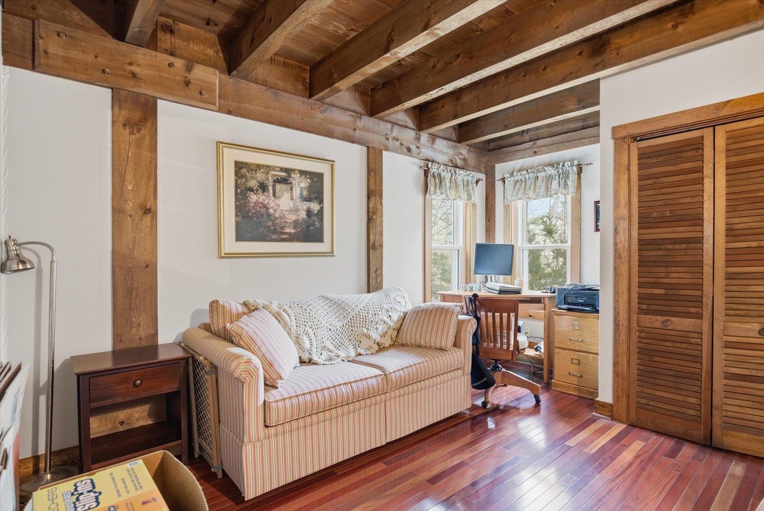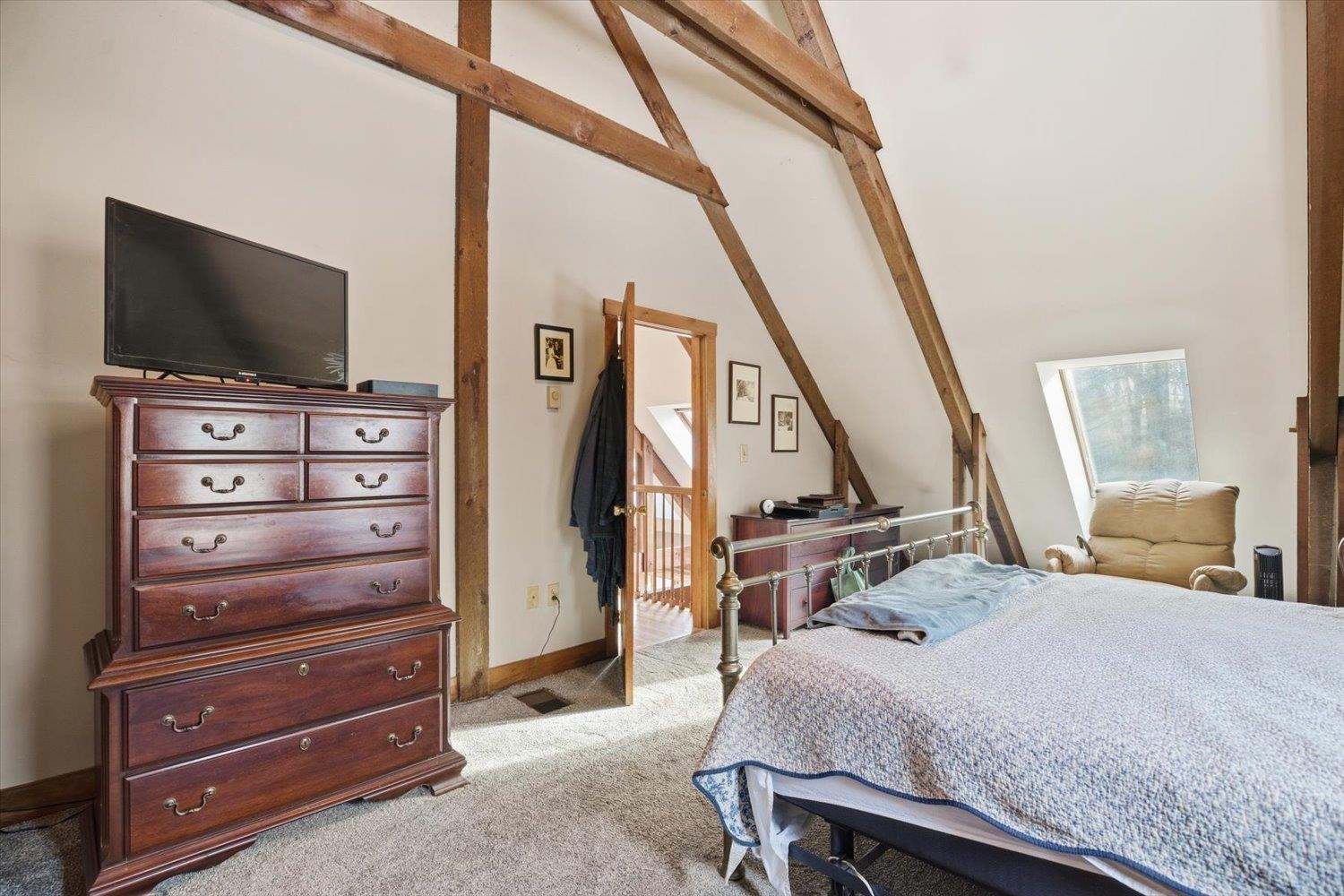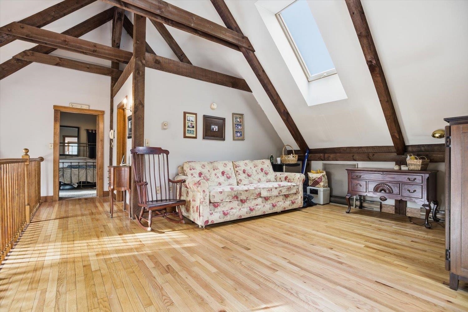 Nestled in a serene wooded subdivision this post and beam Cape Style home blends rustic charm with space for relaxation and entertaining. Exposed beams and skylights fill the interior with natural light. Hardwood floors throughout with an open interior design, updated Kitchen with granite countertops and stainless dishwasher and refrigerator. New furnace and central air in 2024. Sunroom overlooks the backyard with you in-ground gunite pool -perfect for enjoying all Seasons.