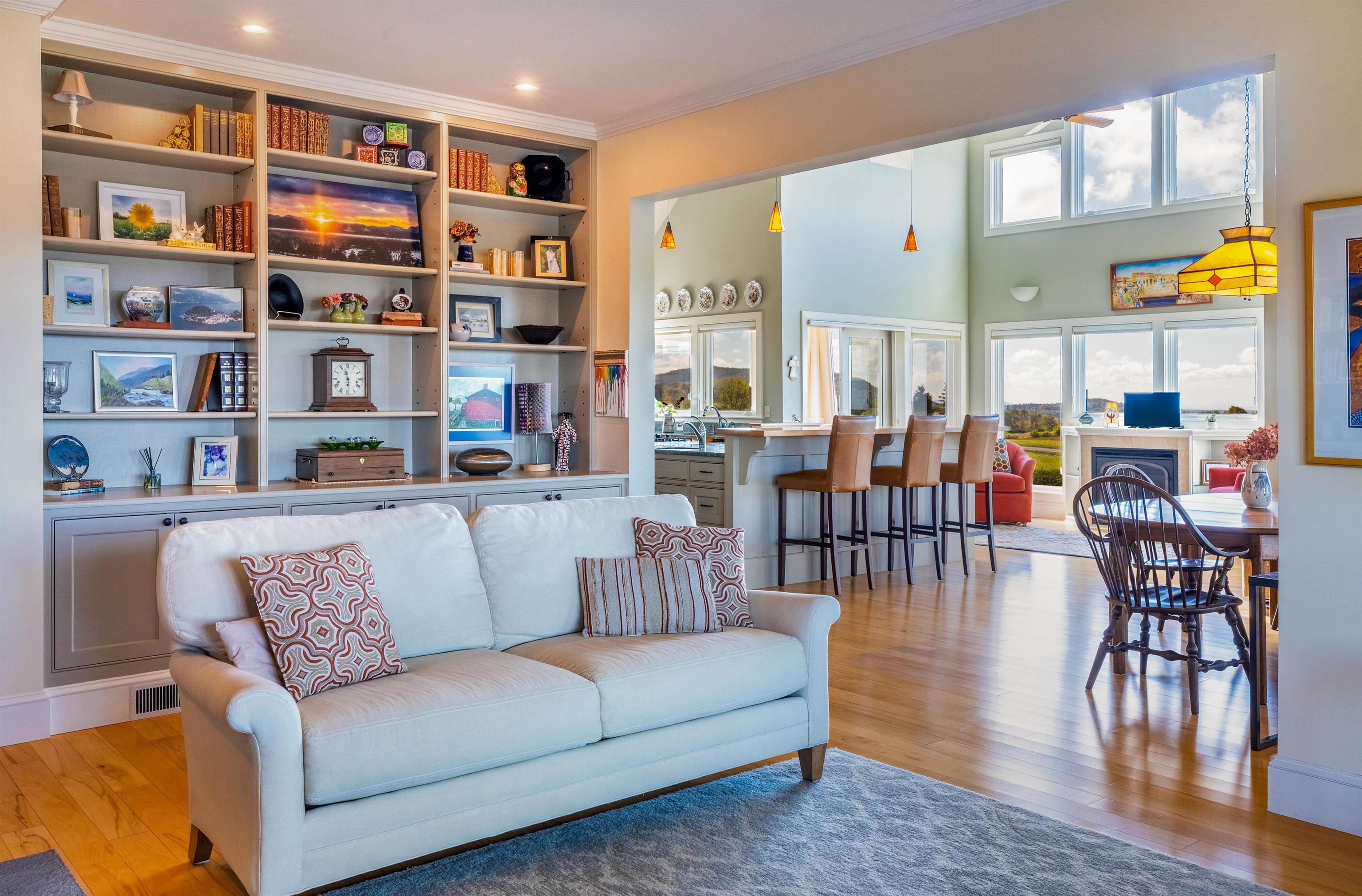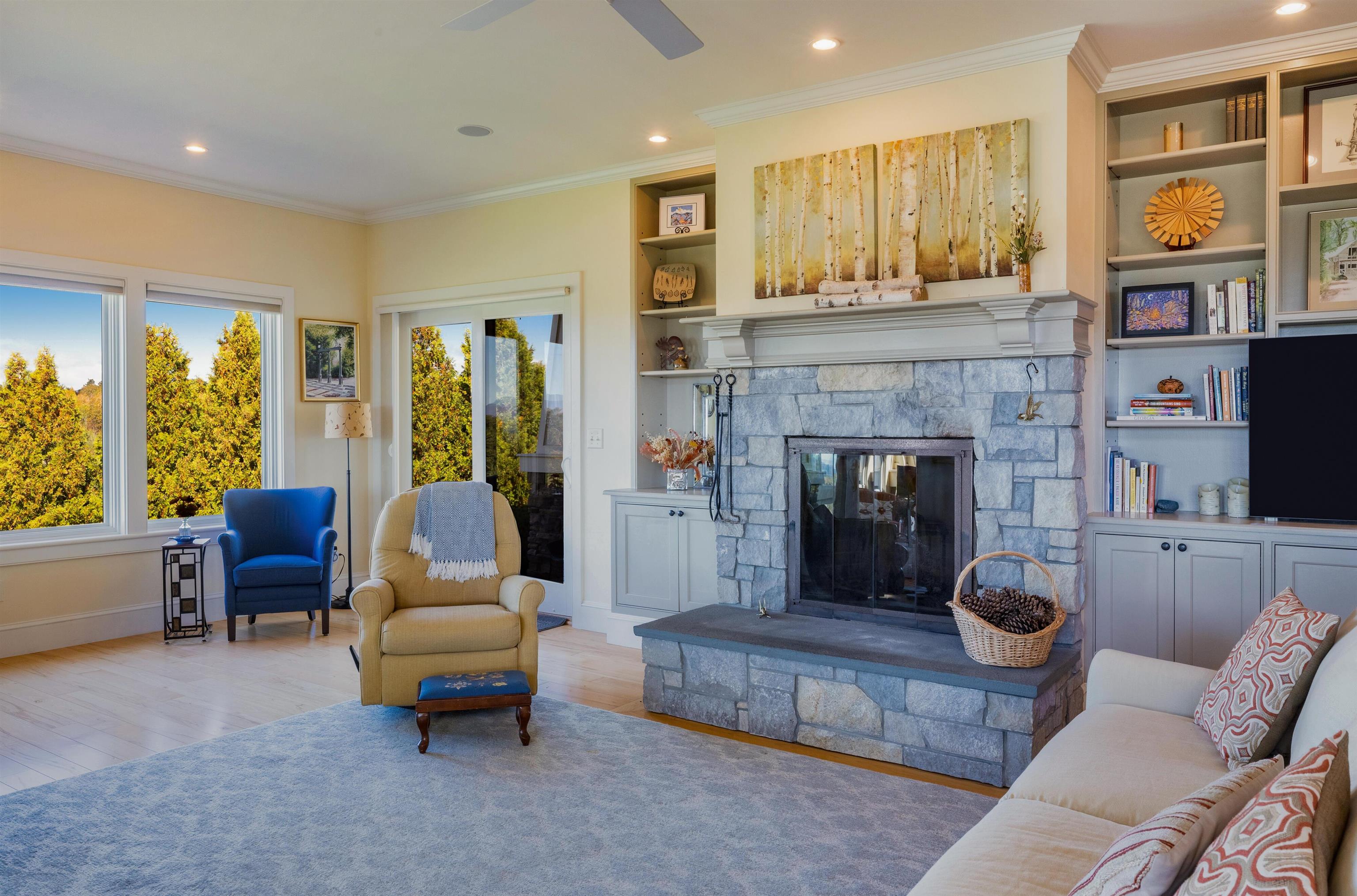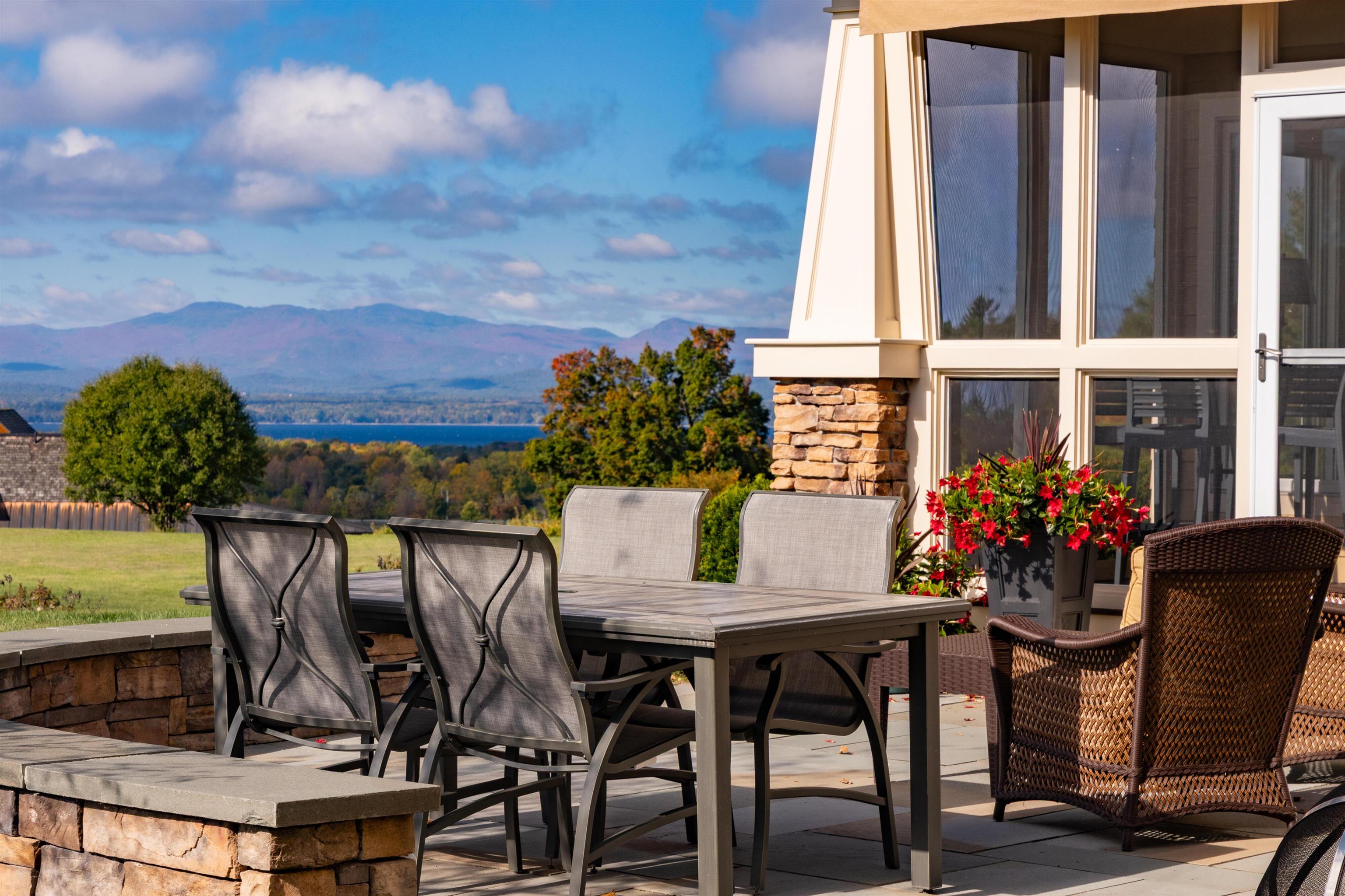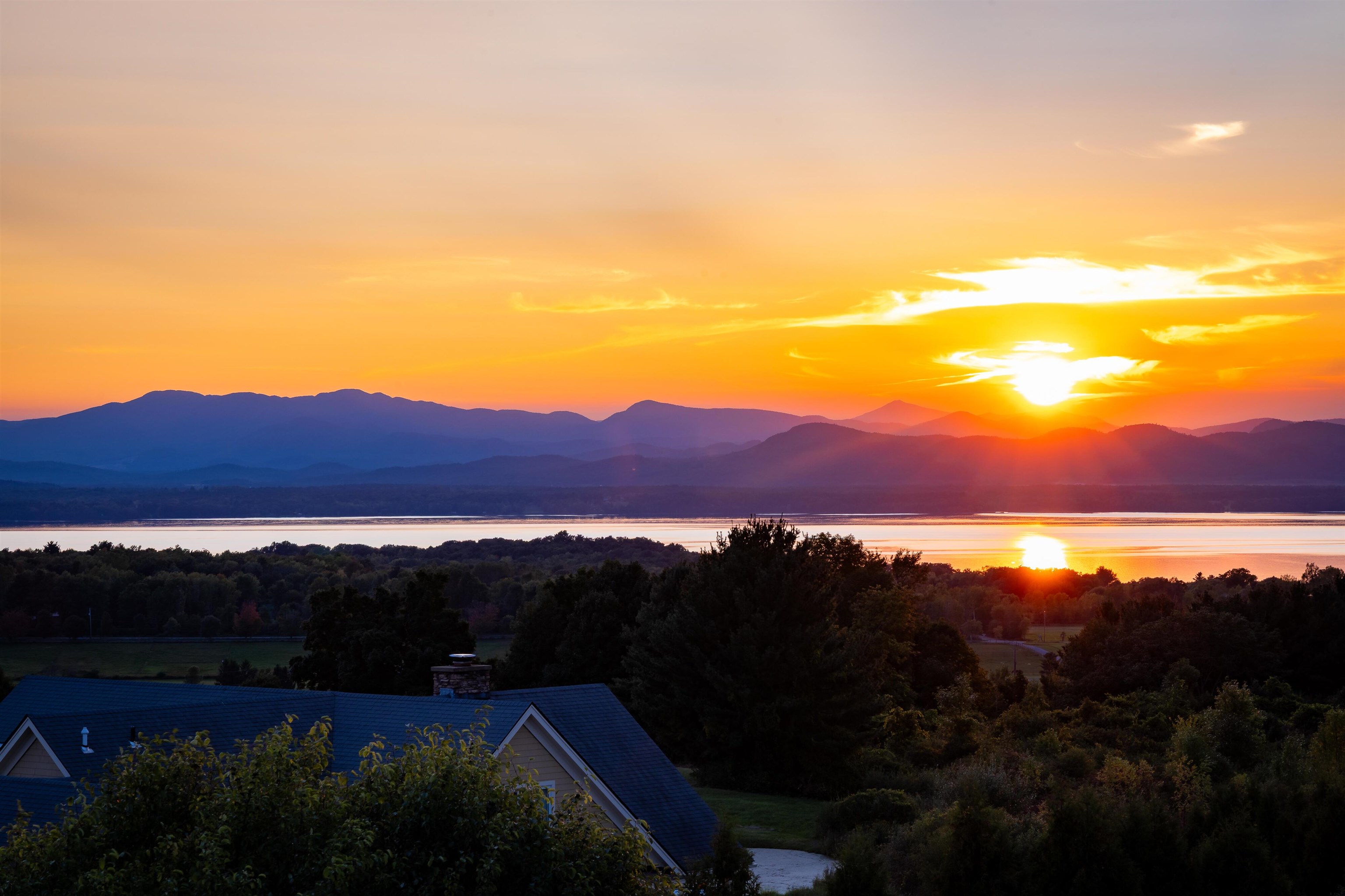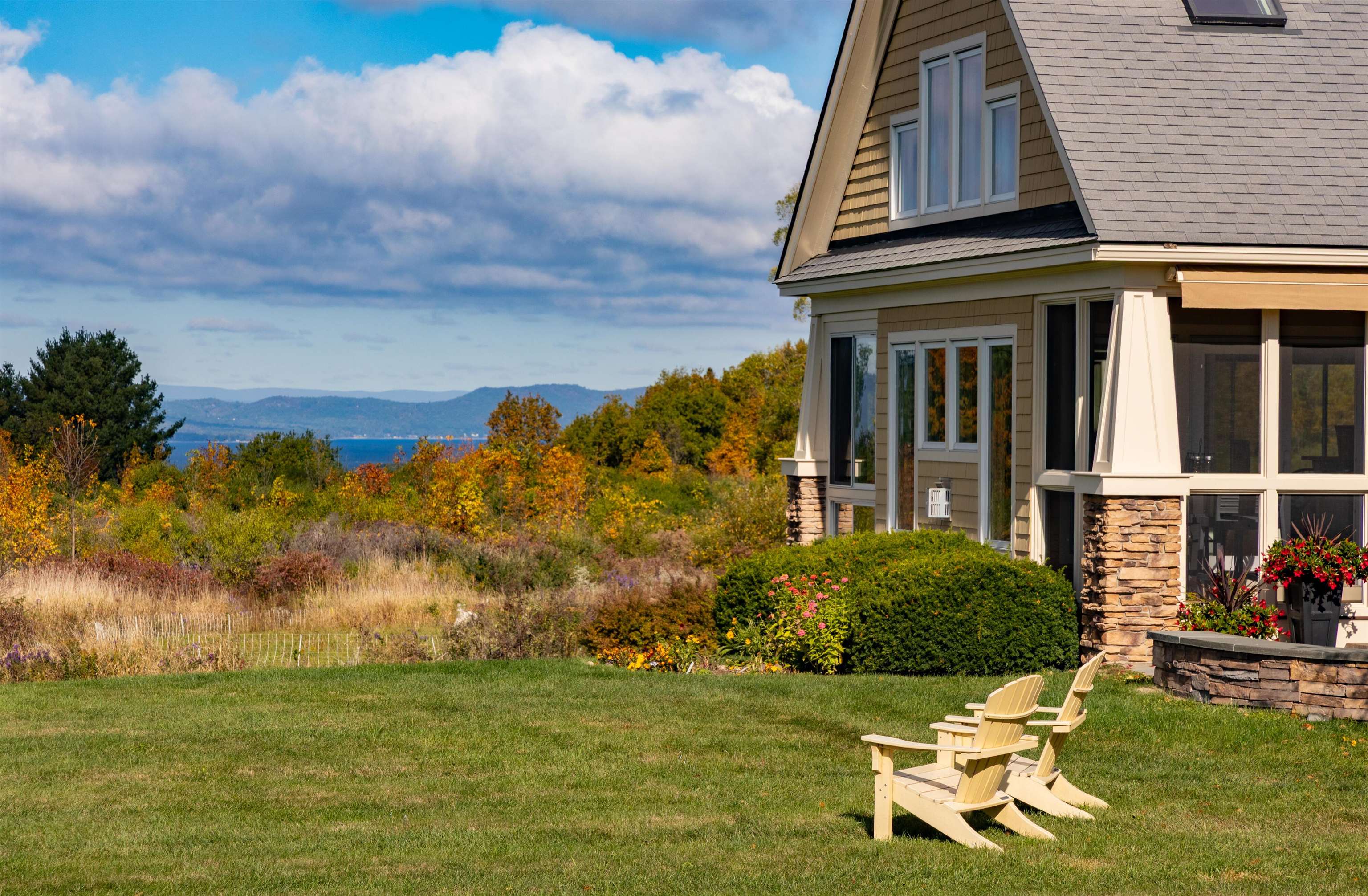 Occupying a private end-lot setting on 3. 03± acres, this three-bedroom shingle-style home offers expansive views of Lake Champlain and the Adirondack Mountains. Abutting over 50 acres of conserved land with a protected view easement, the setting ensures lasting privacy and openness. Built in 2006, the residence features an open kitchen and living area with expansive windows, a heated sunroom, main-level primary suite and home office, and thoughtfully landscaped grounds with stone walls, and a large bluestone patio oriented toward the lake. Located approximately 25 minutes from Burlington, the property combines exceptional views, privacy, and convenience.