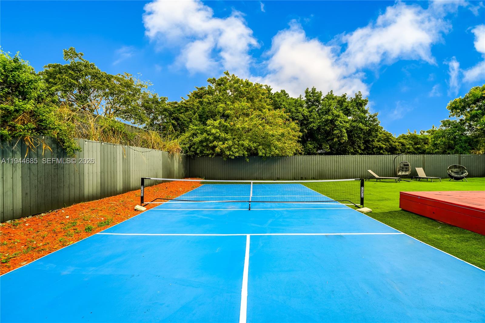 The fully fenced backyard is an entertainer’s paradise, complete with a large pool and wood deck, tennis/basketball court, patio, and lush green space.