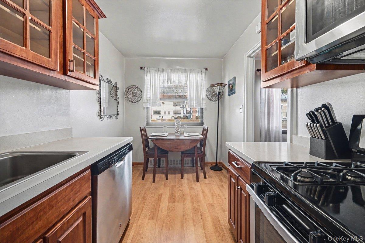 One-unit co-op featuring 1 bedroom and 1 full bathroom, offering a practical and comfortable layout with a defined living room, eat-in kitchen, and generous bedroom storage. The home showcases hardwood floors, ample natural light, and well-proportioned rooms that support everyday living and easy furnishing. Located in a well-maintained building, this residence does not include a basement. Conveniently positioned near Jewel Avenue shopping, Queens Boulevard retail, and nearby supermarkets, with easy access to public transportation including local bus lines and nearby subway connections, making commuting and daily errands straightforward and efficient.