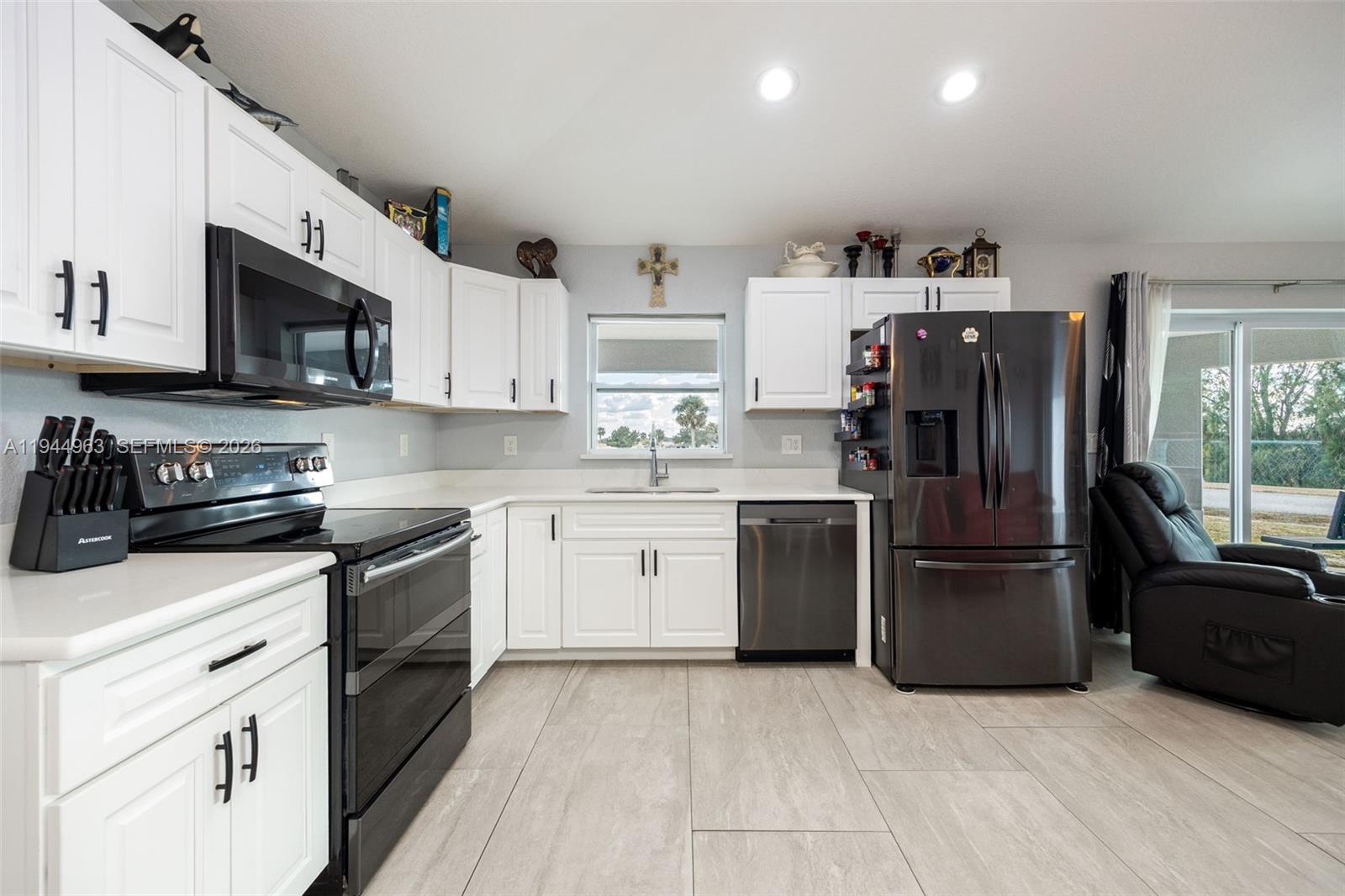 Enjoy beautiful Caloosahatchee River views from your living room and front porch, with convenient access to the nearby boat ramp—without the expense of riverfront ownership. Built in 2021, this home features oversized tile flooring, a metal roof, and upgraded impact windows and doors, all designed to maximize comfort, durability, and the spectacular water views. Located on a spacious corner . 46+/- acre lot, in the Ortona community, just a short walk to the Ortona Locks, fishing dock and boat ramp.