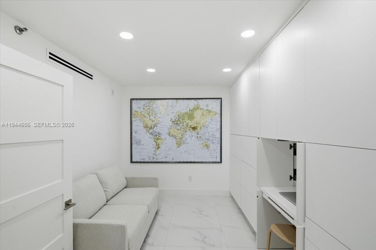 The primary suite includes a private en-suite bath and walk-in closet. On the opposite side, the second bedroom offers its own walk-in closet and full bathroom, while the third bedroom is a true, generously sized bedroom, featuring an entire wall of built-in storage and an integrated desk/laptop station for added functionality.
