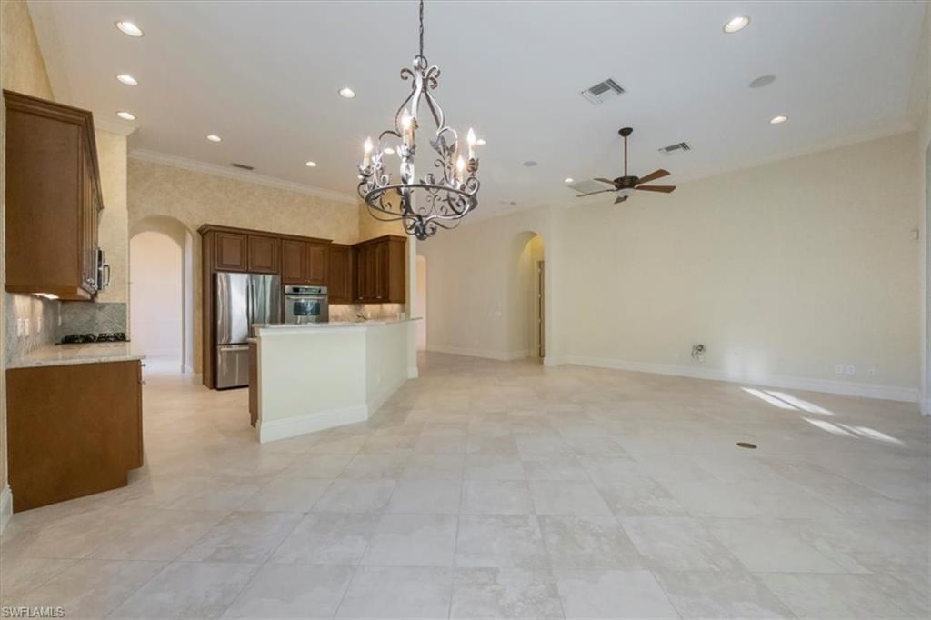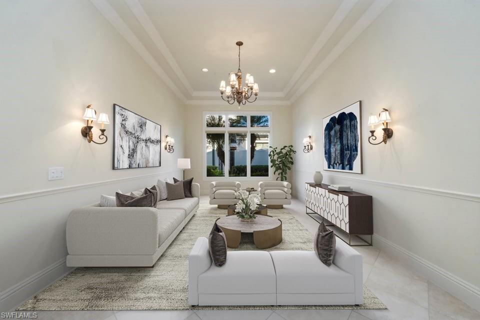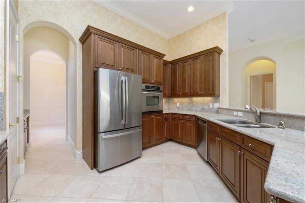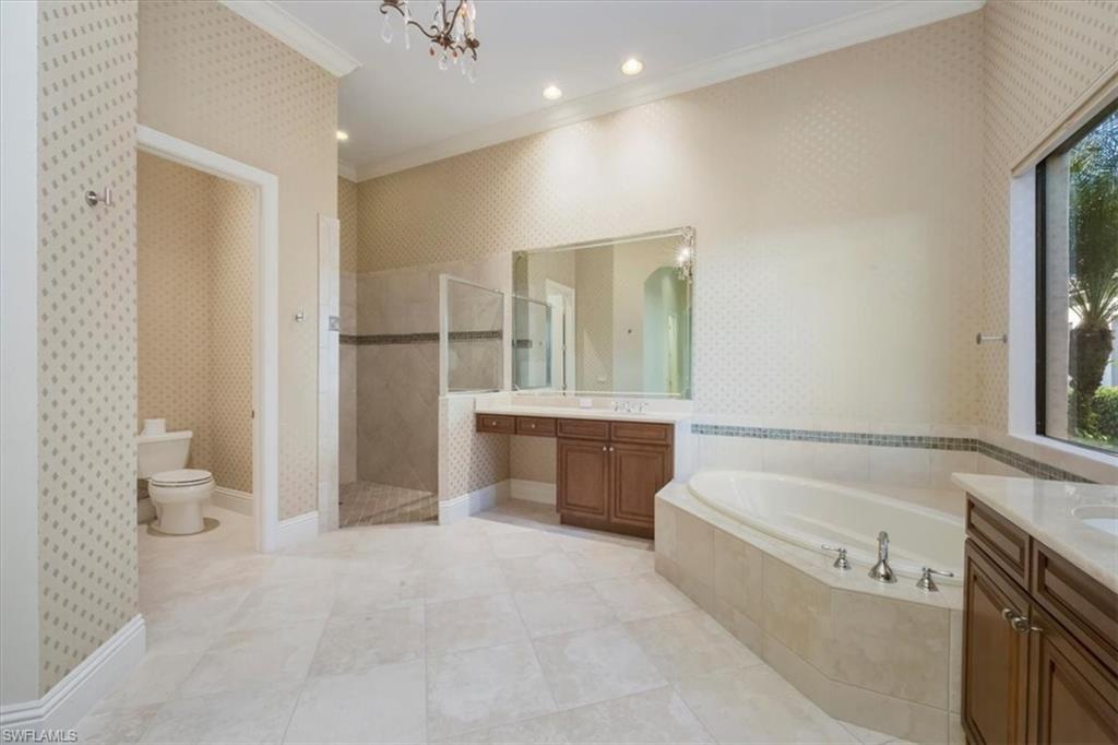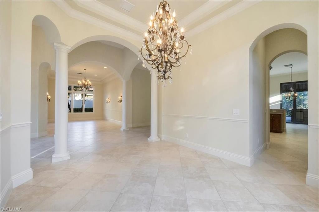 This exceptional value-added price per square foot single-family villa in Mediterra, offers remarkable character, charm, and lifestyle opportunity. Built by Taylor Morrison, the residence features classic stucco exterior finishes with stacked stone accents, a gated front courtyard with double-door entry, split garages, and lush, mature landscaping. Inside, soaring ceilings and neutral tile set on the diagonal enhance the main living areas, complemented by extensive millwork, window casements and banding, intricate ceiling details, and abundant designer lighting including chandeliers, sconces, and recessed fixtures. The gourmet kitchen is appointed with granite countertops, stone backsplash, GE appliances, natural gas cooktop, and a separate butler’s pantry with wet bar, cabinetry, and wine cooler. Dining options are plentiful with a large breakfast bar, informal nook, formal dining area, and outdoor dining. Expansive sliding doors open to a brick-paver covered lanai with upgraded summer kitchen featuring a natural gas built-in grill, outdoor beverage refrigerator, sink, granite counters, and storage, all overlooking the screened pool area with added awnings for shade. The private rear yard offers additional fenced space ideal for pets, gardening, or play, along with excellent privacy. The owner’s suite serves as a peaceful retreat with lanai access, dual walk-in closets, and a spacious en-suite bath with oversized vanities, makeup area, soaking tub, walk-in shower, private water closet, and neutral finishes. Two additional guest suites offer en-suite baths, generous closets, recessed lighting, and ceiling fans, while a separate den or office features hardwood floors, crown molding, and a flexible layout. Located within the prestigious Mediterra Golf & Country Club, residents enjoy resort-style living. Depending on your membership with Mediterra the opportunities are plentiful. 2 eighteen hole Tom Fazio–designed championship golf courses, driving range, training golf facility, tennis, pickleball, bocce, fitness and wellness center, scenic sidewalks, refined dining, and the newly renovated private gated Mediterra Beach Club on the beach features dining, bar service, pool, sundeck, and full cabana beach service, Mediterra is all conveniently close to Naples' dining, shopping, beaches, and RSW International Airport.