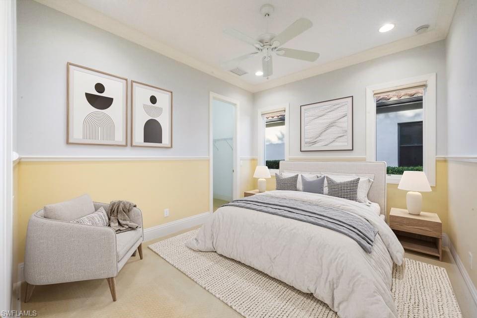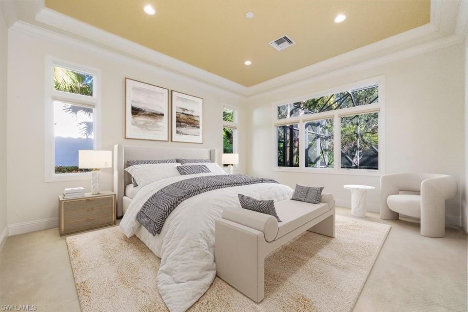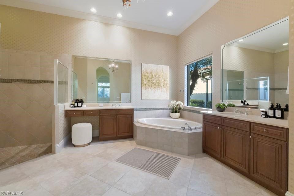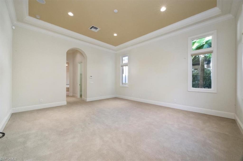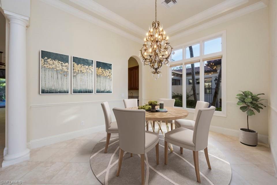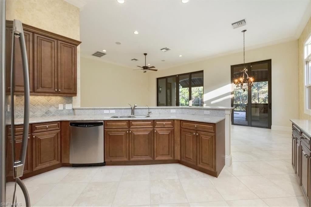 This exceptional value-added price per square foot single-family villa in Mediterra, offers remarkable character, charm, and lifestyle opportunity. Built by Taylor Morrison, the residence features classic stucco exterior finishes with stacked stone accents, a gated front courtyard with double-door entry, split garages, and lush, mature landscaping. Inside, soaring ceilings and neutral tile set on the diagonal enhance the main living areas, complemented by extensive millwork, window casements and banding, intricate ceiling details, and abundant designer lighting including chandeliers, sconces, and recessed fixtures. The gourmet kitchen is appointed with granite countertops, stone backsplash, GE appliances, natural gas cooktop, and a separate butler’s pantry with wet bar, cabinetry, and wine cooler. Dining options are plentiful with a large breakfast bar, informal nook, formal dining area, and outdoor dining. Expansive sliding doors open to a brick-paver covered lanai with upgraded summer kitchen featuring a natural gas built-in grill, outdoor beverage refrigerator, sink, granite counters, and storage, all overlooking the screened pool area with added awnings for shade. The private rear yard offers additional fenced space ideal for pets, gardening, or play, along with excellent privacy. The owner’s suite serves as a peaceful retreat with lanai access, dual walk-in closets, and a spacious en-suite bath with oversized vanities, makeup area, soaking tub, walk-in shower, private water closet, and neutral finishes. Two additional guest suites offer en-suite baths, generous closets, recessed lighting, and ceiling fans, while a separate den or office features hardwood floors, crown molding, and a flexible layout. Located within the prestigious Mediterra Golf & Country Club, residents enjoy resort-style living. Depending on your membership with Mediterra the opportunities are plentiful. 2 eighteen hole Tom Fazio–designed championship golf courses, driving range, training golf facility, tennis, pickleball, bocce, fitness and wellness center, scenic sidewalks, refined dining, and the newly renovated private gated Mediterra Beach Club on the beach features dining, bar service, pool, sundeck, and full cabana beach service, Mediterra is all conveniently close to Naples' dining, shopping, beaches, and RSW International Airport.