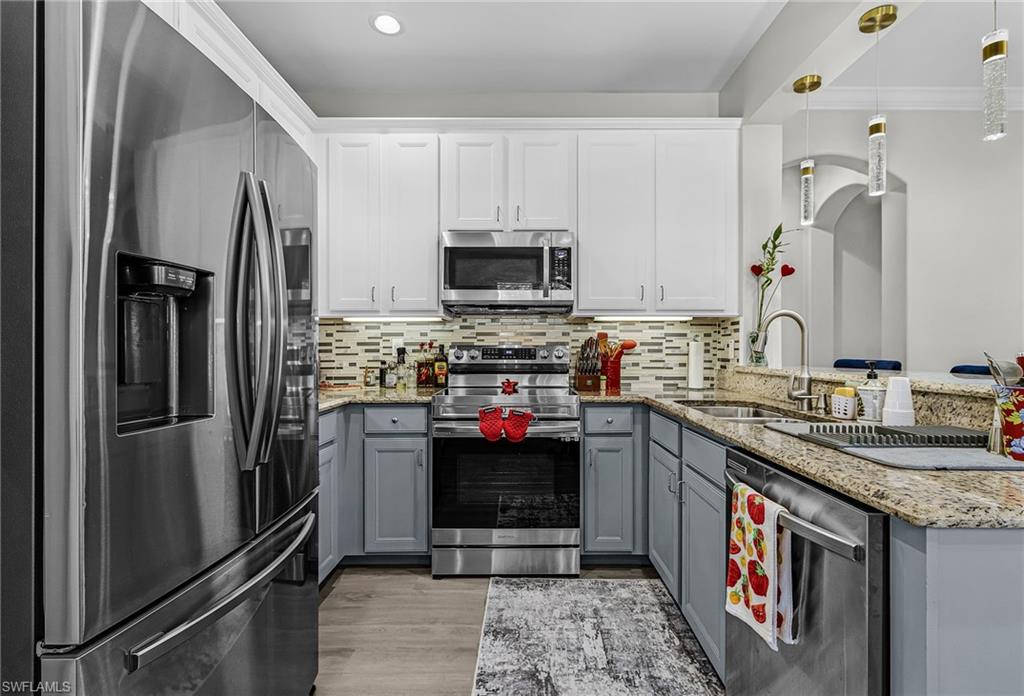 Better than new! Beautifully maintained and recently renovated 2-bedroom + den, 2. 5 bath two story townhouse condo located in the desirable gated community of Artesia Naples. This spacious residence features an open great-room layout, high ceilings, neutral finishes, and abundant natural light. The kitchen offers granite countertops, stainless steel appliances, and generous cabinet storage. The primary suite includes dual closets and an en-suite bath with walk-in shower and double vanities. A private screened lanai (custom upgrade) overlooks a peaceful landscaped area, perfect for relaxing or entertaining.
