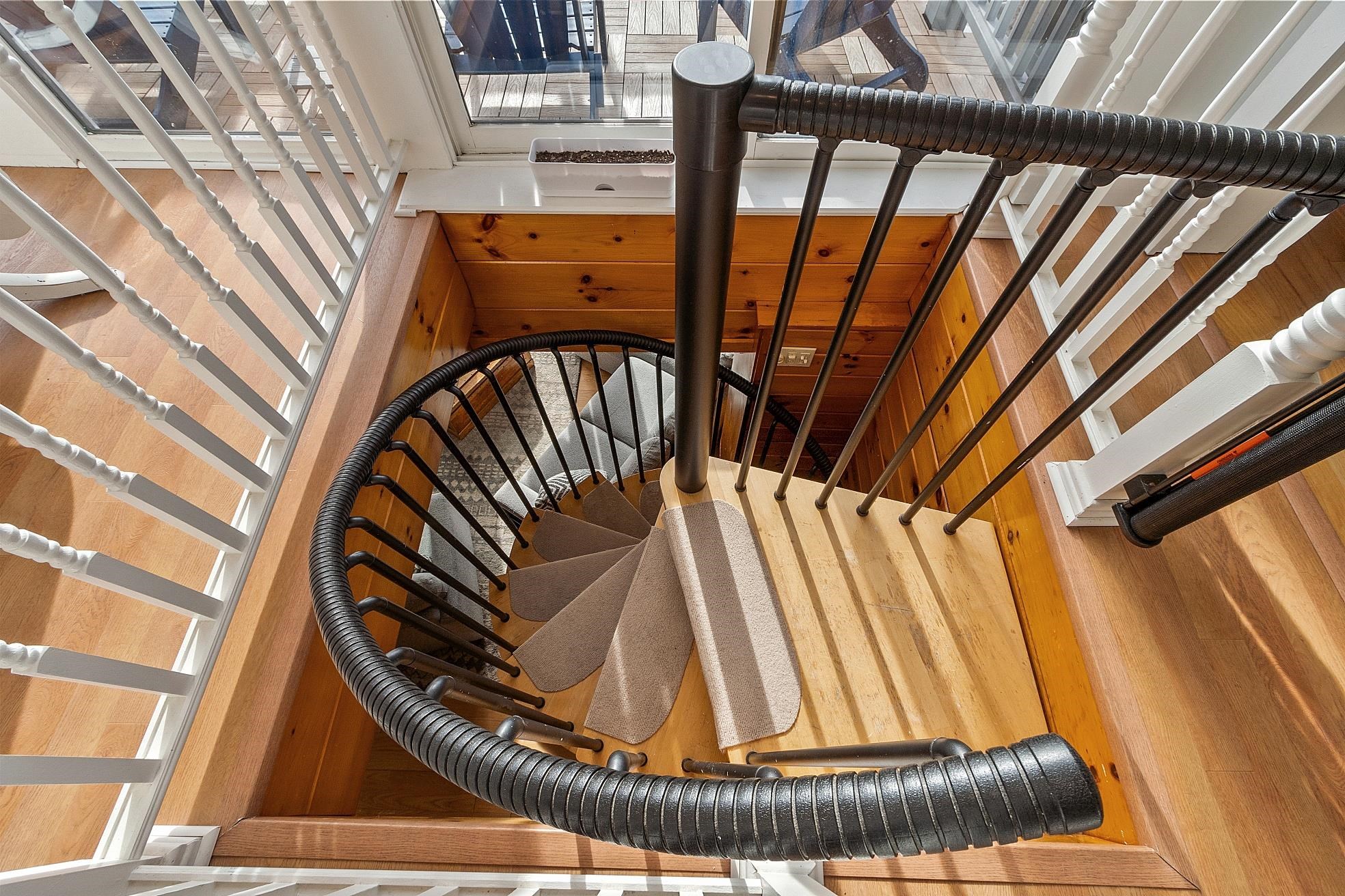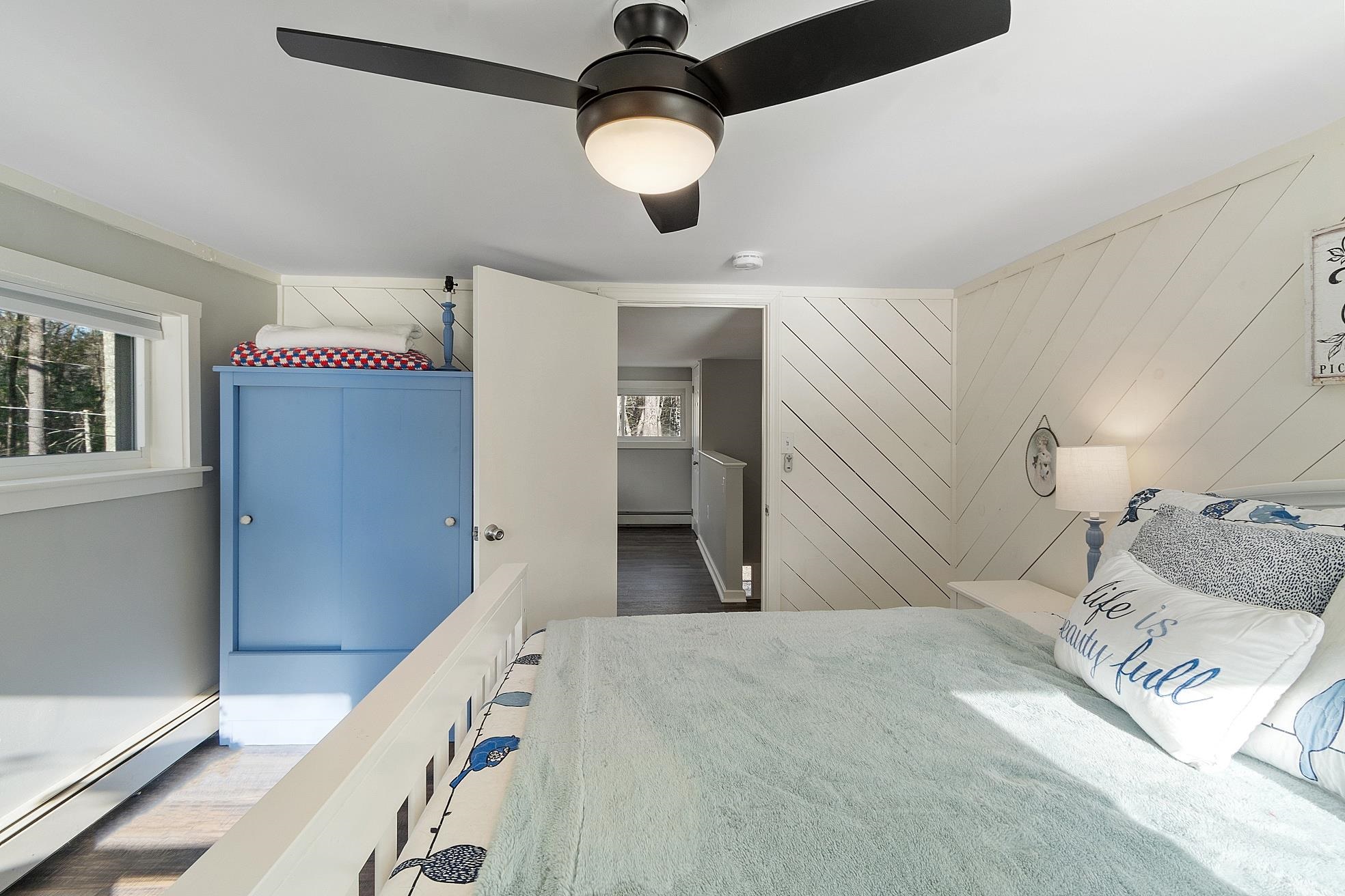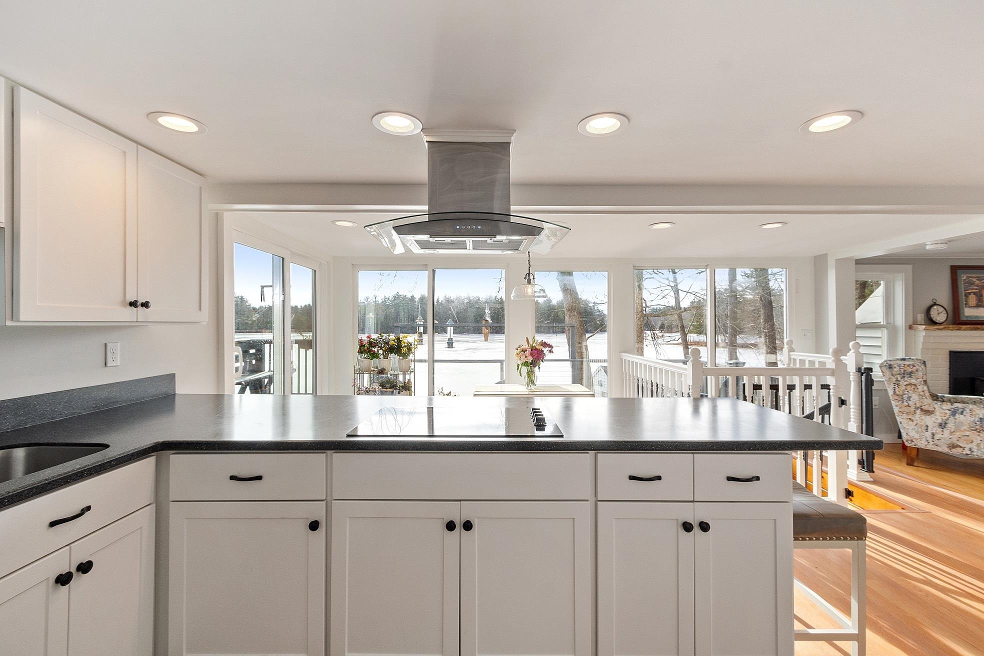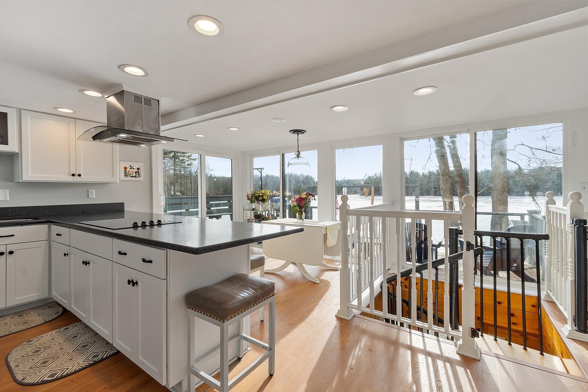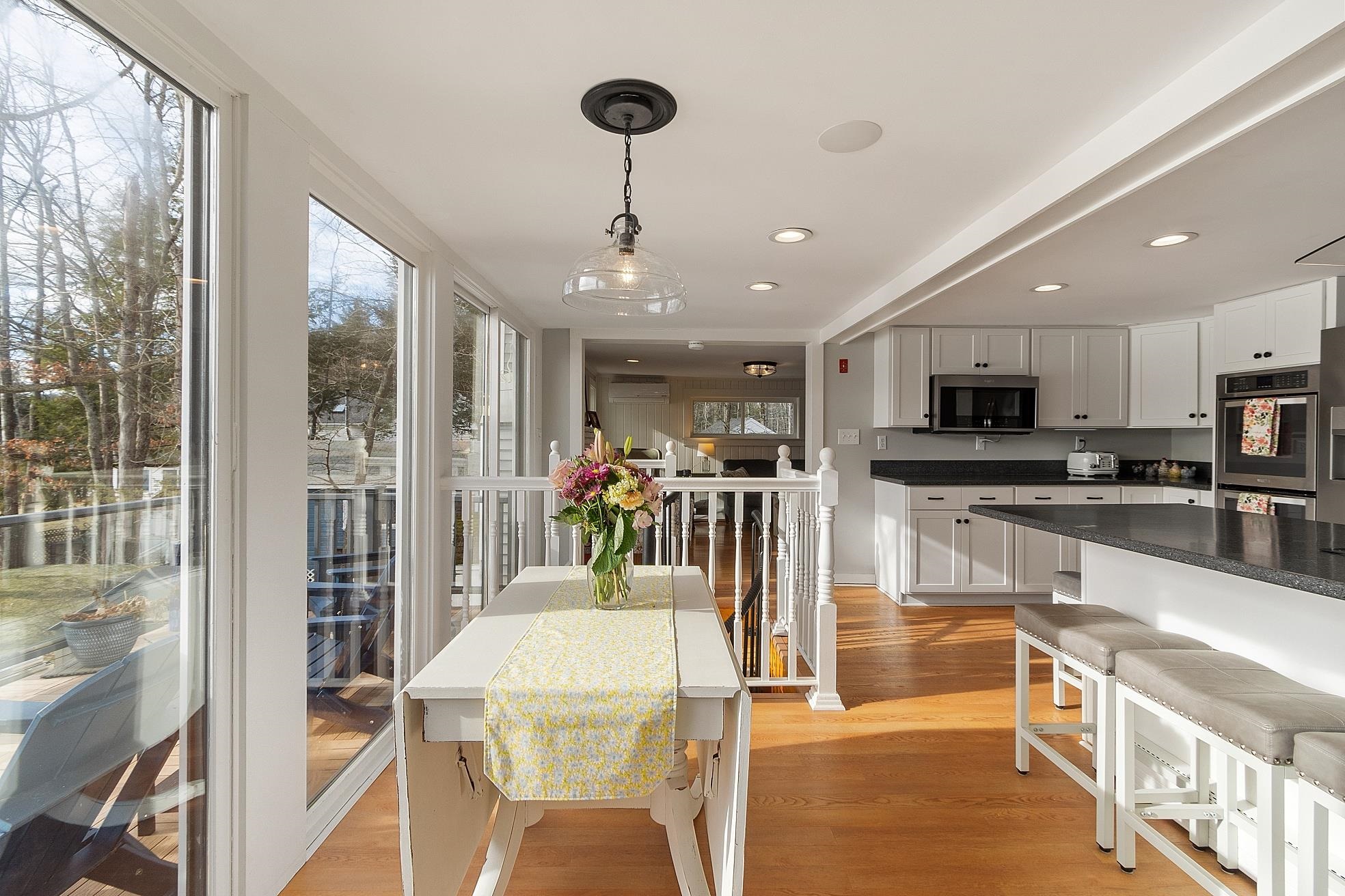 Wake up to shimmering water views and the peaceful rhythm of life on Powwow Pond. Tucked along the waterfront, this sun-filled home offers a welcoming retreat where every season brings something special. The main level centers around a beautifully renovated kitchen where wall-to-ceiling windows frame the pond and fill the space with natural light - perfect for slow mornings, birdwatching, and gathering. A full bath with laundry adds convenience, while the front-to-back family room invites you to unwind by the wood-burning stove, creating the perfect setting for cozy winter evenings. Upstairs, two comfortable bedrooms await, including a serene primary en suite designed for relaxation with a double vanity, freestanding soaking tub, walk-in shower, and walk-in closet. A newly added wall of windows brings the outdoors in, offering calming water views year-round, while mini-split systems provide efficient air conditioning for warm summer days. A charming flex space on this level works beautifully as a reading nook, home office, or daybed area. Down the spiral staircase, the lower level surprises with a wall of glass and sliders, a spacious recreation room, half bath, extra storage, and direct access to the one-car garage. Step outside to the wraparound deck, where mornings begin with coffee at sunrise and evenings end watching the sun dip over the water. The brand-new metal dock completes the experience, offering easy access for boating, fishing, and enjoying life right on the pond. From summer days on the water to ice fishing and snowmobiling in winter, this home delivers a true four-season waterfront lifestyle - a special place to slow down, settle in, and make lasting memories.