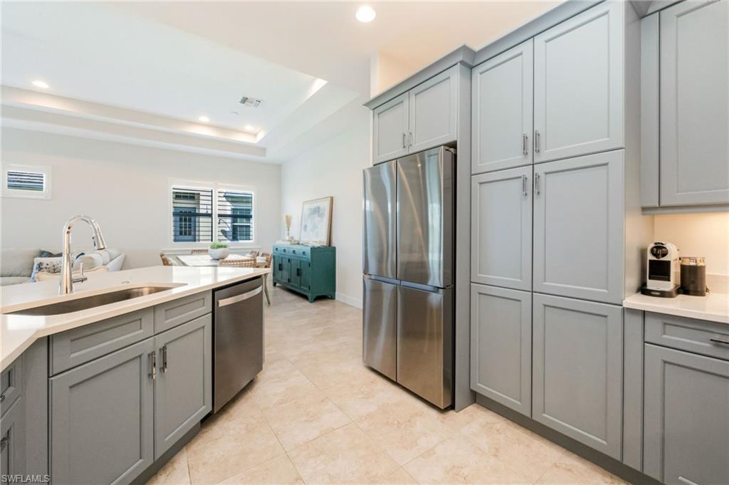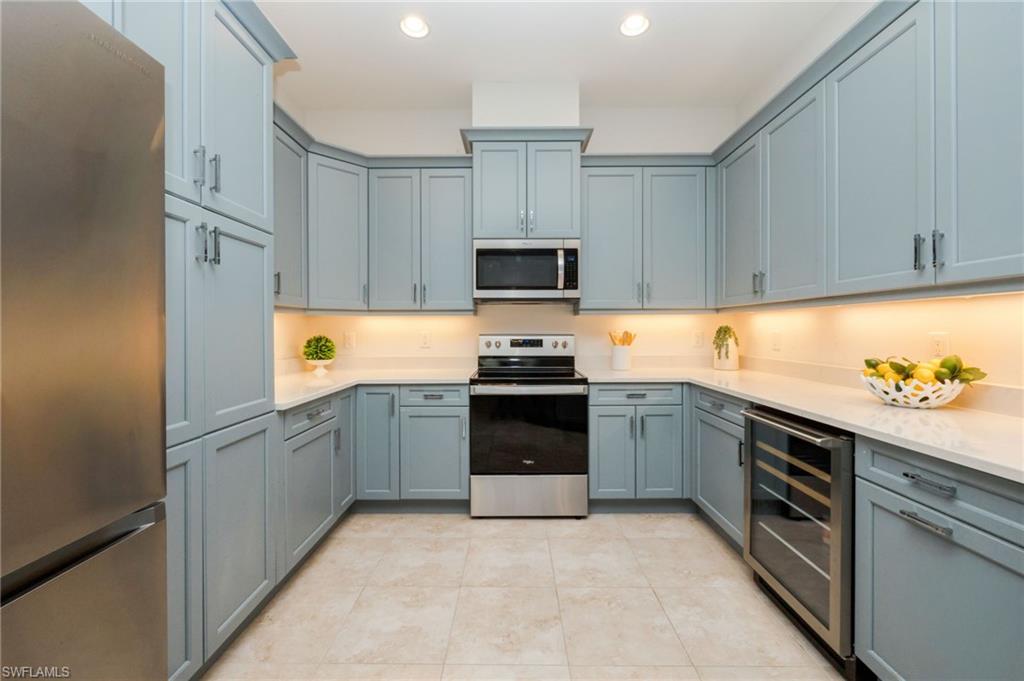The welcoming foyer features tray ceilings and a direct line of sight to the preserve beyond. The open-concept kitchen is equipped with stainless steel appliances, coastal-inspired blue cabinetry, and flows seamlessly into the main living area. Three-panel sliding glass doors from the great room open to the private lanai, creating an ideal indoor-outdoor connection and showcasing the tranquil preserve setting.