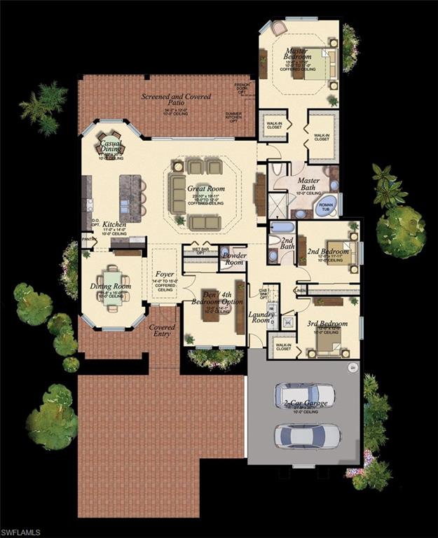 This Bellagio estate home is designed for effortless entertaining and relaxed Southwest Florida living, offering generous space, refined finishes, and exceptional outdoor amenities. A grand 14-foot entry foyer with coffered ceiling sets the tone, opening to chiseled-edge marble flooring that flows throughout the home. The expansive great room and formal dining area create a welcoming environment for both everyday living and hosting guests. The chef’s kitchen is a true centerpiece, featuring an oversized island, granite countertops, upgraded 42-inch glazed cream cabinetry, ambient lighting, and stainless-steel LG appliances, including a new LG refrigerator. Four well-proportioned bedrooms provide versatility, including one set behind elegant glass French doors that would make an ideal home office or den. The owner’s suite offers a peaceful retreat with dual custom-finished walk-in closets and a spa-inspired bath with double vanities, soaking tub, and walk-in shower. Additional highlights include crown molding, decorative trim above slider and kitchen windows, plantation shutters, designer lighting, ceiling fans, a laundry room with utility sink and LG washer & dryer, epoxy-finished garage floor, and a newer HVAC system. The home is offered furnished in a relaxed, Tommy Bahama–inspired style, making it ideal as a move-in-ready second home or full-time residence. Step outside to an extra-high screened lanai with a picture window framing a serene lake view. A custom free-form saltwater pool with waterfall feature & sun shelf anchors this private, resort-style retreat. Indoor-outdoor living takes center stage beneath the expansive covered lanai, approximately 34 by 12 feet, offering generous space for both lounging and dining. A Hot Springs hot tub beneath a pergola provides an inviting place to unwind at day’s end, while beyond the lanai, the thoughtfully designed backyard is lushly landscaped for added privacy and tranquility. Electric Storm Smart screens provide protection, privacy, and peace of mind. Quietly situated on a cul-de-sac street and conveniently close to the clubhouse. Riverstone offers a vibrant, vacation-inspired lifestyle for all ages. Located in North Naples, just minutes from I-75 and zoned for "A"-rated schools, the community features a fitness center, social hall, resort-style pool, lap pool, spa, five lighted tennis courts, outdoor basketball and pickleball, a full indoor basketball court, tot lot, children’s water play area, game room, and an activities coordinator; making it easy to meet new friends. Don’t miss your chance to step into the Naples lifestyle. Your dream home awaits, ready to enjoy from the moment you arrive.
