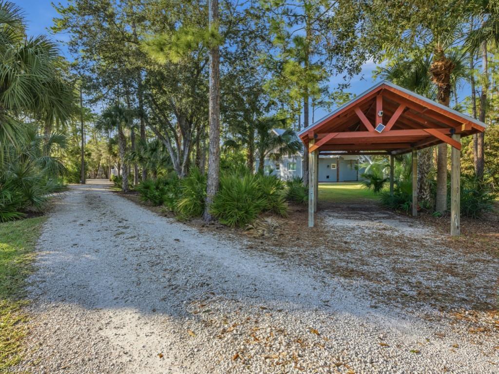 Exceptional opportunity to own 5 acres in Golden Gate Estates with a main home, a beautiful new guest house, and 3 additional buildings. This is the ideal property for a small business owner in need of storage space for equipment and work vehicles, a car collector, or anyone in search of a home with much privacy. The main home is 2299 sq ft of living area and features 3 bedrooms plus a den, 2 baths, a light and bright interior, and new roof in 2022. The newly remodeled kitchen features white cabinetry, white counters, stainless appliances, coffee bar with wine cooler, and a large center island. The master suite is a private retreat with ensuite bath with dual vanities, jetted tub, and walk-in shower. The interior of the home opens to the spacious screened lanai with large pool. The newly constructed guest house (2019) is 899 sq ft of living area and boasts bedroom plus den, bath, fully equipped kitchen with gorgeous finishes, and a screened lanai. Enjoy peace of mind with generators for both homes each with a 500 gallon propane tanks. With 3 outbuildings and additional carport, this home offers unlimited potential. 2 of the outbuildings feature electric service. The grounds feature beautiful natural Florida flora and fauna, creating a tranquil private atmosphere. Enjoy all this while being just minutes to all that Naples has to offer. Do not hesitate to make this rarely available 5 acre estate your peaceful sanctuary.