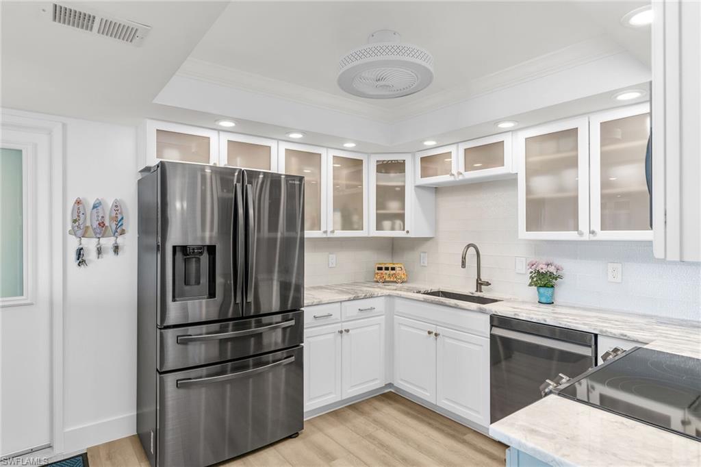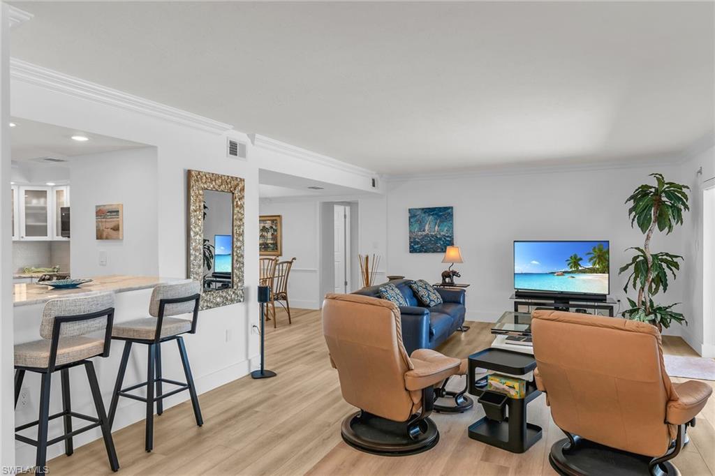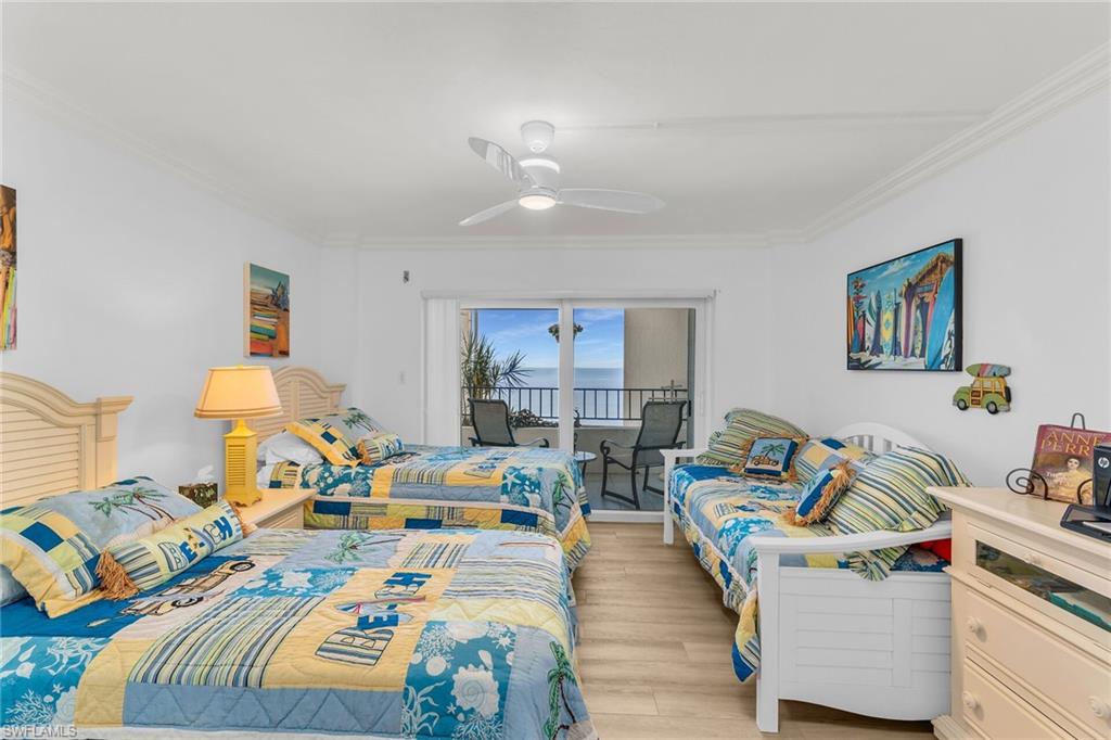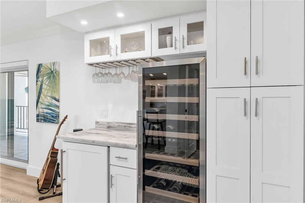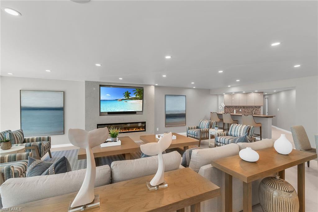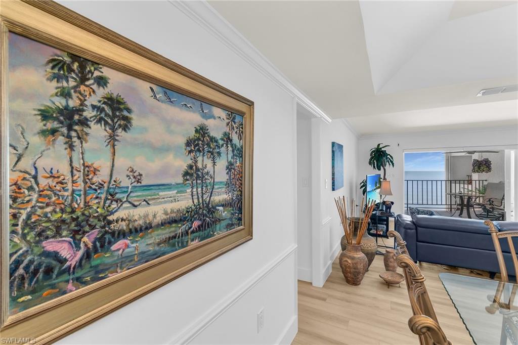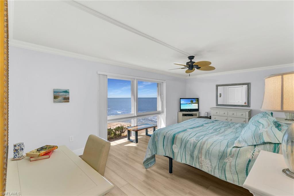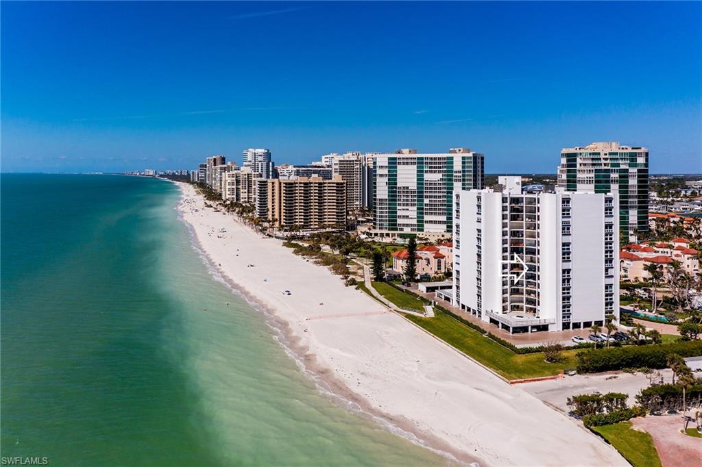 This is your opportunity to own an incredible beachfront residence with unobstructed views of Park Shore beach. This coastal retreat is fully turn-key furnished and completely remastered with an open-concept design, blending coastal contemporary style with modern living functionality. A 300+ square feet covered balcony and multiple floor-to-ceiling impact windows showcase spectacular sunsets and all-day beach vistas. The newly reimagined spaces create an airy, sophisticated ambiance with light Pasadena Oak flooring, remote-controlled blinds, custom bar and entertainment area, a 54-bottle dual-temperature control wine chiller, bar fridge, bar storage, and luxurious fixtures and finishes. The kitchen features high-end Samsung black stainless appliances contrasting beautifully with light quartz countertops and white shaker and glass-front cabinetry. Both baths have been tastefully updated with new cabinetry and countertops. The primary bath is stunning with granite counters and walls and tons of storage. Amenities include a community room and library, fitness room, sauna, bike storage, game room, and an outdoor kitchen area, under-building covered parking and extra storage. Residents have direct access to the beach and the promenade, and nearby Venetian Village shopping and dining.