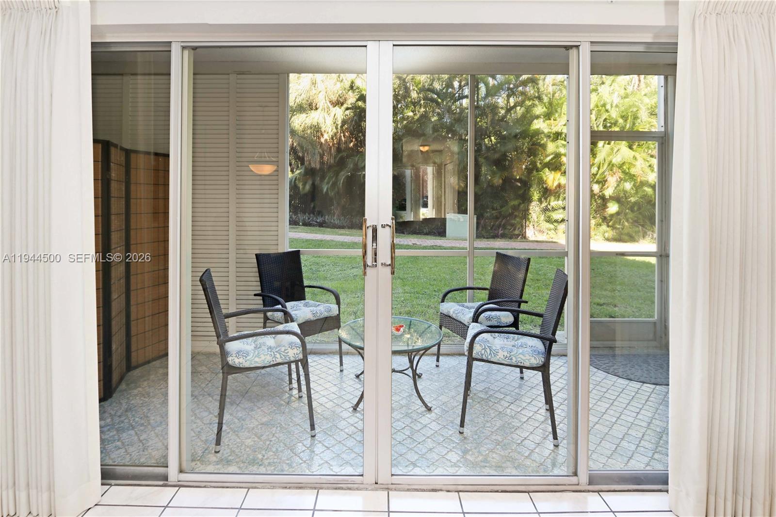 Inside, a welcoming foyer with a double-door closet opens to a spacious living and dining area filled with natural light. Sliding doors lead to a screened patio accessible from both the living room and the primary bedroom, with direct access to the garden and pool area—perfect for enjoying South Florida’s indoor-outdoor living.