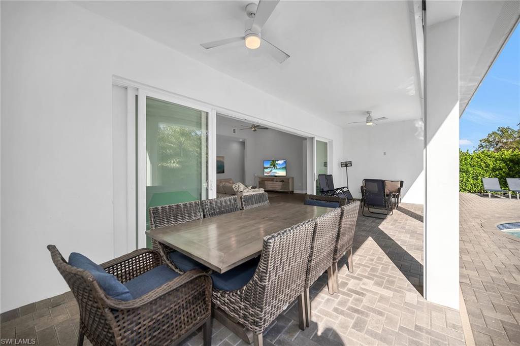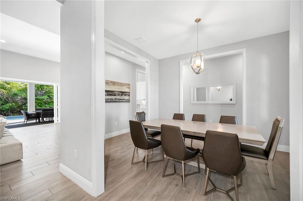 This beautifully designed one-story residence offers an exceptional Marco Island lifestyle, blending space, comfort and seamless indoor-outdoor living. Filled with abundant natural light, the home features a thoughtfully designed floor plan with four bedrooms plus a den, five baths and a two-car garage, all complemented by impact windows and doors for peace of mind. Inside, recessed lighting throughout and wood-look tile flooring create a warm, contemporary feel. The open kitchen is suited for everyday living and entertaining, featuring granite countertops, a tile backsplash, a bar counter with seating, and stainless steel appliances including a dishwasher, range, microwave and refrigerator with icemaker. The kitchen flows effortlessly into the living area, where recessed lighting and a ceiling fan enhance comfort, and glass doors open directly to the lanai. A separate formal dining room provides an elegant space for gatherings and special occasions. The spacious primary suite serves as a private retreat with lanai access, recessed lighting, a ceiling fan, and two walk-in closets. The en-suite bath is well-appointed with dual sink vanities and full-width mirrors, a walk-in shower with glass enclosure, and an enclosed water closet. Guest accommodations are equally impressive, with three generously sized guest bedrooms, each offering a ceiling fan and private en-suite bath. Two guest suites feature walk-in showers with glass enclosures, while the third offers a tub and shower combination. The den, just off the foyer, provides flexibility as a home office, study, or additional sleeping space and includes recessed lighting. Outdoor living is a highlight, with a paver, screened lanai designed for relaxation and entertaining. Enjoy a heated pool and spa on a large outdoor lanai that create a resort-style atmosphere ideal for gatherings or quiet evenings. A well-equipped laundry room includes a top-load washer, front-load dryer, overhead shelving and a utility sink. Notable updates include a pool heater replaced in 2022, a Bosch French door refrigerator added in 2021, and a KitchenAid electric range installed in 2017. Ideally in Marco Island, this home offers convenient access to the island’s beaches, dining and outdoor recreation, making it an outstanding opportunity to enjoy refined coastal living. This property also benefits from an established, active and profitable short-term rental history, offering immediate income potential for investors or owners seeking flexibility.