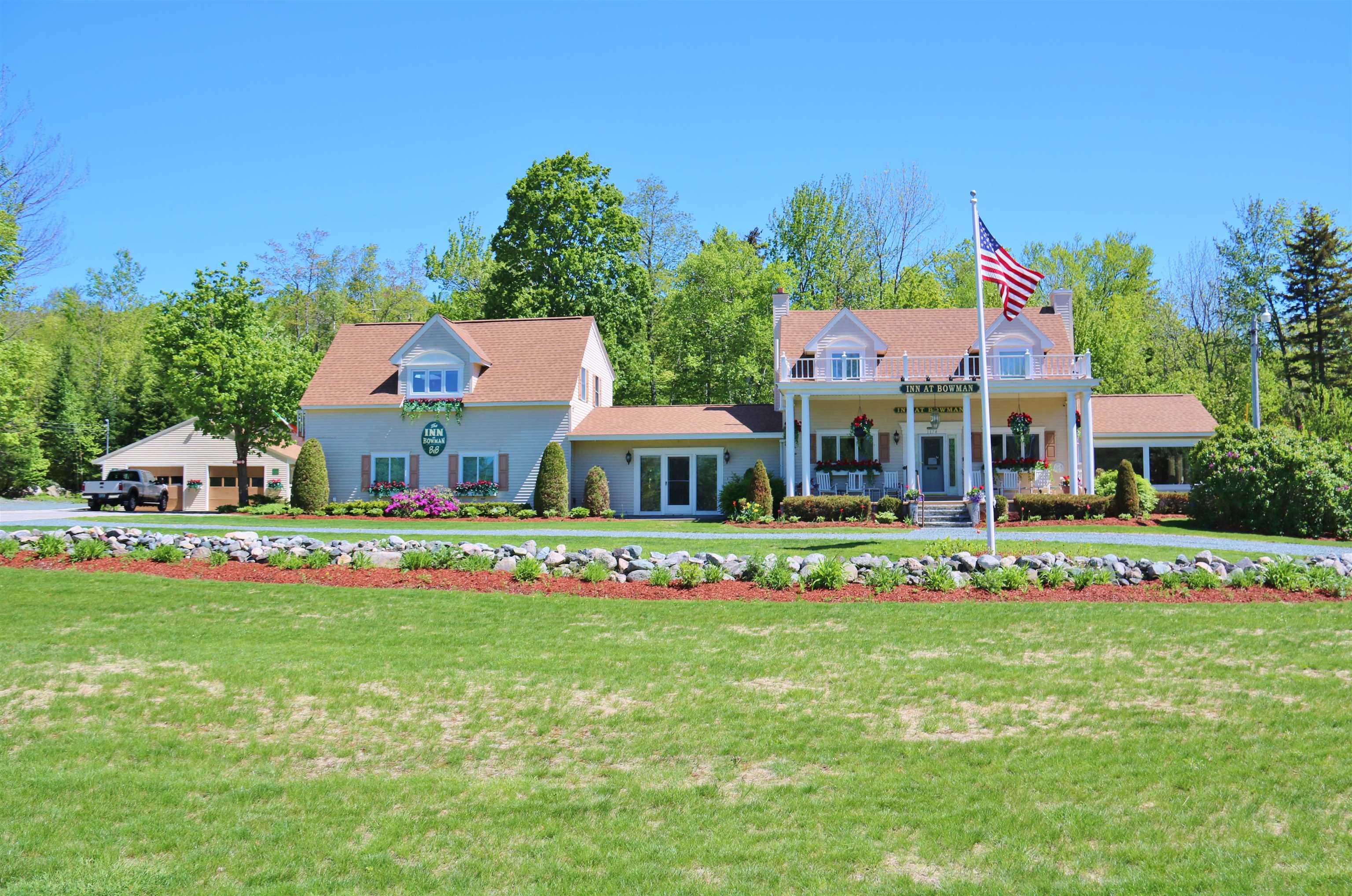 The Inn at Bowman looks at a portion of the Presidential Range that is truly breathtaking. Just out the window is Mt Adams and Mt Washington fills the background. This property has been operated as an inn and a short term rental and is now presented as a residential option for those seeking a grand experience in the White Mountains. The property is just ten minutes from Gorham NH, which offers top notch opportunities for hiking trails and exploring ATV and snowmobile routes throughout northern NH. Fifteen minutes in the opposite direction brings you to Santa's Village and Jefferson NH. The grand manor features eight private bedrooms and suites for hosting the greatest family events ever. The main level features a grand dining room, a central kitchen and two living areas for family and friends to gather. Three guest rooms are on the main floor while upstairs you will find five more. Some are cozy and quaint while others are large with room to sprawl and relax. Just outside is a pool and hot tub for soaking up the scenery of the Presidential Range. A beautiful lawn complements the yard and can be a great spot for games and recreation. The carriage house has a two car garage and lots of storage tools and toys, two more cars, or additional yard equipment. There is a studio apartment and one bedroom apartment over the garage and there are three additonal rooms with baths on the main level. These could be utilized for additional guests or perhaps converted to long term rentals to generate additional income. This residence offers so much potential for mixed living arrangements and you only need a little imagination and large group of family and frineds to enjoy it all.