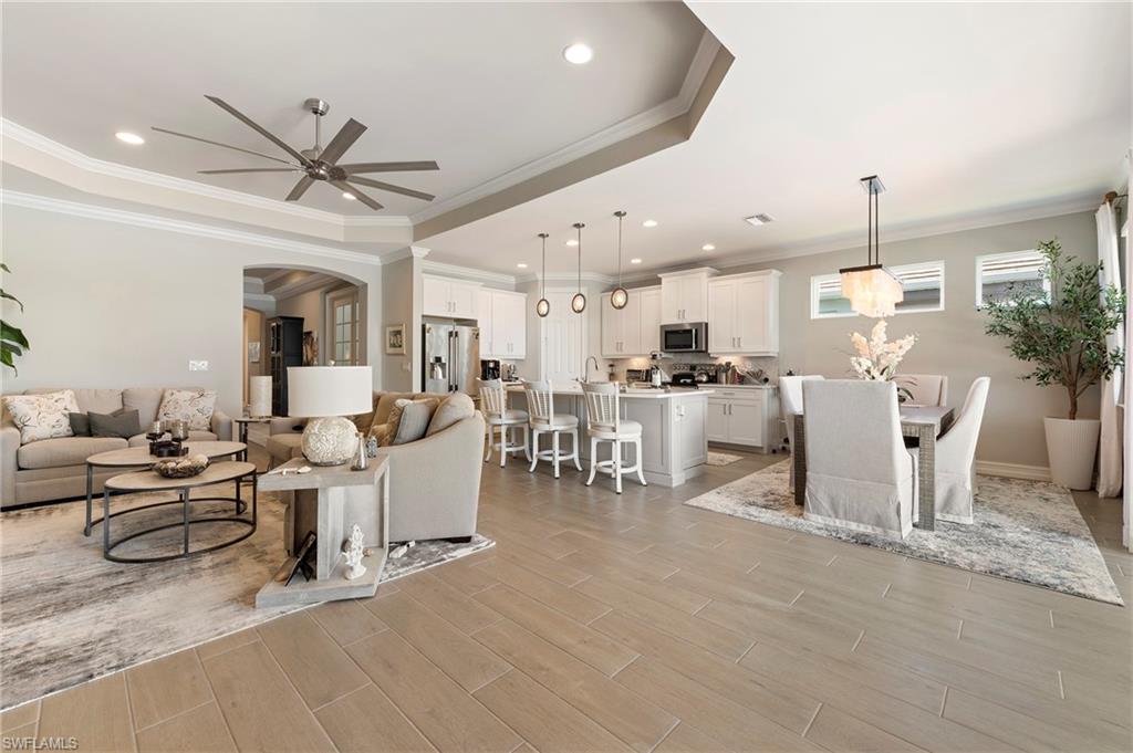 Built in 2019, this thoughtfully designed residence offers 4 bedrooms plus a flex room, 3 full bathrooms, half bathroom on the lanai, and an open-concept layout that feels spacious, light-filled, and serene. Tile flooring throughout the main living areas and carpeted bedrooms provide both durability and comfort. Quartz countertops are featured in the kitchen and bathrooms, complemented by many high-quality finishes. High ceilings—9 feet throughout with tray ceilings reaching 10 feet—enhance the open, airy feel. A spacious two-car garage provides ample storage, and the paved driveway adds to the home’s clean, well-kept presentation. The heart of the home is the open living space, filled with natural light from abundant windows and extra-wide sliding glass doors that create a seamless connection to the lanai. Coastal finishes and a light, neutral palette contributes to a calm, elegant atmosphere. The home feels exceptionally quiet and peaceful, with a strong connection to nature throughout. The kitchen is spacious and open, anchored by a large center island that provides generous prep space and seating. Quartz countertops, ample cabinetry, and a pantry combine functionality with everyday convenience, making the kitchen ideal for both entertaining and daily living. The primary bedroom suite is generously sized and tranquil. The spa-like primary bathroom features a soaking tub, a large shower with frame-less glass enclosure, and a well-proportioned layout that feels both functional and relaxing. A customized, spacious walk-in closet provides ample storage and organization, enhancing the suite’s comfort and convenience. The screened-in lanai is a true highlight of the home. With eastern exposure, it enjoys sunlight all day, while the covered portion remains shady and comfortable during the hottest summer months, providing a perfect retreat in Florida’s climate. Overlooking the center lake, the lanai offers peaceful water views and frequent wildlife sightings, including wading birds and other native species. Evenings bring a gentle chorus of birds and nature sounds, creating a uniquely serene setting. The lanai comfortably accommodates both a wraparound seating area and a dining table. A private half bathroom adds convenience. The pool and attached spa provide options for lap swimming, exercise, or quiet nighttime relaxation, enhanced by multiple pool lighting settings that create a soothing ambience. Gated resort-style community, amenities and activities including walking paths, pet parks, a children’s playground, community center, boathouse, tennis and pickle-ball courts, restaurant and an all-weather bar lakeside. It is conveniently located within an easy drive to beaches, restaurants, and cultural venues, including local theaters. Built-in wine cooler, hurricane shades on the lanai, custom window treatments throughout, Coastal-style chandeliers in the master bathroom and dining room, Customized walk-in closet in the primary suite.