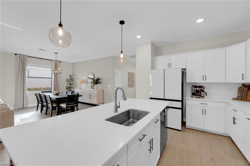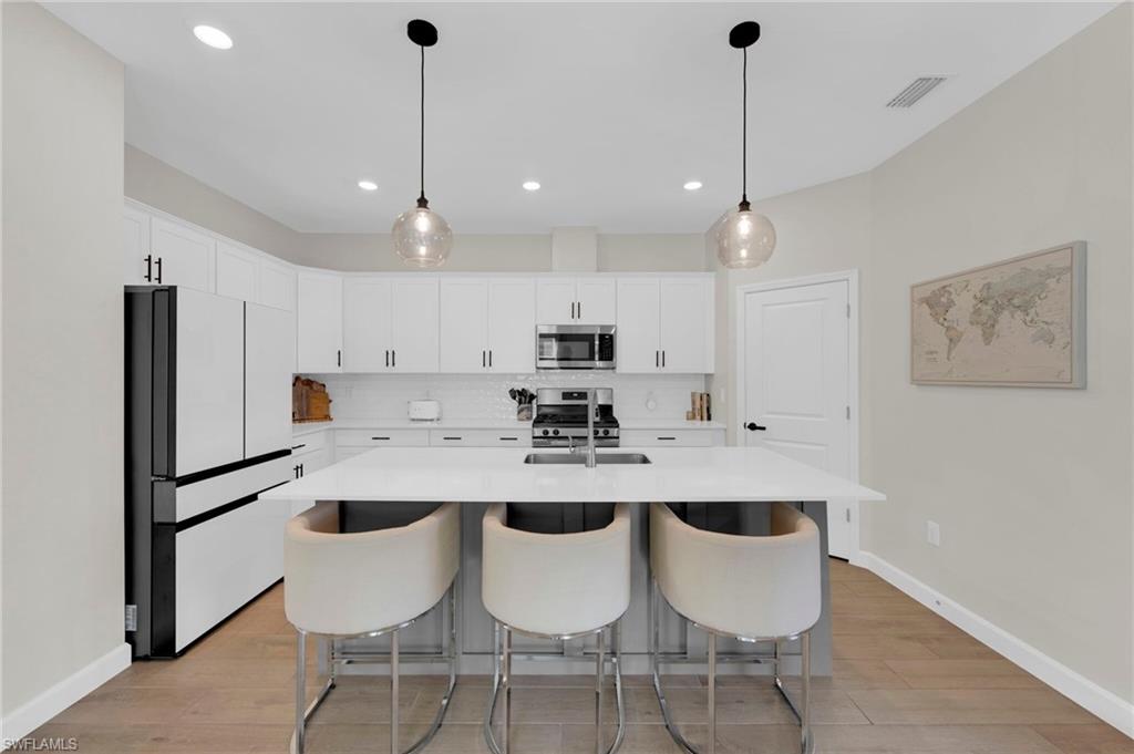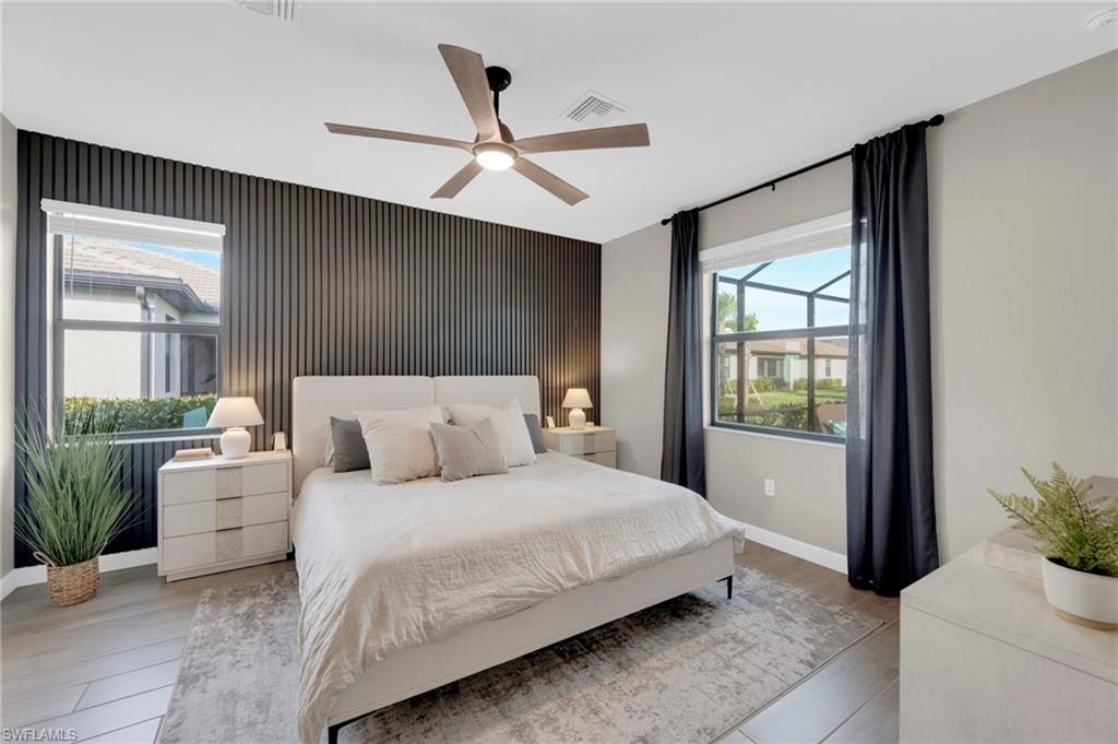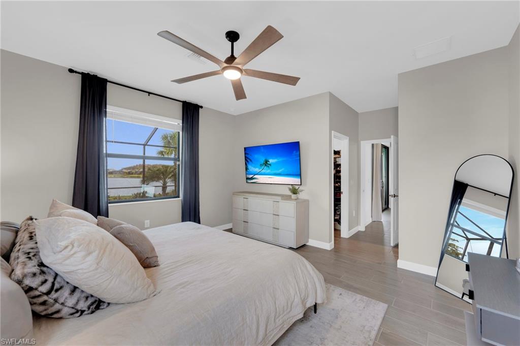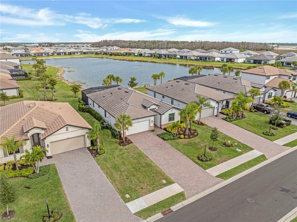 Enjoy peaceful LAKE VIEWS while relaxing in your PRIVATE POOL and SPA in this nearly new LENNAR TREVI floor plan. Located in the sought after VERDANA VILLAGE community, this highly popular layout offers 4 BEDROOMS and 3 FULL BATHS. Offered at a compelling price, this home is currently the lowest-priced property with a pool and spa available in the community. It is located in the West Village, where construction is nearly complete, the neighborhood offers a more established feel. Designed for effortless living and entertaining, the open-concept layout is enhanced by thoughtfully added feature and accent walls, including a custom feature wall in the living area, a roman clay dining room accent wall and painted wood accent walls in the primary suite and guest bedrooms. The kitchen is well-appointed with white shaker cabinets, quartz countertops and a ceramic tile backsplash. This home includes all BRAND-NEW appliances including a Samsung refrigerator, BOSCH dishwasher, and LG AI washer and dryer set. The primary suite offers two walk-in closets along with dual sinks and vanities, creating a comfortable, private retreat. Ceramic tile floors throughout the home with no carpet anywhere. Smart home upgrades include a Ring doorbell, Ring security system, keyless entry, Wi-Fi thermostat and smart garage opener. Additional highlights include hurricane impact windows, front door hurricane panels, and an epoxy-coated garage floor, providing durability, and peace of mind. Outdoors, the screened lanai and pool area create the perfect backdrop for enjoying Florida’s indoor-outdoor lifestyle while taking in peaceful lake views. The West Village neighborhood in Verdana offers additional amenities including a clubhouse, pool, spa and more, in addition to the main Verdana resort amenities. This is a NATURAL GAS community known for its impressive resort-style amenities: an INDOOR SPORTS COMPLEX (with 4 indoor pickleball courts, 2 tennis courts and a full basketball gym), 12 OUTDOOR PICKLEBALL COURTS, a state of the art fitness center with yoga & strength training, and THREE ONSITE DINING OPTIONS including a Café, Drift Restaurant, and Craft Lounge. Just outside the gates, you'll find the Shops at Verdana Village including a Publix grocery store, Dunkin Donuts, Italian restaurant, nail salon, UPS store, and a bank—all just a short golf cart ride away!
