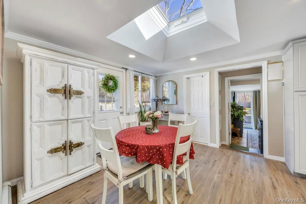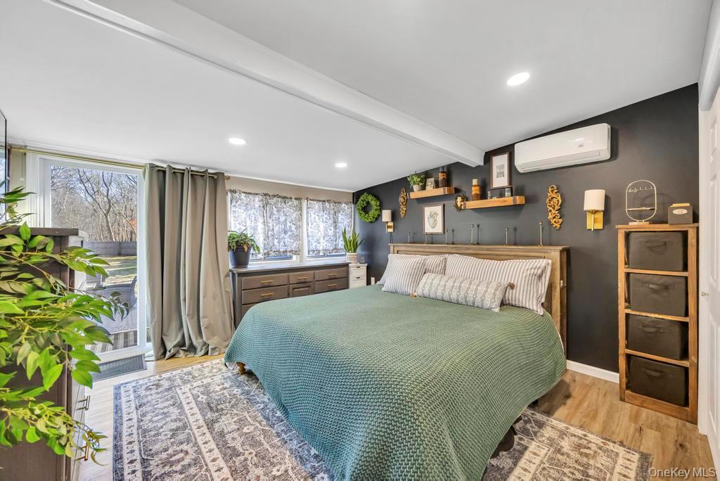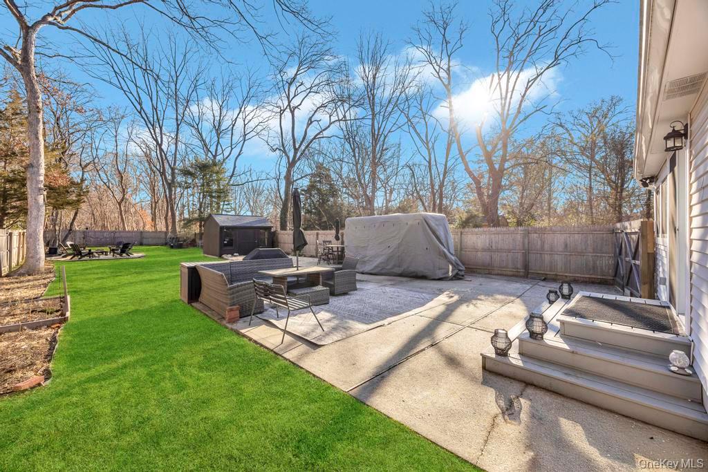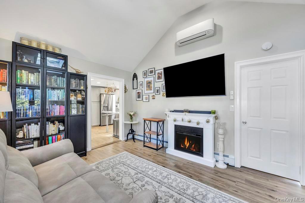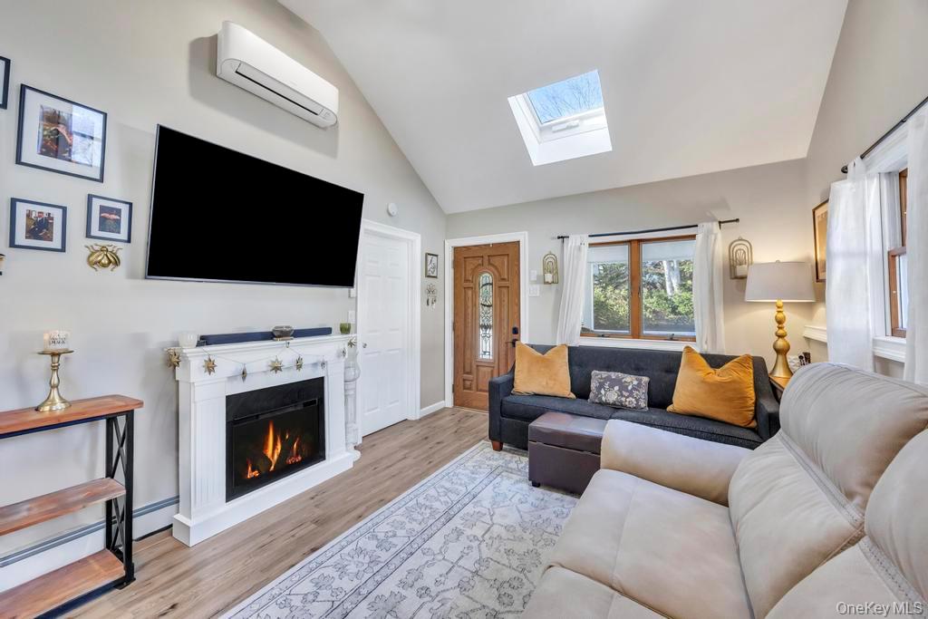Welcome to 143 Wood Road in Centereach! This beautifully maintained and thoughtfully updated 2-bedroom, 2-bath ranch offers comfort, character, and versatile living space—perfectly complemented by a full basement and inviting outdoor areas. Step inside to a bright and cozy living room featuring vaulted ceilings, skylights and a modern mini-split system for efficient heating and cooling. The open layout flows seamlessly into the dining area and updated kitchen, which boasts granite countertops, stainless steel appliances, ample cabinetry, and recessed lighting—ideal for everyday living and entertaining. The spacious primary bedroom offers a peaceful retreat with stylish accent walls, generous closet space, a full bath en-suite and direct access to the backyard. The second bedroom is equally well-sized and filled with natural light. Both full bathrooms have been tastefully updated, featuring clean contemporary finishes. The full basement adds tremendous value and flexibility, offering plenty of room for storage, a home gym, recreation space, or future finishing possibilities. Outside, enjoy relaxing on the charming covered front porch or hosting gatherings in the fully fenced backyard, complete with a patio, lush lawn, and shed for additional storage. The property offers privacy and space while still being conveniently located near shopping, dining, parks, and major roadways. Move-in ready, full of charm, taxes under $4k and offering flexible living space—143 Wood Road is a wonderful place to call home!