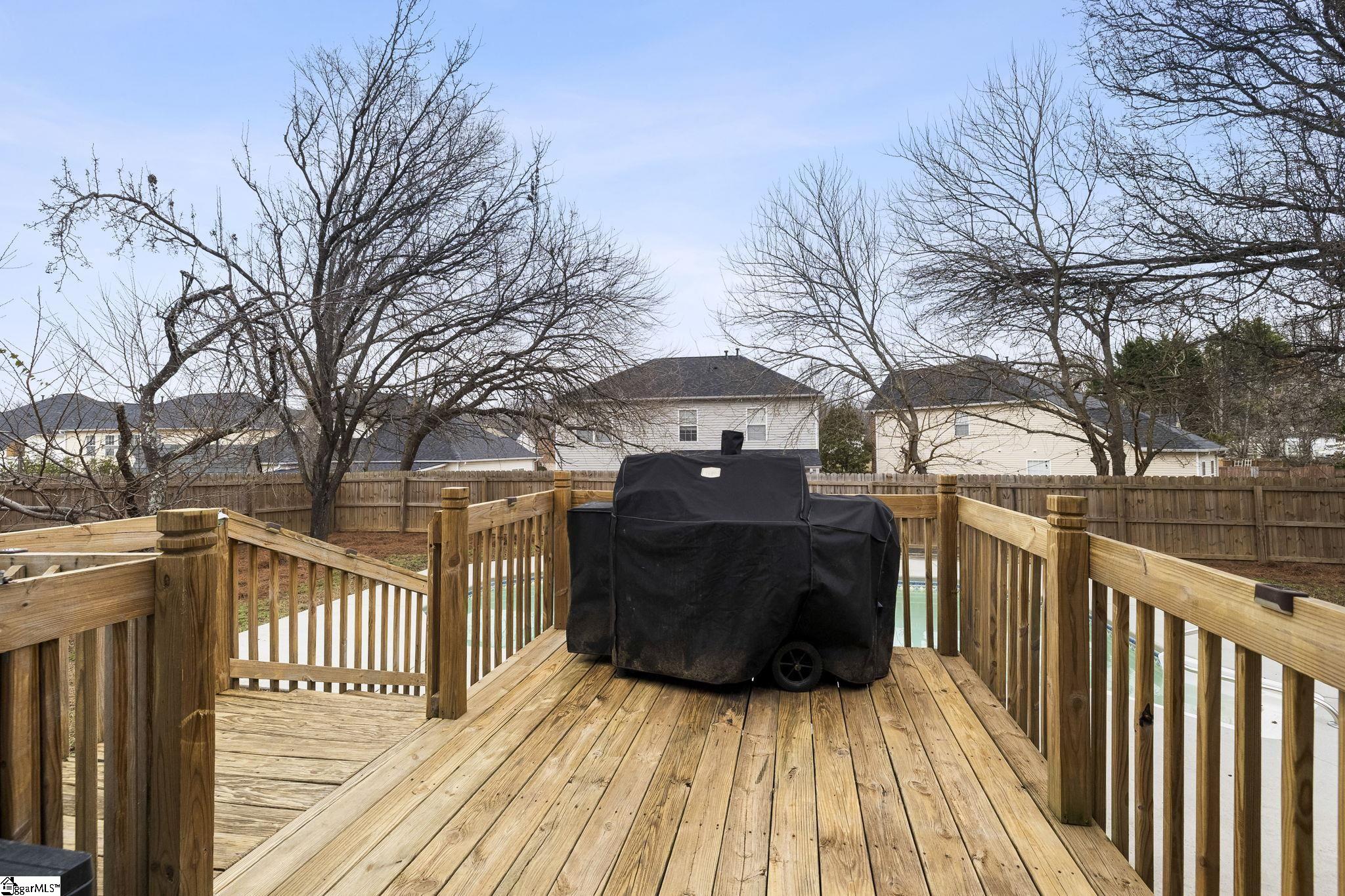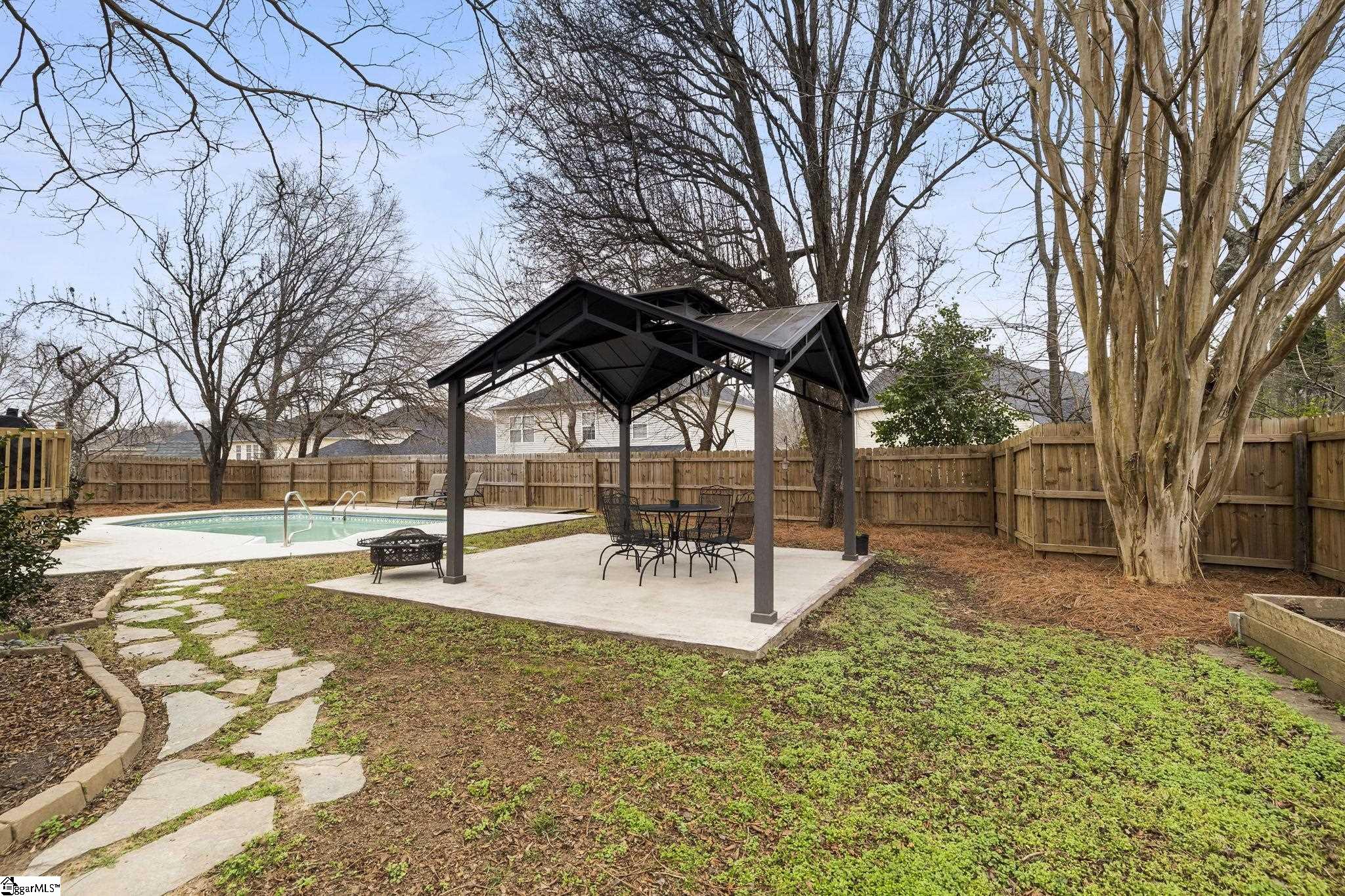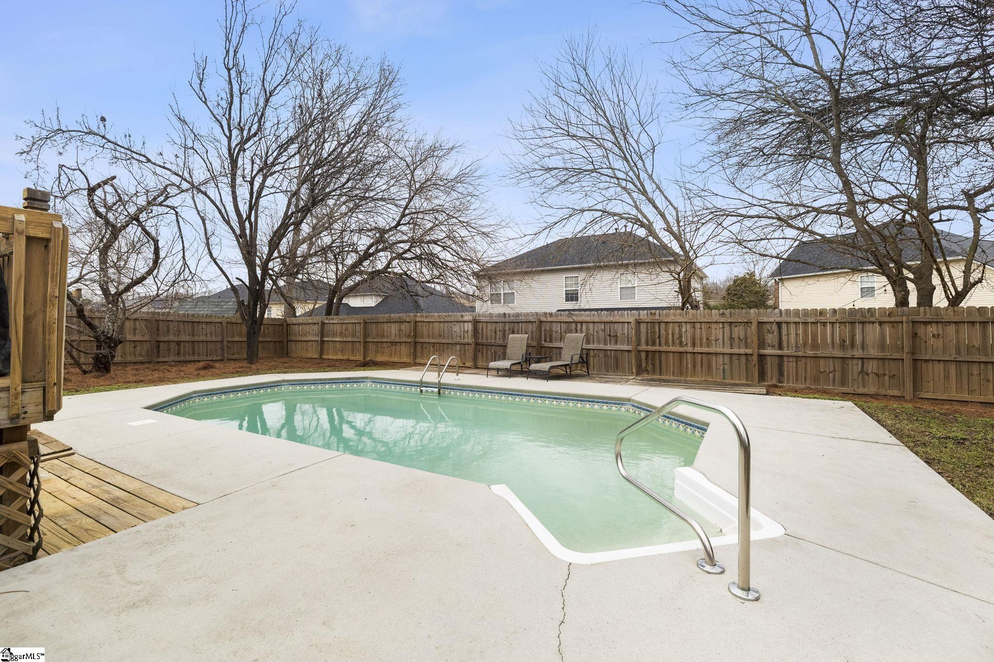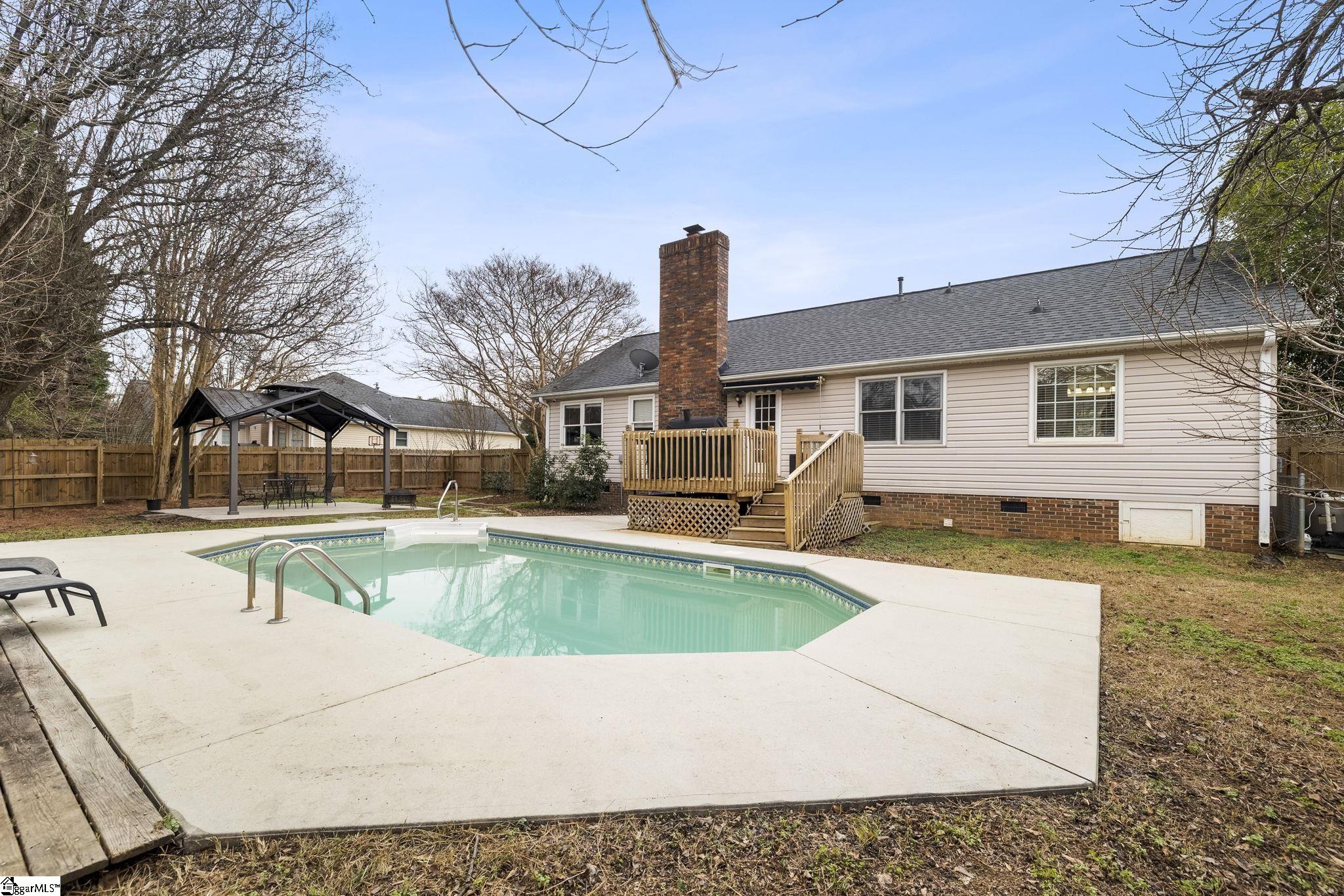 Ranch-style home offering one-level living at its finest, ideally located in the sought-after Rosemont neighborhood just minutes from downtown Simpsonville. The flexible floor plan features a spacious kitchen with the option for an eat-in area or a keeping room/drop zone that leads directly to the two-car garage. Off the kitchen is the sunny dining area with a great view of the backyard. The vaulted great room is warm and inviting with a cozy wood-burning fireplace—perfect for chilly winter nights. Two secondary bedrooms share a hall bath with a tub/shower combination, while the spacious primary suite offers a trey ceiling, walk-in closet, and private bath with dual sinks, a garden tub, and a separate shower. Step outside to a fabulous backyard designed for entertaining and everyday enjoyment, complete with a full privacy fence, mature landscaping, and a deck overlooking the in-ground saltwater pool with ample surrounding patio space. A separate covered patio provides the perfect spot for outdoor dining or relaxing in the shade. The generous backyard still offers plenty of room for a playset or additional gardens. Prime location just off Highway 14 and minutes from I-385, shopping, dining, and all that downtown Simpsonville has to offer.