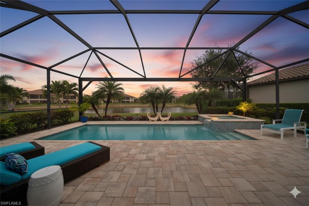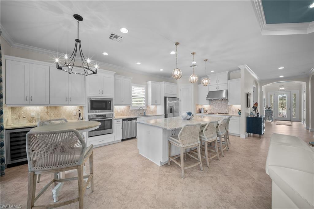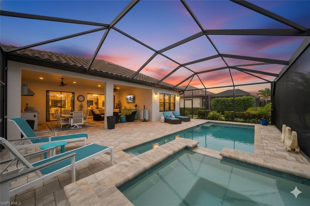 This immaculate and well appointed expanded “Lazio” is situated on an oversized lot at the end of a quiet cul-de-sac street and comes partly furnished. Inside, you will find 3 bedrooms, den, 3 full baths, and just over 2300 sq ft of open concept living space. From the moment you walk in the door, you are greeted with diagonal tile floors throughout the common areas and two sets of sliding glass doors to the extended lanai complete with custom outdoor kitchen, GAS heated pool with raised spa, picture window screen, and lush landscaping. The kitchen is the heart of the home and features shaker style cabinetry, Cambria quartz countertops, pantry with custom shelving, and stainless steel appliances including a GAS cooktop & wall oven. Other fine appointments include: luxury laminate wood flooring in the bedrooms & den (no carpet anywhere); expanded kitchen with breakfast nook area and extra cabinetry; plantation shutters on all windows; primary suite walk in closet with custom shelving/drawers; hurricane impact front door with matching sidelights; recently painted interior and exterior; spacious Laundry Room with cabinetry; extensive crown and wall molding details including custom cut mirrors; updated bathroom light fixtures; tankless GAS hot water heater; 8' doors/10' ceilings; extensive professionally enhanced landscaping with professional landscaping lighting; and more!