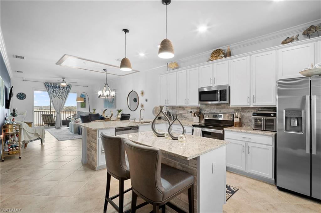 Enhanced by a transferable golf membership, this top-floor condo offers the opportunity to move right in and enjoy a turnkey, resort-style, low-maintenance lifestyle with championship golf and walkable clubhouse amenities. A top-floor setting adds exceptional privacy with no neighbors above, complemented by an unbeatable location within walking distance to the resort-style clubhouse amenities. Beautifully furnished, this 2-bedroom, 2-bath residence is thoughtfully designed with eye-catching details throughout, from the statement accent wall and stylish backsplash to the island wall décor, shiplap ceiling detail, and designer light fixtures, every space feels curated and welcoming. The owner’s suite features a walk-in closet and private en-suite bath, while the guest bedroom is equally comfortable with its own adjoining bathroom. Unwind on the screened lanai boasting golf course and lake views. Located within the gated Babcock National Golf & Country Club, residents enjoy a vibrant, low-maintenance lifestyle with a full suite of completed amenities. Highlights include a resort-style pool with lap lanes, Watershed tiki bar & grill, elegant clubhouse with fine dining and bar, fitness center, aerobics studio, full-service day spa, tennis and pickleball courts, and multiple satellite pools with outdoor grills. The 18-hole championship course, meticulously designed by Gordon Lewis, delivers an exciting experience for golfers of all levels. With a full-time lifestyle coordinator hosting weekly social events, food trucks, and vendor nights, this condo is perfect as a full-time residence, seasonal escape, or investment opportunity. Don’t miss your chance to own a move-in-ready home in Babcock Ranch, one of Southwest Florida’s most amenity-rich communities.