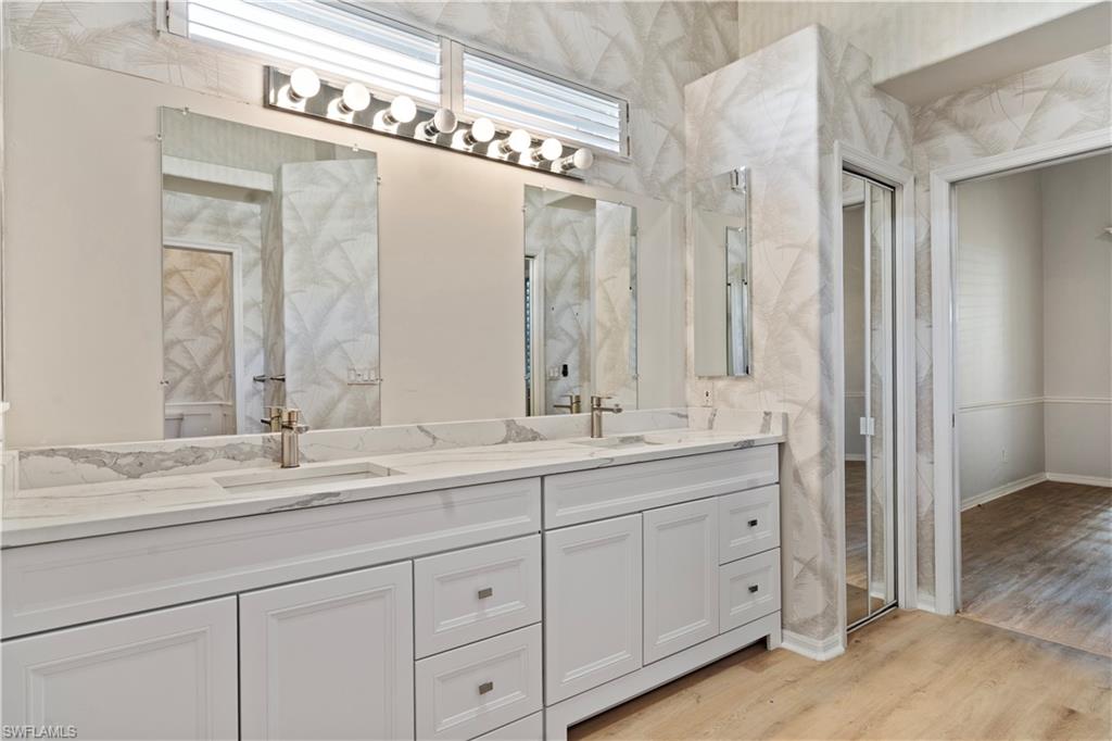 The open concept kitchen was remodeled in 2022 with quartz countertops, a large breakfast bar, beautiful cabinetry, stainless steel appliances, and a spacious pantry. The primary suite is positioned for privacy and includes an ensuite bathroom with a dual sink vanity and quartz countertops, dual walk-in closets, and a walk-in shower. Guest bedrooms are separated from the primary suite, creating a comfortable layout for visitors or flexible use. Notice luxury vinyl flooring has been upgraded throughout the home in 2022. Other improvements include the interior being recently painted throughout (2025), impact resistant windows (2024), a newer roof (2018), and a new A/C (2024).