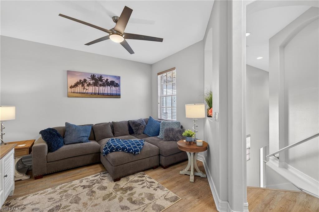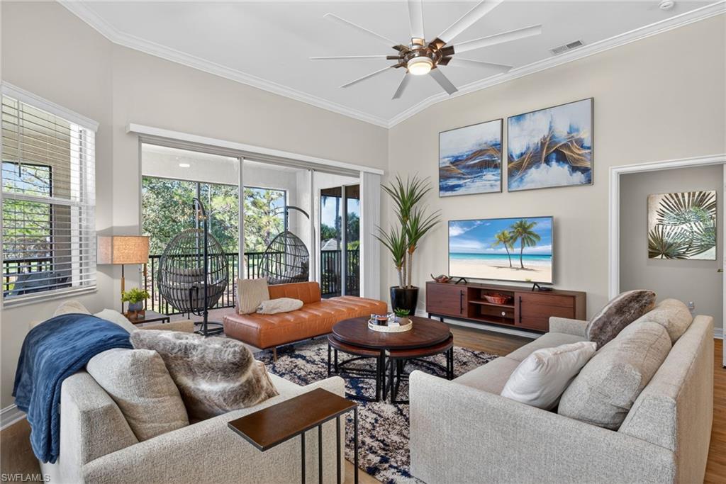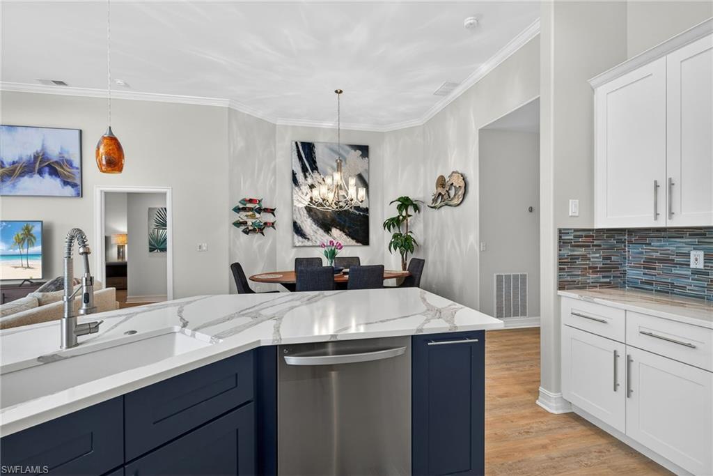 Sensational and fully renovated, this second-floor carriage home in Pelican Sound is the coastal retreat you’ve been waiting for! Thoughtfully updated throughout, this residence showcases a bright, open great-room floor plan and designer touches at every turn. The stunning new kitchen features quartz countertops, LG stainless steel appliances, soft-close cabinetry, and an elegant glass tile backsplash. The spacious primary suite offers a tray ceiling, private lanai access, and a beautifully renovated bath complete with quartz counters, dual sinks, and a walk-in shower with a frameless glass door. Guests will enjoy their own updated bath with quartz counters and modern finishes. Luxury vinyl wood-look flooring flows seamlessly throughout the home, complemented by crown molding and upgraded designer fans and lighting. Additional features include a new tankless water heater and a/c, 2018, and an attached two-car garage with durable racetrack plastic flooring. Take in the amazing Florida sunsets on the private lanai, just a few steps away from the neighborhood pool. Move-in ready and impeccably styled—this carriage home is the perfect blend of comfort, luxury, and coastal charm. If you are looking for an active lifestyle look no further: 27 holes of Championship golf, 14 pickleball, 8 tennis and 6 bocce courts. State of the art fitness center that is professionally staffed. Pelican Sound is nestled up to the Estero River with access to the Gulf. The community offers dry boat storage, kayaks, canoes and paddle boarding, along with a shuttle boat to Lovers Key State Beach Park. Minutes from RSW International airport and surrounded by fabulous shopping and restaurants. Start Living The Dream!