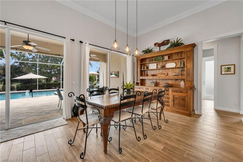 This inviting Carlyle model in VeronaWalk offers 4 bedrooms, 3. 5 baths, and 2, 528 sq/ft of solid 2006 Divosta POURED-CONCRETE CONSTRUCTION with thoughtful updates throughout. A stunning 2017 pool with sun shelf, bubbler feature, and umbrella anchors the outdoor living space, complemented by an extended lanai and screened front porch. Its elongated design also supports comfortable lap swimming. Peaceful canal views and mature landscaping create a private, tranquil setting just steps from the community preserve. A whole-house generator adds an extra layer of comfort and storm-season security. Inside, the open-concept kitchen features polished stone counters, pull-out drawers, and illuminated glass-front doors, flowing into living and dining areas enhanced by updated lighting. Three large mirrors and vertical wood detailing define the living room, while newer tile flooring provides the look of wood with added durability. The primary bath includes new vanities and sleek shower glass doors. Crown molding, plantation shutters, and a rear electric shutter off the lanai add comfort and peace of mind, showcasing the home’s meticulous care. VeronaWalk offers a gated entrance, resort-style pool, lap pool, fitness center, tennis and pickleball courts, bocce, and miles of walking paths, along with a convenient Town Center featuring dining, salon services, and everyday essentials.