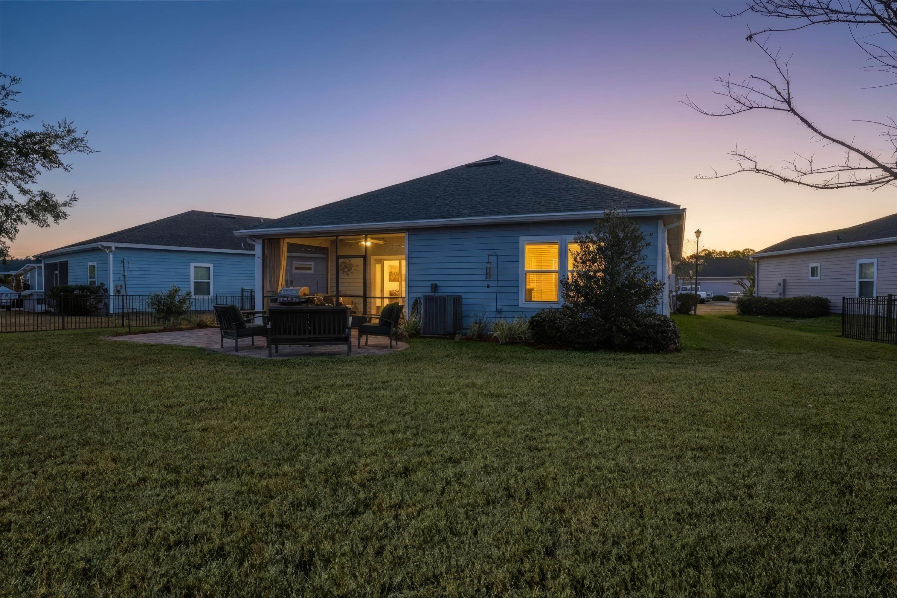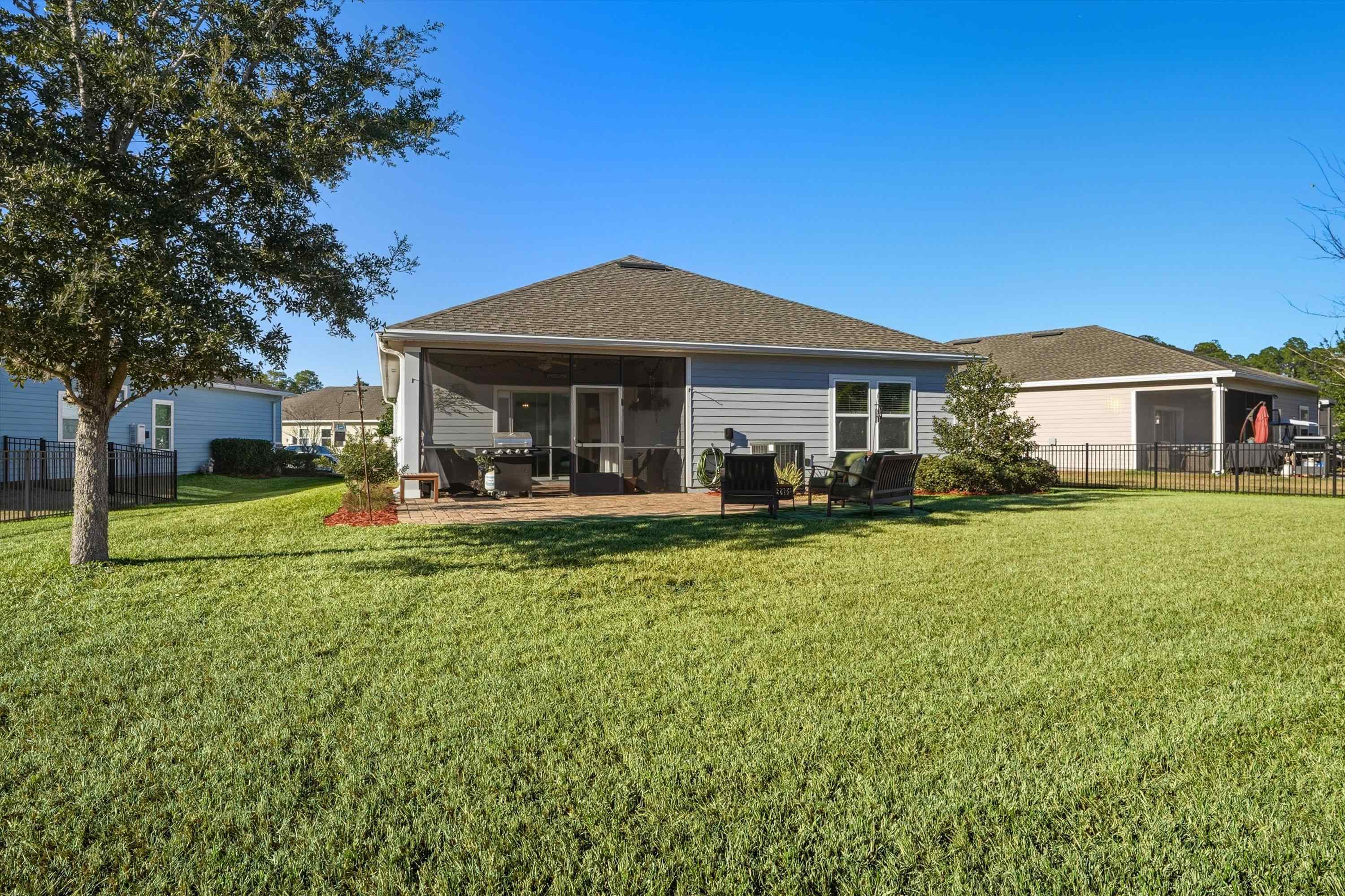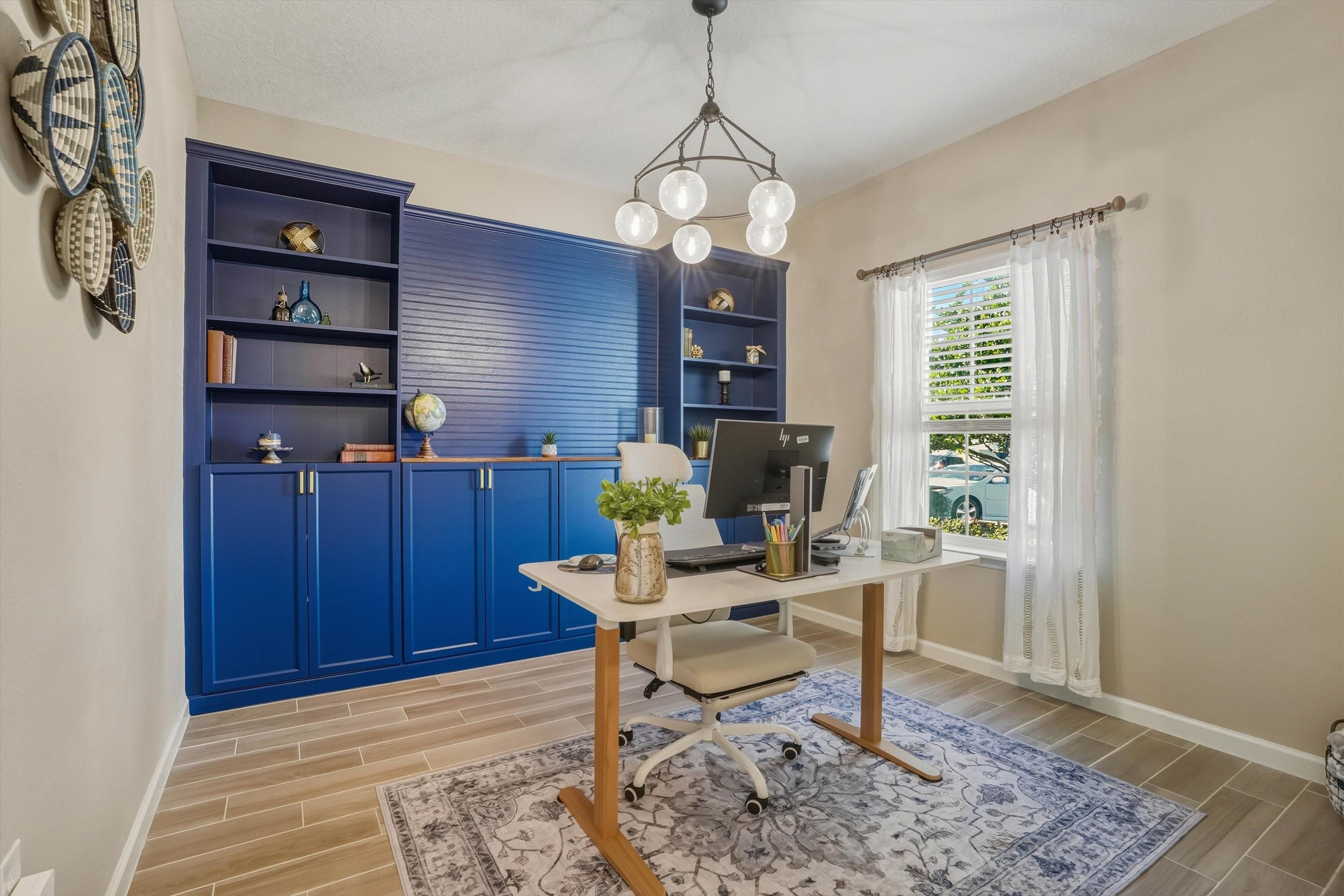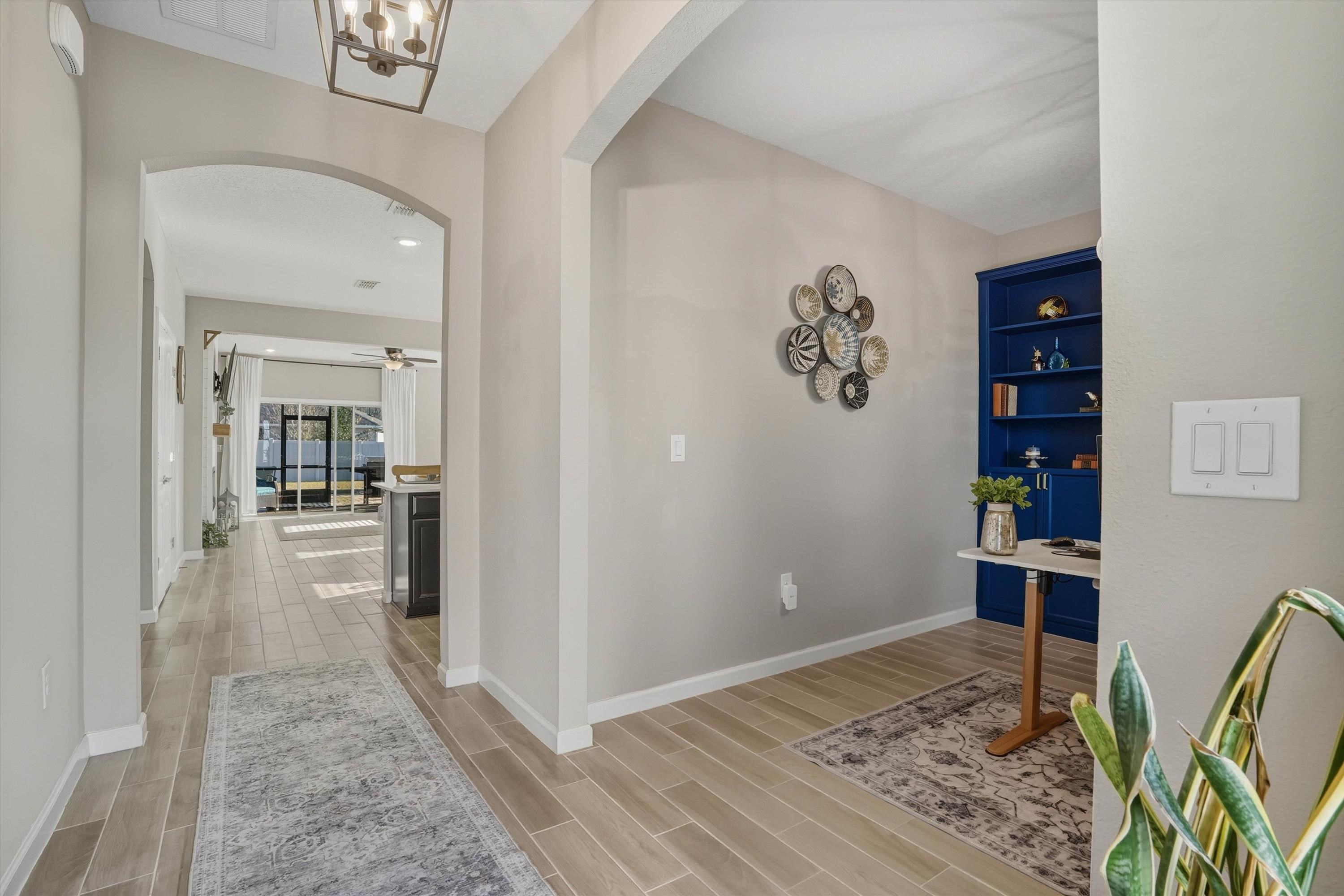 This is NOT your cookie cutter home in the gated community of Windward Ranch! From the moment you enter the foyer, the pride of ownership shines through. Custom built-in navy blue shelving and cabinetry adorn the front office space for an instantly elevated feel. Wood-look plank tile floors provide low maintenance living throughout the main living areas while the bedrooms are blanketed in soft plush carpet. This floor plan flows seamlessly from the kitchen with bar seating, stainless steel appliances, and elegant tile backsplash, through the casual dining area, and on to the living room anchored by an electric fireplace with shiplap surround and a cozy mantle. The living space extends even further out through to the screened lanai and outdoor paver patio to enjoy the best of Florida living. The back yard is larger than some as it is situated on the curve of the road so opens up nicely to the back. With a split floor plan, spacious bathrooms, and many up-styled areas adorned with custom woodwork, this house is easy to call home!
