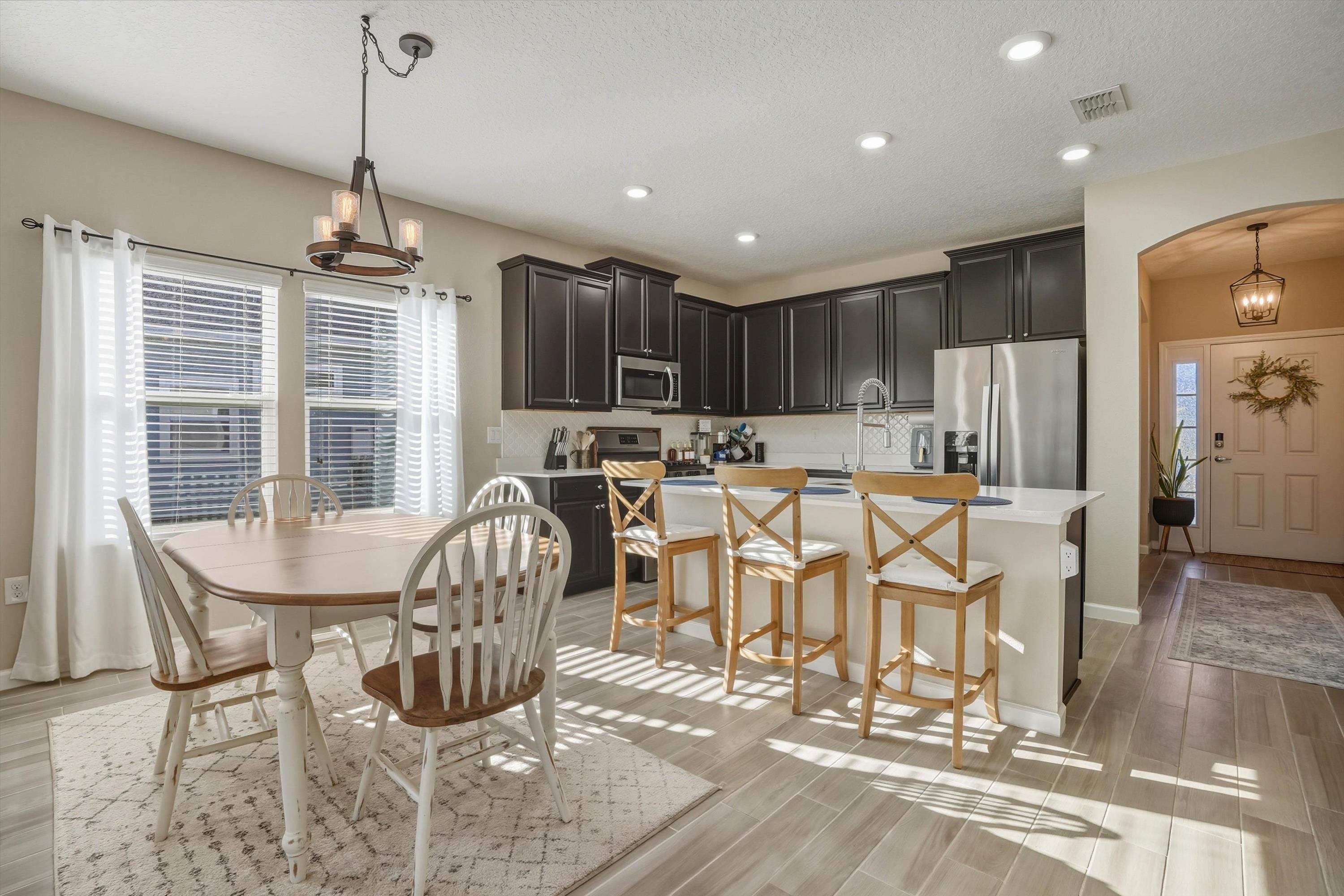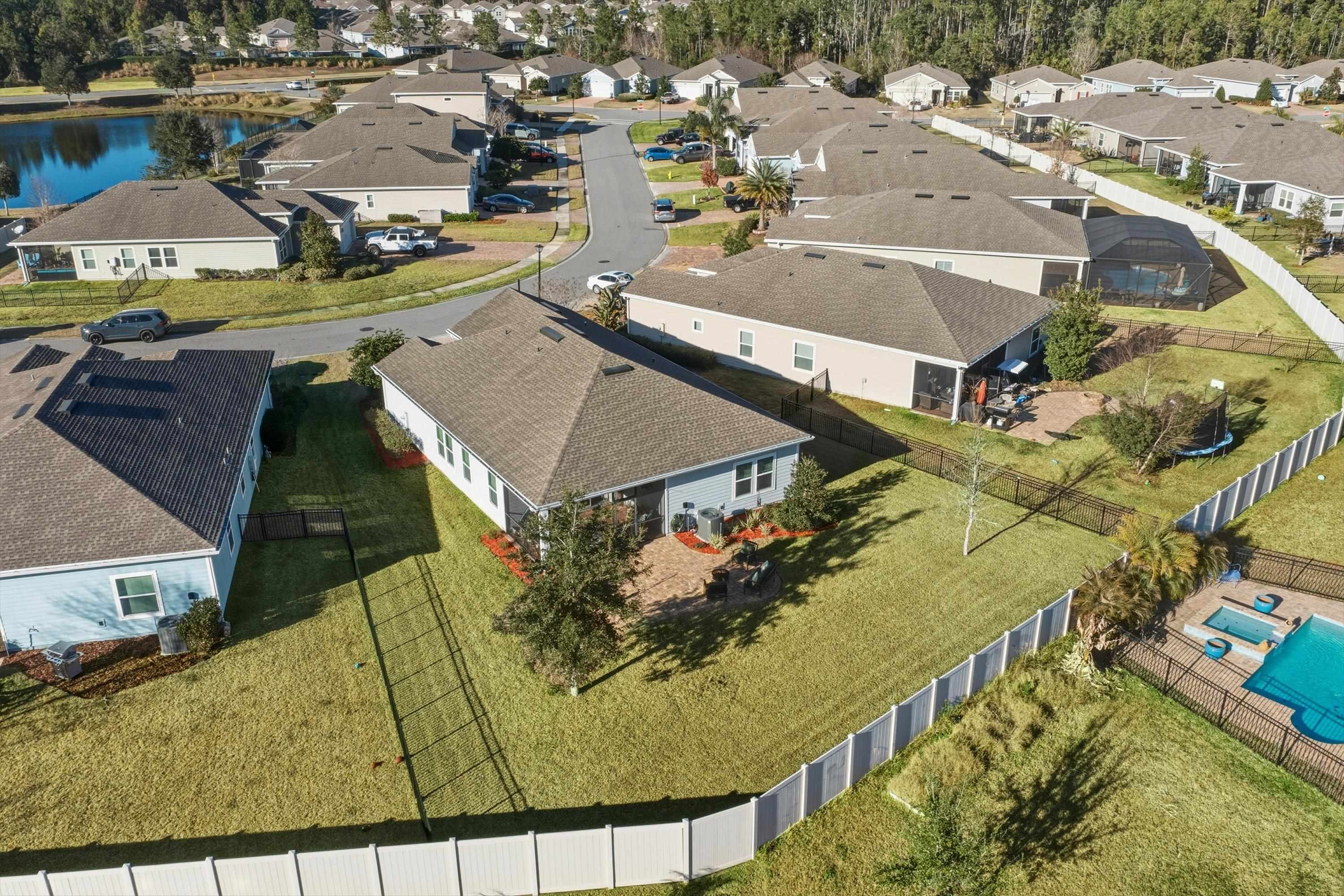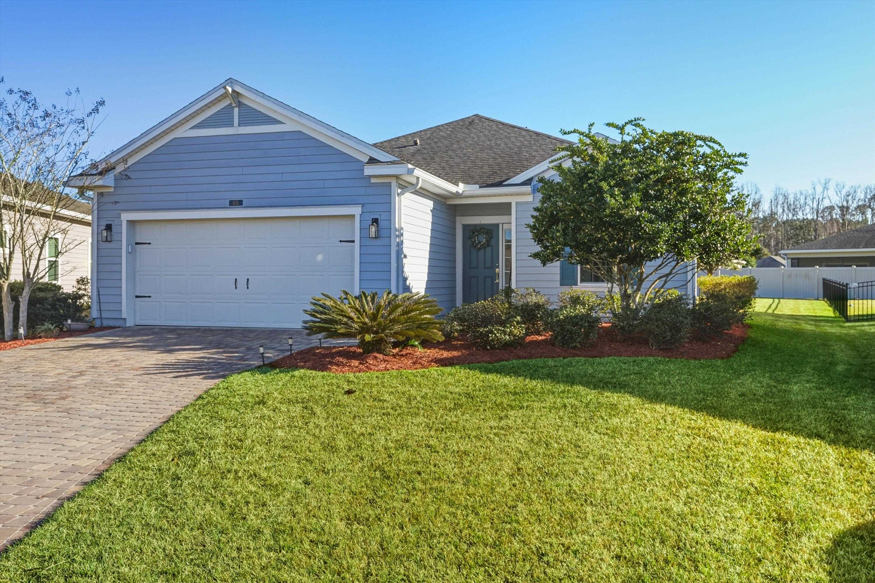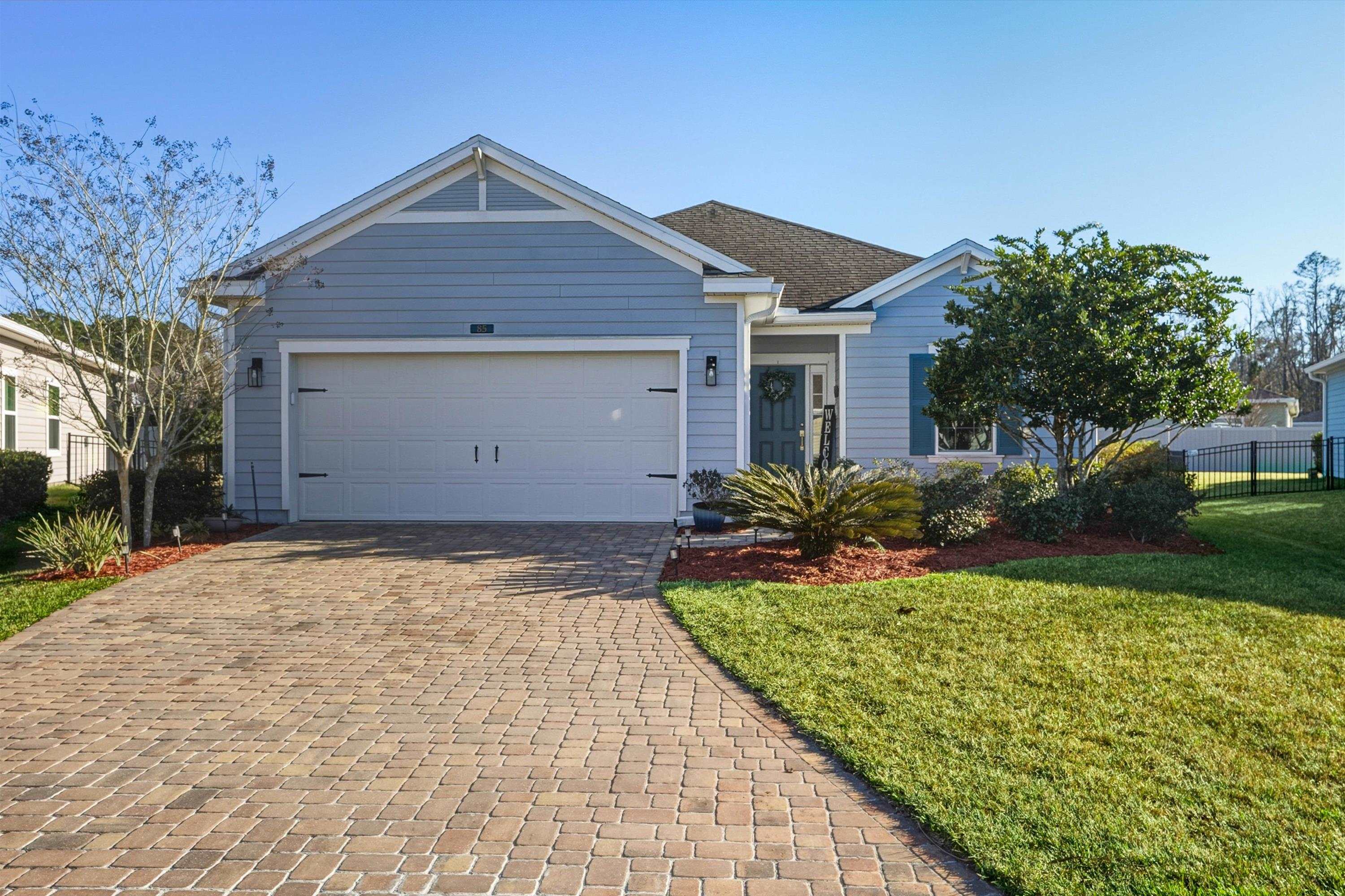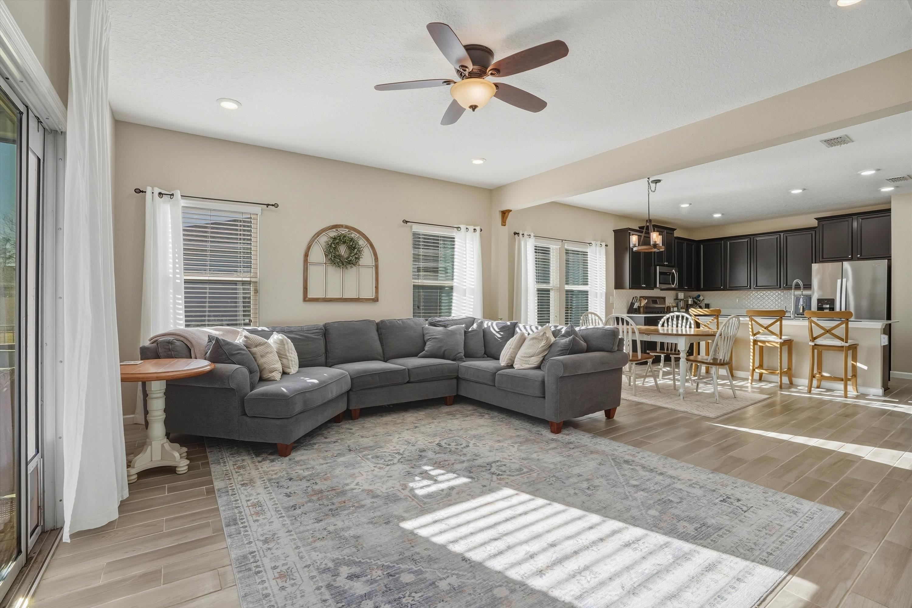 This is NOT your cookie cutter home in the gated community of Windward Ranch! From the moment you enter the foyer, the pride of ownership shines through. Custom built-in navy blue shelving and cabinetry adorn the front office space for an instantly elevated feel. Wood-look plank tile floors provide low maintenance living throughout the main living areas while the bedrooms are blanketed in soft plush carpet. This floor plan flows seamlessly from the kitchen with bar seating, stainless steel appliances, and elegant tile backsplash, through the casual dining area, and on to the living room anchored by an electric fireplace with shiplap surround and a cozy mantle. The living space extends even further out through to the screened lanai and outdoor paver patio to enjoy the best of Florida living. The back yard is larger than some as it is situated on the curve of the road so opens up nicely to the back. With a split floor plan, spacious bathrooms, and many up-styled areas adorned with custom woodwork, this house is easy to call home!