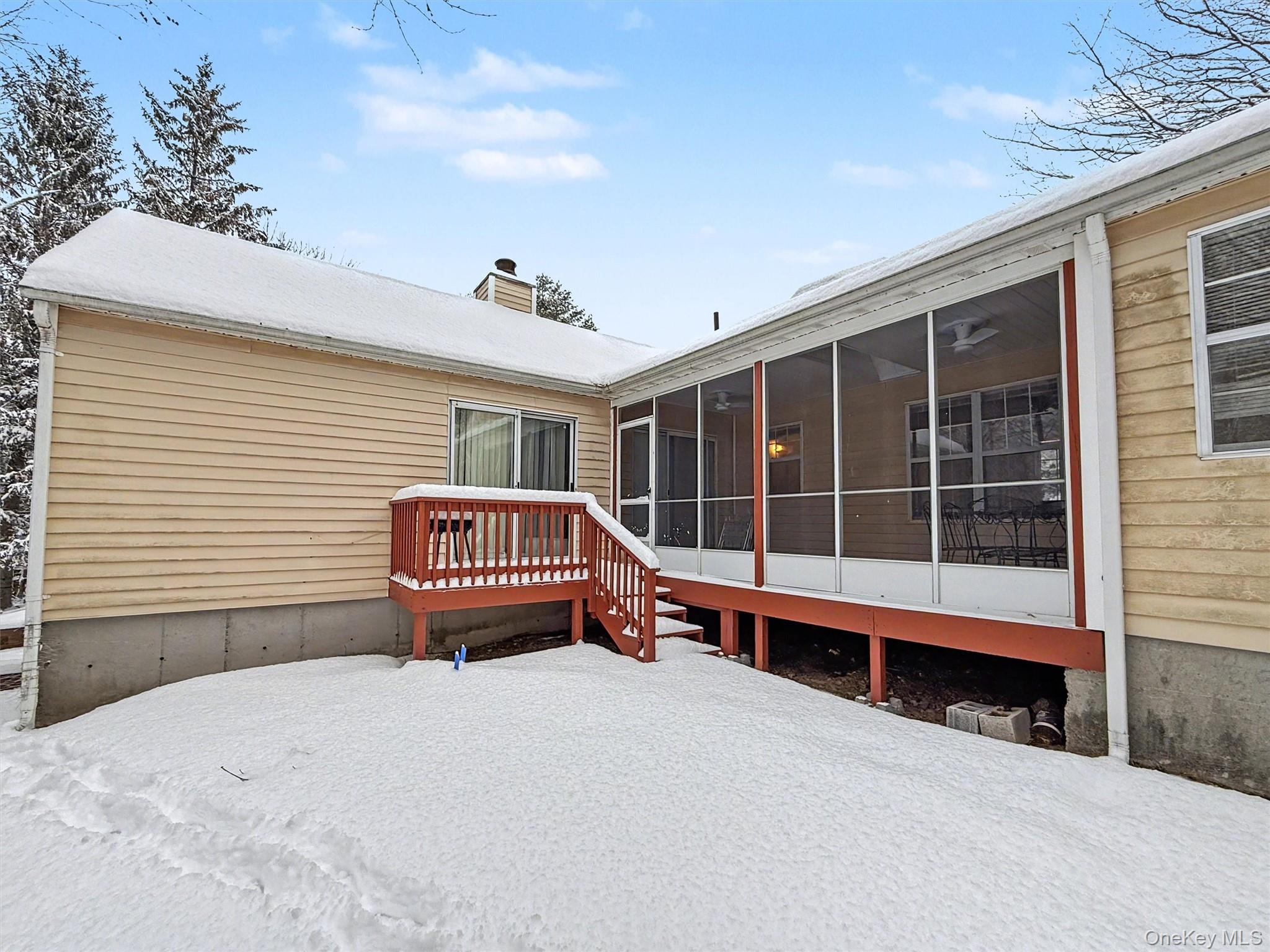 Welcome to Hidden Ridge - “The Jewel of the Catskills”! This charming 2-bedroom, 2-bath, fully furnished home offers easy one-floor living in a gated community, ideal for full-time residence or the perfect weekend escape. Situated on a quiet cul-de-sac, the setting is peaceful and private. The spacious primary suite features an en-suite bath, walk-in closet plus two additional closets, ceiling fan, and sliders that open to a small, private deck overlooking a wooded backyard. Mature trees provide privacy throughout much of the year, while winter views open up the landscape. The second bedroom is privately located in its own wing on the opposite side of the home. It's perfect as a guest suite or home office and is conveniently located near the second full bath with a shower stall. This room also includes a ceiling fan and ample closet space. A separate hallway offers additional storage along with a utility closet with washer & dryer. The eat-in kitchen includes a pass-through window to the dining area for easy entertaining and opens to a cozy living room with a fireplace. Skylights throughout the home bring in abundant natural light, while central air conditioning keeps things comfortable year-round. Step outside to the large screened-in deck, renovated within the last three years, complete with ceiling fans and skylights. Ideal for enjoying the fresh mountain air! A partial basement provides clean, dry storage space. With 1, 114 square feet of fully furnished living space, this home is being sold as-is, offering a wonderful opportunity to move in and make it your own. The snow-covered setting in the photos highlights the home’s winter charm, but spring and summer bring even more to enjoy - lush surroundings and endless nearby attractions. Hidden Ridge offers community amenities including a pool, clubhouse, and fitness center, and is conveniently located near Resorts World Casino, Monticello Motor Club, Kartrite Waterpark, Bethel Woods, hiking, skiing, breweries, wineries, and more. Whether you’re looking for adventure or relaxation, this Catskills retreat delivers.