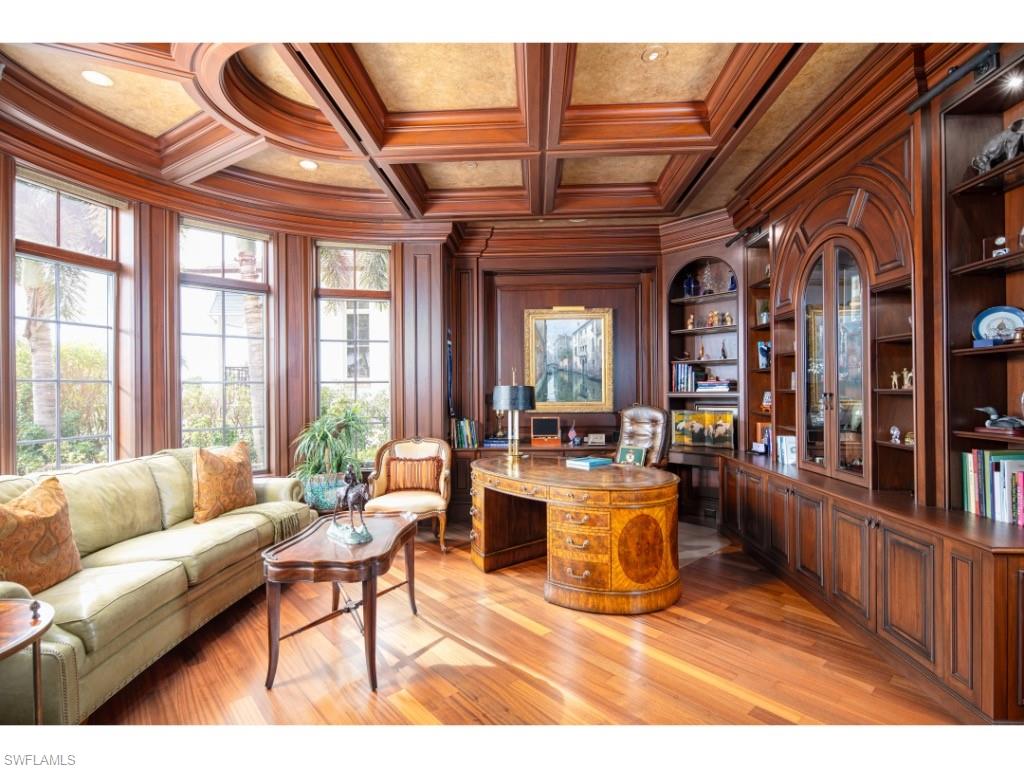 A classic and sophisticated residence perfectly positioned along the wide, protected waters of Ibis Cove in prestigious Aqualane Shores. Exceptional millwork and custom cabinetry by Baker’s Custom Cabinetry and Millwork, Inc. complement the home’s thoughtfully curated architectural details. A dramatic foyer with a sweeping staircase leads to beautifully scaled formal rooms that transition seamlessly to casual living areas, including a comfortable and refined family room adjacent to the kitchen and an expansive covered outdoor space. The fabulous kitchen with functional pantry/prep area supports both daily living and effortless entertaining. Designed for modern lifestyles, the home includes two office spaces – one, an impressive study with rich woodwork - a spacious exercise room, a luxurious theater, and four generous bedrooms each with ensuite bathrooms. Other notable features include a custom wine room, a robust generator, and garages designed to accommodate lifts for the car enthusiast. Outside, a well-appointed grill and bar area complements expansive waterfront entertaining spaces, while the significant dock allows effortless access and bridgeless passage to the Gulf. Ideally situated, this rare opportunity is in close proximity to Naples’ white-sand beaches and the acclaimed dining and boutiques of historic Third Street South.