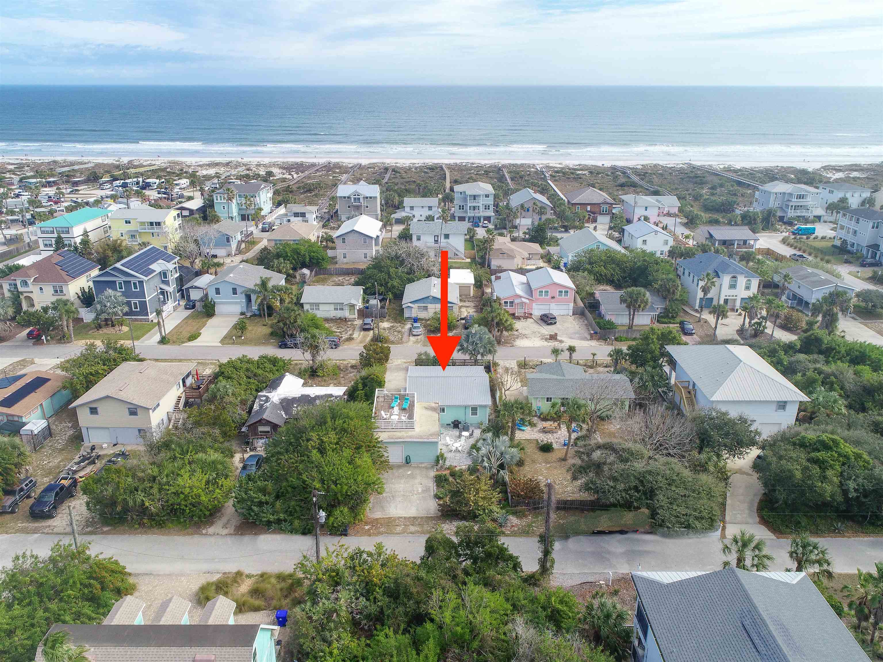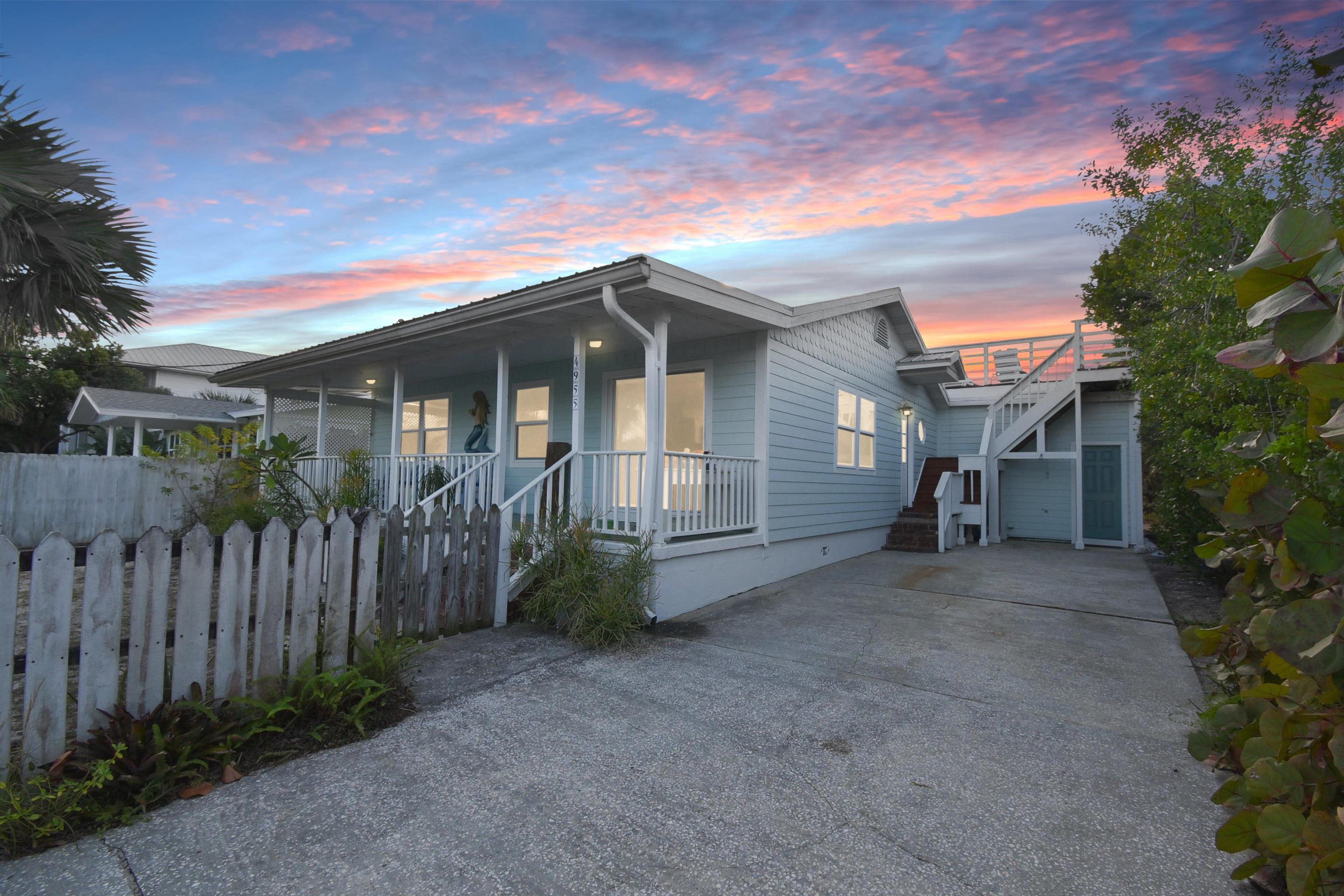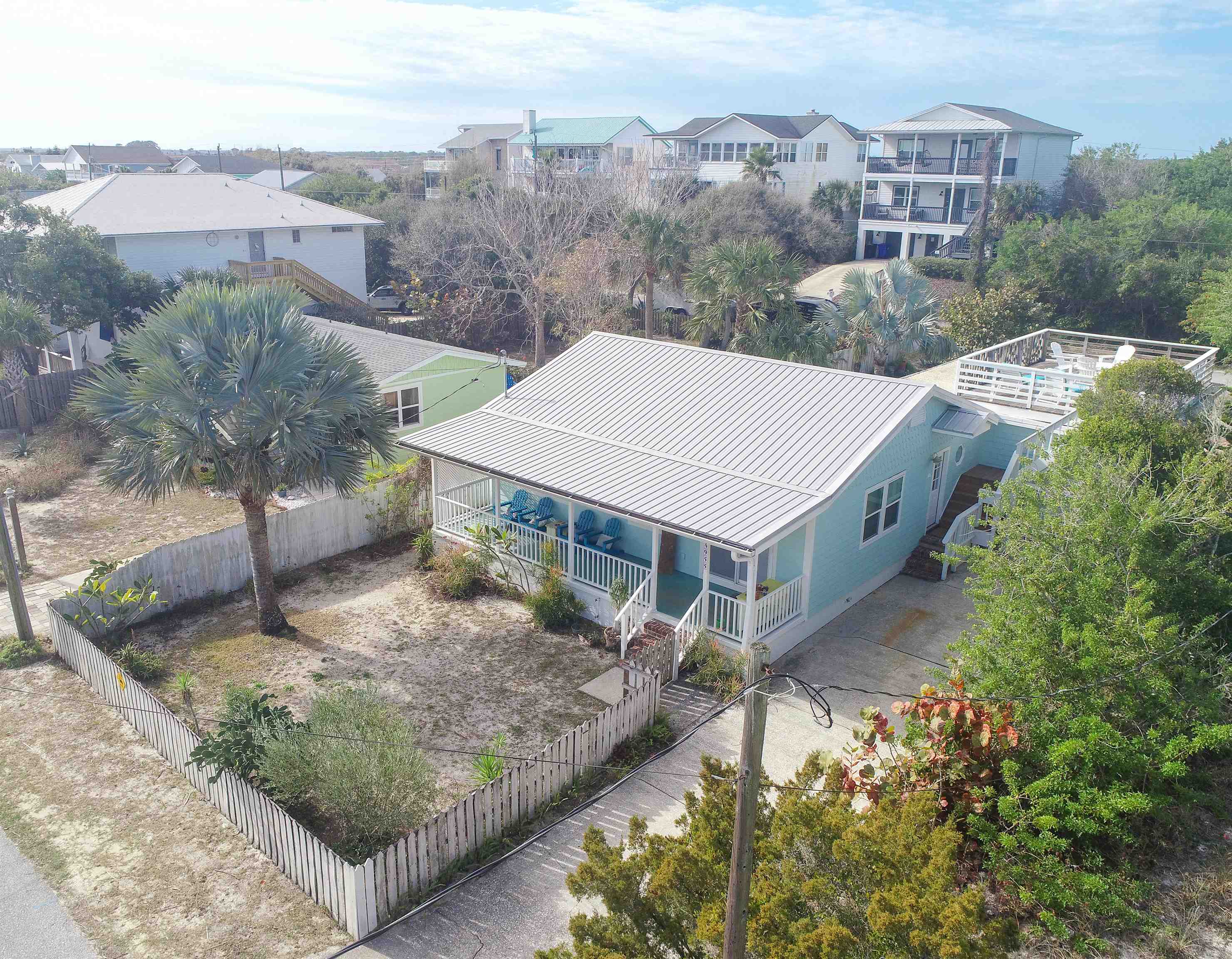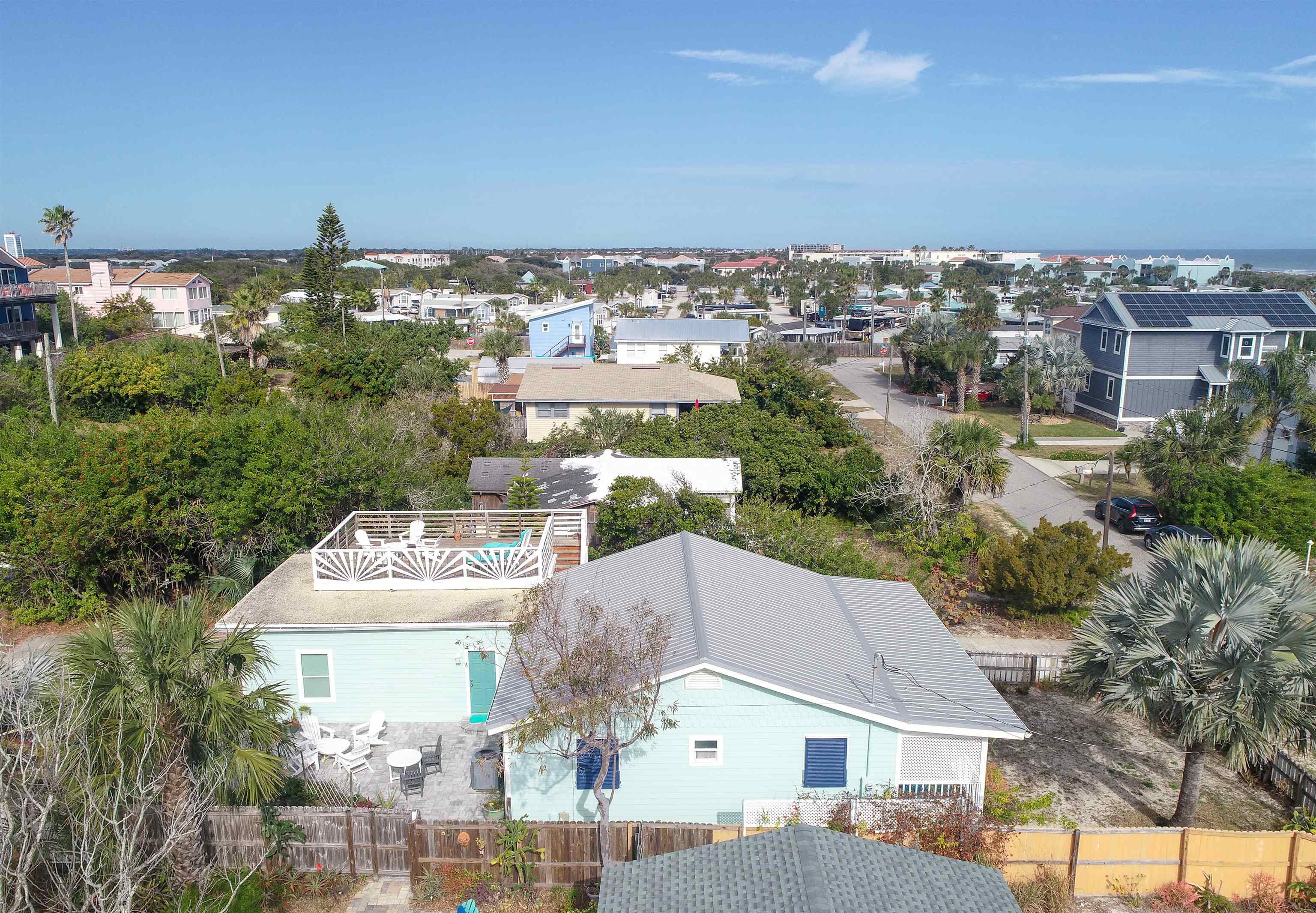 Welcome to the Mermaid, located a three-minute walk from Crescent/Butler Beach. This beautiful open-concept beach cottage has three bedrooms and two full baths, including a separate guest suite with bath. Enjoy the sound of the ocean from the covered front porch or rooftop deck, while the generous backyard and patio offer ample outdoor living space. The owners have meticulously maintained and improved this home. Fully turnkey and sold furnished, it features a newer roof, A/C, updated kitchen and baths, and excellent storm resilience thanks to its elevated setting. A one-car garage provides ample storage, and the oversized lot offers abundant onsite parking. Ideally suited as a year-round beach getaway with a strong rental history, the home would also serve as a comfortable primary residence. Purchase the property next door (4969 Medoras Avenue) and create a family compound! This home is located in the county not in the city of St Augustine Beach. Very close to the beach access. Plenty of room to add a guest home on the back, plenty of possibilities.