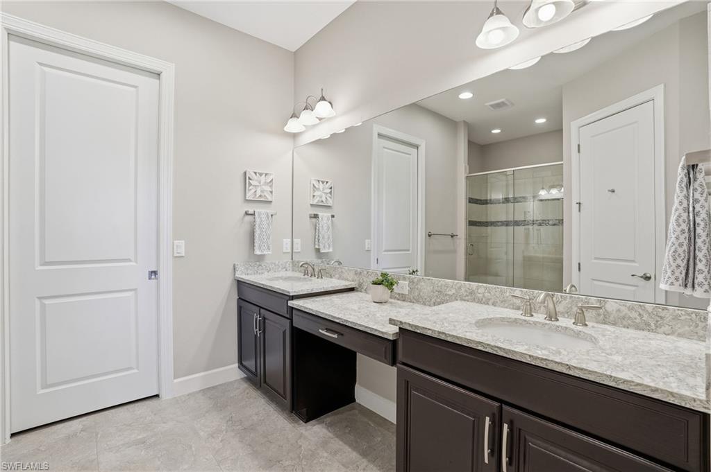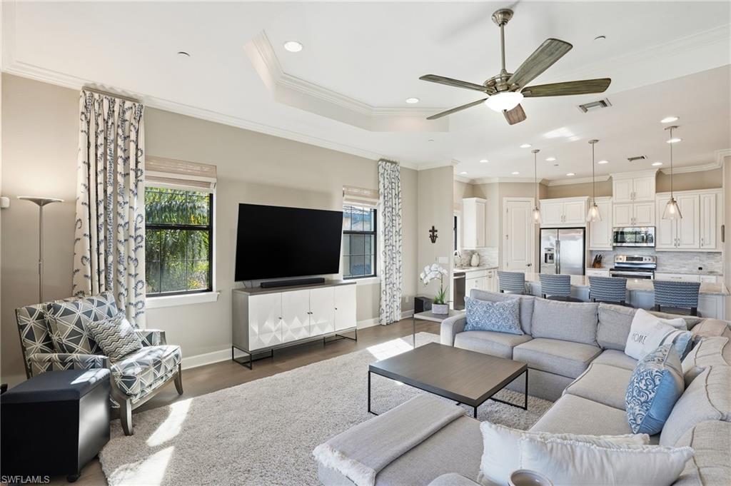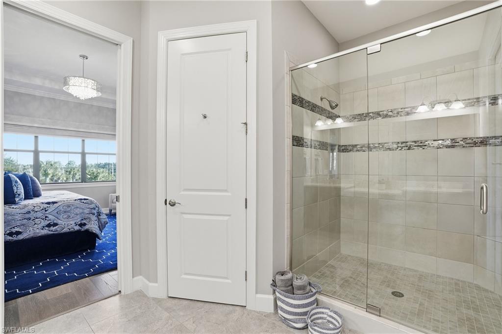 FULL GOLF MEMBERSHIP INCLUDED !! Step into a world of refined luxury with this stunning 3-bedroom, 3-bathroom condo in the heart of Naples, FL. This one of a kind property is located in the prestigious Esplanade Golf & Country Club. Every inch of this home has been meticulously upgraded to offer both elegance and comfort, creating a space that feels as much like a sanctuary as it does a showpiece. As you enter, you're greeted by breathtaking zero corner sliders that seamlessly merge indoor and outdoor living, flooding the space with natural light. The living room exudes warmth and sophistication, featuring a cozy fireplace framed by impeccable design. Engineered wood flooring throughout the main area adds a modern touch, while can lighting and upgraded light fixtures cast a soft, inviting glow. The den is an absolute standout, boasting a custom wall feature with intricate woodwork and mirrors—perfect for a quiet retreat or a stylish home office. Tray ceilings elevate the ambiance, adding a sense of grandeur to every room. The northeast exposure ensures your mornings are kissed by the gentle Florida sun, while your evenings promise tranquil, shaded relaxation. The master suite is a true retreat, with a spacious walk-in closet, a luxurious dual vanity, a spa-like shower, and a separate water closet. Every detail has been curated for both aesthetics and functionality. This home is not just a place to live—it's a lifestyle. Your dream condo awaits!