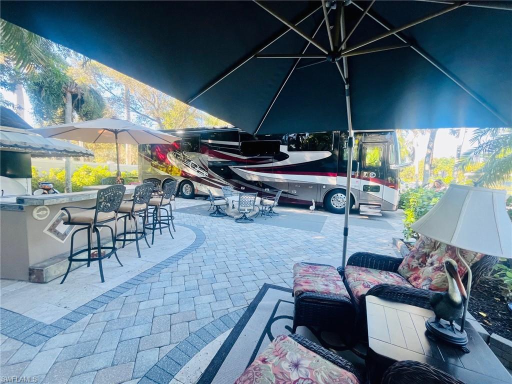 Off-lake Class A Motorcoach site located in Pelican Lake Motorcoach Resort near the quiet East end. This back-in site gives you northern exposure creating morning sun and afternoon shade on the patio side. Fully upgraded with pavers and an extended patio, built in bar with grill, and surrounded by nice tropical landscaping. Coachhouse is nicely finished with washer & dryer, toilet, sink, cabinetry for storage, countertop, AC and futon.