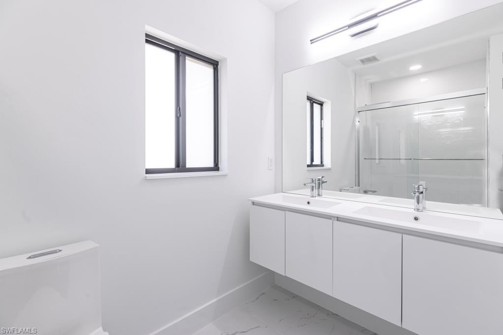 and a full porcelain backsplash—perfect for entertaining or everyday luxury. Enjoy spa-like bathrooms featuring glass-enclosed showers, double vanities with full-size mirrors, and modern LED lighting that adds style and warmth. Thoughtful upgrades include: *Hurricane impact windows & doors *Epoxy-coated garage flooring + hurricane-rated doors *Tankless water heater & ample laundry room storage Relax under the shaded,