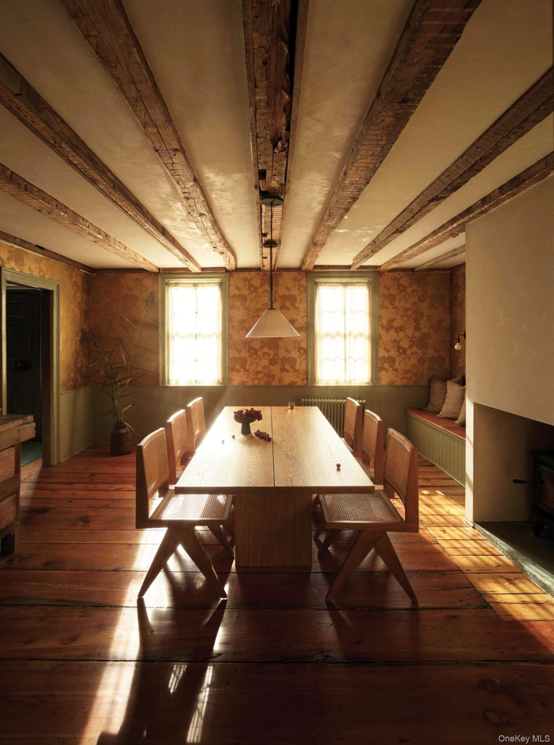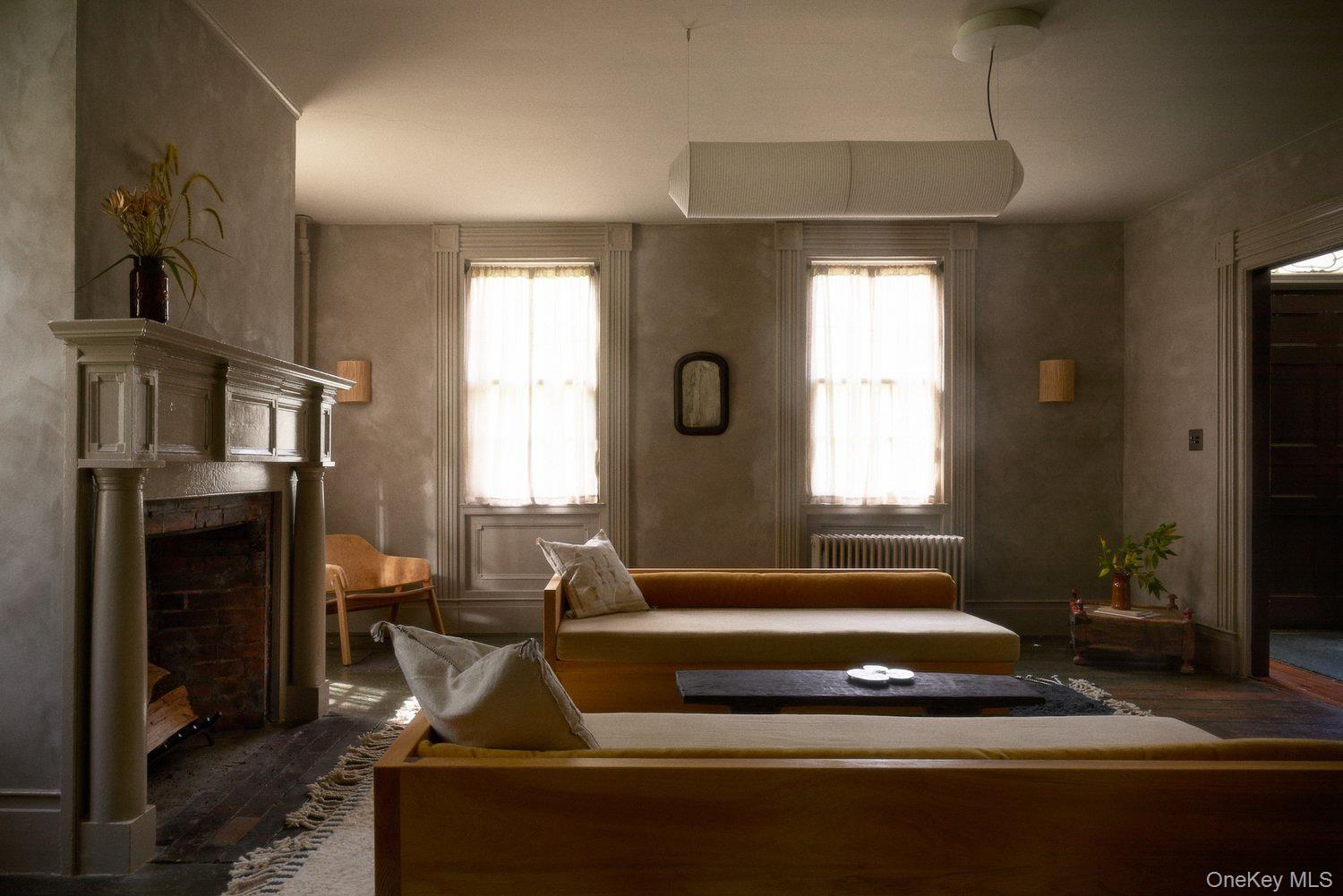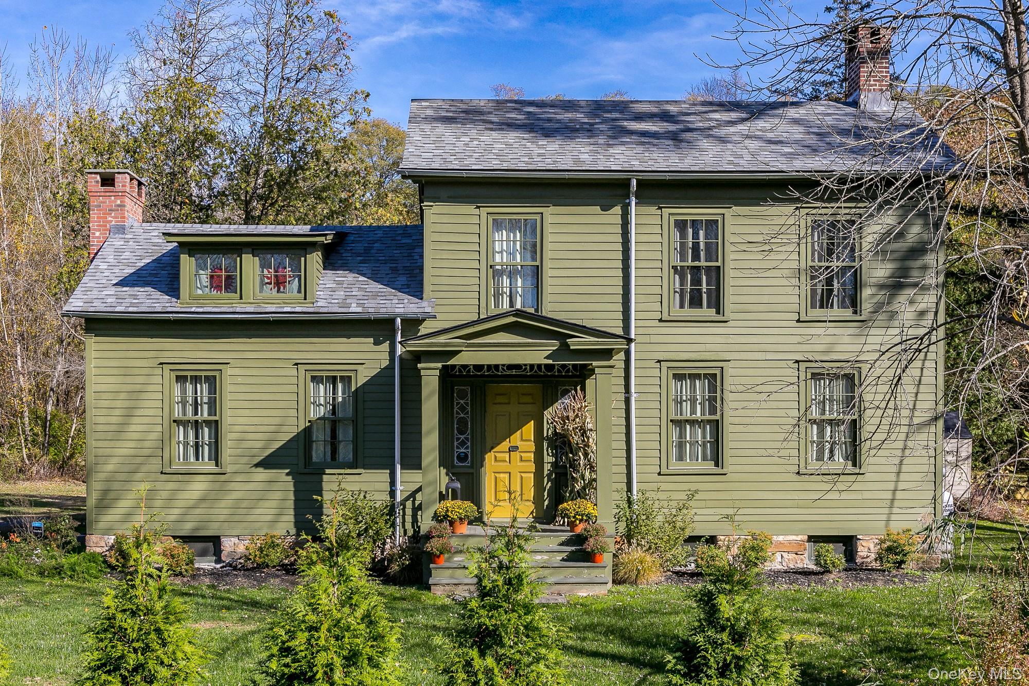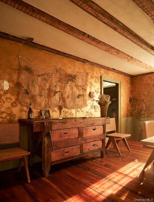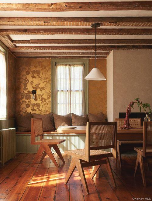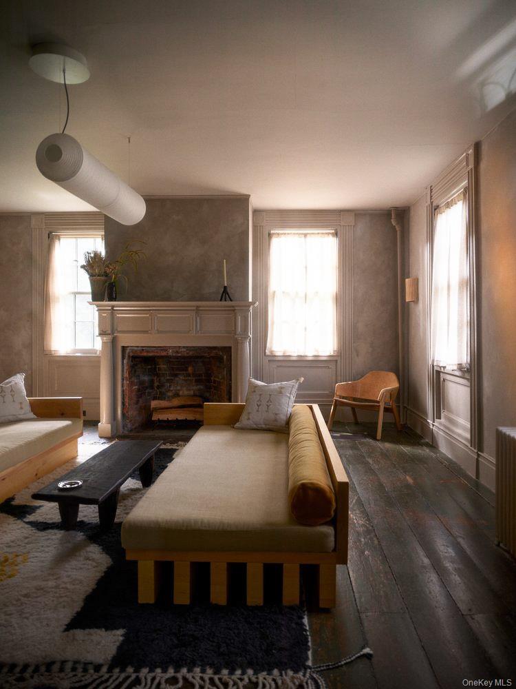 Perfectly sited on an historic River Road skirting the Hudson, the c. 1820 Garrett Sickles House was expertly treated to a four-year restoration completed in 2023. This well-proportioned center hall was reimagined in collaboration with famed interior designer Nick Spain, and the house has been impeccably renovated from stem to stern: boasting of timeless finishes, modern conveniences and a touch of Brutalism in its cast. Featured in the likes of Wallpaper* and Upstate House, this property drips with timeless cool: original details are found throughout, from lavishly wide floorboards and chestnut ceiling beams to original moldings and an early American fireplace. The first floor presents a newly-designed kitchen featuring a massive green soapstone island and striking floor-to-ceiling & wall-to-wall windows - creating a bucolic diorama with its natural setting of fields and trees. A professional grade French door refrigerator and separate butler’s pantry, Bosch dishwasher and oversized Verona stove make cooking and hosting next level. The dining room features a new wood-burning stove, foot-wide floorboards, beautiful wall coverings and dramatic lighting. The golden and earthy tones continue to the living room, where symmetrical design makes the working fireplace the focus and six-over-six windows allow the western sunset to bathe the space in natural light. Off the living room, the first floor bath nods to modernism with a custom concrete sink, green concrete-skimmed walls and imported handmade plumbing mixing with the original restored clawfoot tub. An adjacent home office sits on the southeast corner of the home with windows on both sides, making it the perfect place to focus and find inspiration. Upstairs, the color palette lightens. A guest bedroom with its own private staircase has two built-in beds, allowing guests autonomy and seclusion. The primary oversized bedroom holds large windows on three sides. Cross breezes keep the space cool in the summer, and the internal chimney warms the home on winter nights. A second bedroom adjoins the main bedroom, as does a custom bathroom featuring Waterworks fixtures, a deep soaking tub, a double sink and floor to ceiling handmade Spanish tiles. Outside, the original cedar facade of the home was hand restored and finished. An inviting porch on the front of the house and a larger one on the back makes for the perfect setting to read a great book or share in conversation with friends. The Garrett Sickles House is a true, move in-ready oasis featuring new household elements: two newly rebuilt & refined chimneys, roof, 1500 g concrete septic tank, leech field, plumbing, oil tank, 400amp electric system (ready for your EV), appliances, Generac backup power system, and custom Marvin Signature Ultimate windows. And the Stuyvesant location is equidistant from the center of bustling Hudson and charismatic Kinderhook. There is never a loss of things to do at the Garrett Sickles house. Warren Street in Hudson is a short drive and features a number of highly-regarded restaurants, art galleries and clothing stores. Bartlett house, Coopers Daughter, Art Omi, Kinderhook Farms, The Jack Shainman School, Klocke Estate and dozens of other attractions are all within the immediate area, ensuring that weekend getaways are always entertaining. The home is also available fully and partially furnished - pricing option available