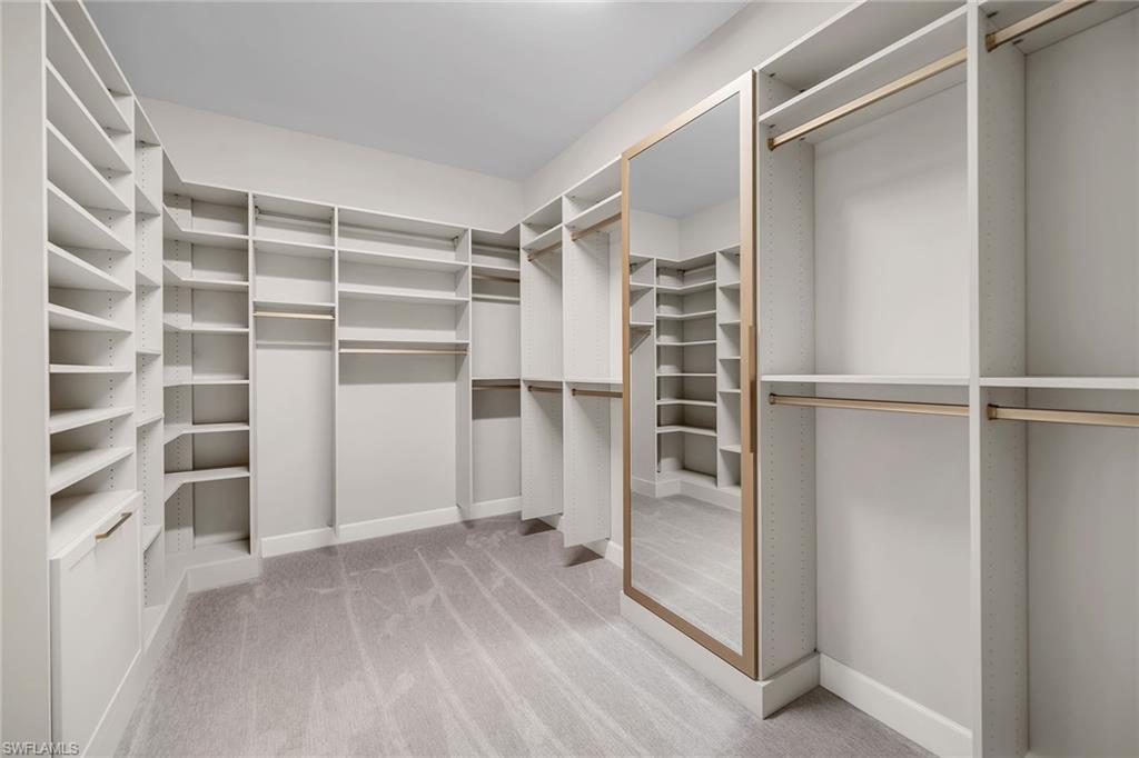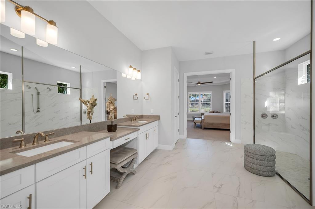 Enjoy refined living in this beautifully furnished, extensively upgraded residence, where tranquil water views, custom lighting, and designer details create a light-filled retreat with seamless indoor-outdoor living. The thoughtfully designed floor plan offers three bedrooms plus a den, three full baths, and a two-car garage. Wood-look porcelain tile flows throughout the main living areas, complemented by crown molding, recessed lighting, and custom architectural accents. Large windows and glass sliders invite abundant natural light, enhancing the home’s bright, airy ambiance. The welcoming foyer features double French doors with decorative glass, sidelights, and a tray ceiling. The open kitchen is stylish and functional, showcasing white cabinetry with under-cabinet lighting, quartz countertops, a tile backsplash and a walk-in pantry. Stainless steel appliances include a gas cooktop with hood, wall oven, microwave, dishwasher and refrigerator with icemaker. A spacious island with bar seating and pendant lighting anchors the kitchen, with easy lanai access and seamless flow to adjacent dining area. The living room is a centerpiece, highlighted by a tray ceiling with shiplap detail, a shiplap accent wall, modern ceiling fan and custom lighting. Expansive glass sliders open to the lanai, seamlessly blending indoor comfort with outdoor enjoyment. The covered outdoor living area features recessed lighting, dual ceiling fans and a panoramic screen enclosure overlooking the lake, along with a fully equipped outdoor kitchen with built-in barbecue grill, sink and mini refrigerator, ideal for effortless entertaining and alfresco dining. A heated pool and spa with sun shelf and loungers complete this private resort-style retreat, complemented by storm shutters for added peace of mind. The owner’s suite is a serene sanctuary with lake views, white plantation shutters and double-door entry to a spa-inspired bath. The en-suite bath offers a dual-sink vanity with makeup counter, quartz surfaces, full-width mirrors and a walk-in shower with multiple shower heads, floor-to-ceiling tile and privacy windows. A large walk-in closet with custom California Closets-style built-ins completes the retreat. Two guest bedrooms also feature plantation shutters; one enjoys an en-suite bath with a glass-enclosed walk-in shower, while the other is adjacent to a bath with a shower-tub combination accessible from the hallway. A versatile den with a shiplap accent wall serves beautifully as an office or study. The custom laundry room includes built-in cabinetry, quartz counter space, a utility sink, and GE washer and dryer. The garage is enhanced with added insulation and air conditioning for added comfort and functionality. Residents enjoy an award-winning, gated community with a refreshed resort-style pool, updated Gator Grille and 10 new pickleball courts. Optional memberships, with no golf waitlist, provide access to golf, the marina and a private beach club.