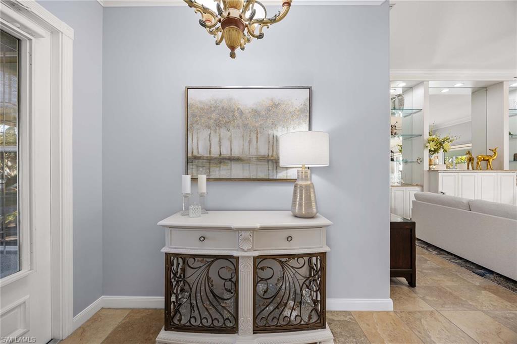 Welcome to this brilliantly modified Oakmont floor plan in the gated community of Verona Walk in Naples. Set on an oversized lot with sunny southern exposure, this residence features a custom expansion to include three full baths, an uncommon layout in this model. Designed for low-maintenance living, it offers solid poured concrete construction by DiVosta Homes and a lifestyle-rich setting just moments from world-class beaches, dining and shopping in Naples and Marco Island. The interior is freshly painted in coastal tones and showcases all porcelain tile flooring throughout. A fully remodeled kitchen features white cabinetry with pot drawers and stone countertops, while all baths have been upgraded with matching cabinetry and stone tops. The spacious lanai includes a saltwater pool with a low-maintenance keystone-finished deck, upgraded no-see-um screen enclosure, built-in cabinetry with big screen television and a custom tongue-in-groove ceiling. A hot tub sits just outside the primary suite for added relaxation. Additional upgrades include electric roll-down screens on the doors, accordion shutters on the lanai, a newer HVAC system (4. 5 years old) and a water heater installed two years ago. Plantation shutters add elegance throughout the home, while built-in closet systems in all bedrooms provide practical luxury. An upgraded front-load washer and dryer add everyday convenience. Outdoor enhancements include a recent exterior repaint in a fresh coastal color palette, an attractive side-load garage elevation, expanded driveway, brick paver extension wrapping around the front, side and back of home, and a dedicated grilling patio just off the kitchen. Enjoy access to Verona Walk’s 20, 000-square-foot Town Center, offering tennis and pickleball courts, resort-style and lap pools, a 24-hour fitness center, and nearly 20 miles of recreational paths connected by Venetian-style bridges. The community also features a 24-hour staffed gatehouse for the convenience of residents and guests.