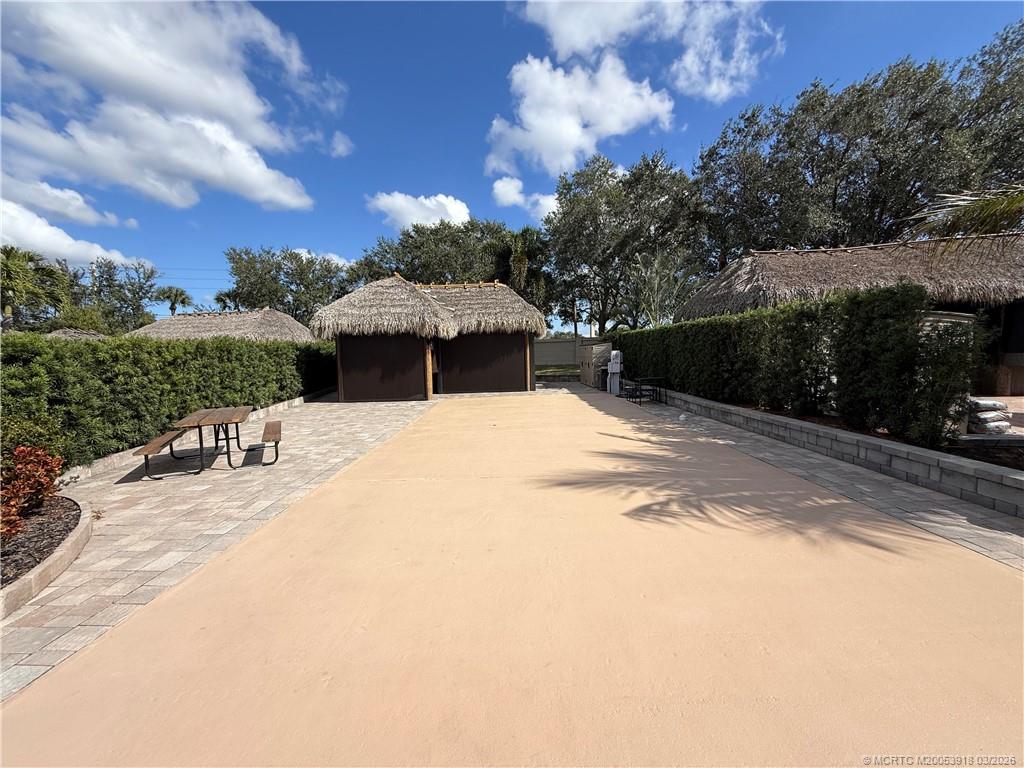 An oversized 3, 334 sq ft lot offering refined resort-style living in a premier Class A motorcoach community. This enhanced property features a custom tiki hut with remote-controlled screens and a marine-grade granite kitchen complete with hot water, upgraded fans, and an eye-level wall-mounted TV—ideal for elegant entertaining or relaxed evenings under the stars. The extra-long pad provides generous parking in front of the coach, while additional side width allows effortless golf cart access without the need to back up. Set on a picturesque, mature royal palm-lined street within one of the nation’s top-rated luxury motorcoach resorts, this one ticks the boxes. Dog lovers will appreciate the green space in the rear. Amenities include pickleball and tennis courts, bocce ball, shuffleboard, a par-3 executive golf course, 4 pools/spas and a vibrant clubhouse hosting year-round social events—all included in the HOA. Sold furnished and move in ready, just bring your coach and join the fun!