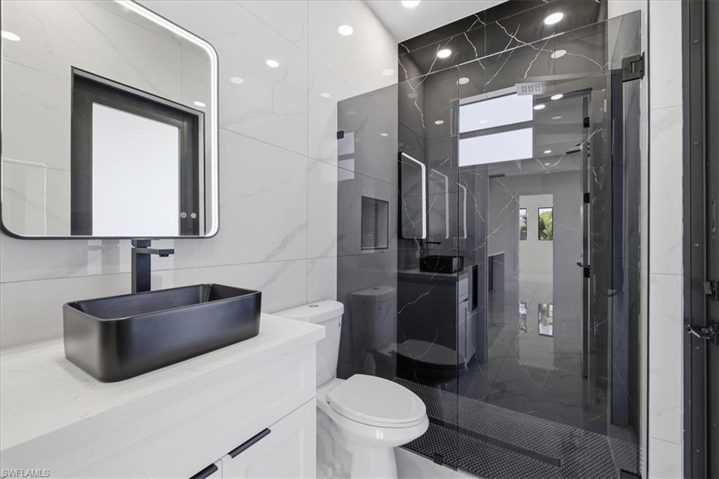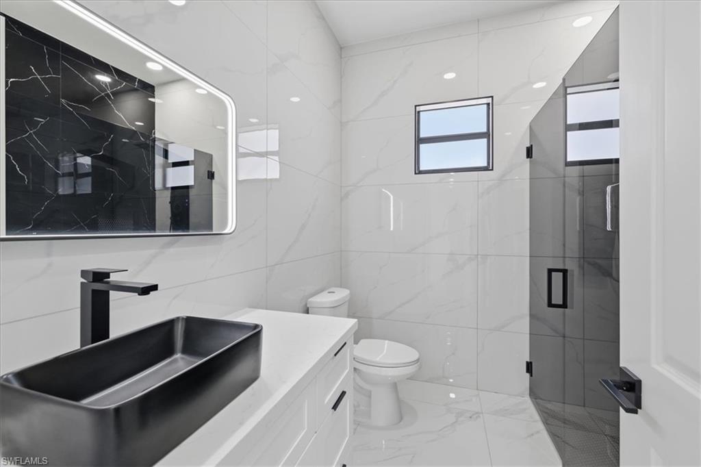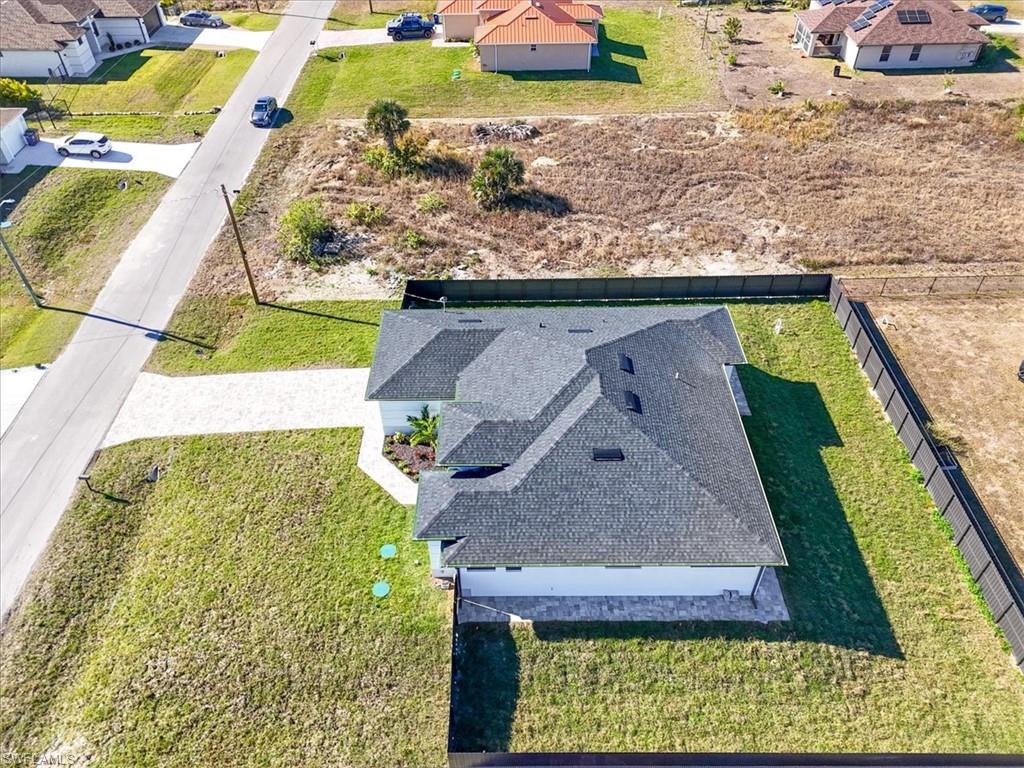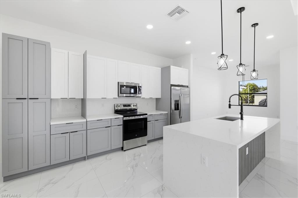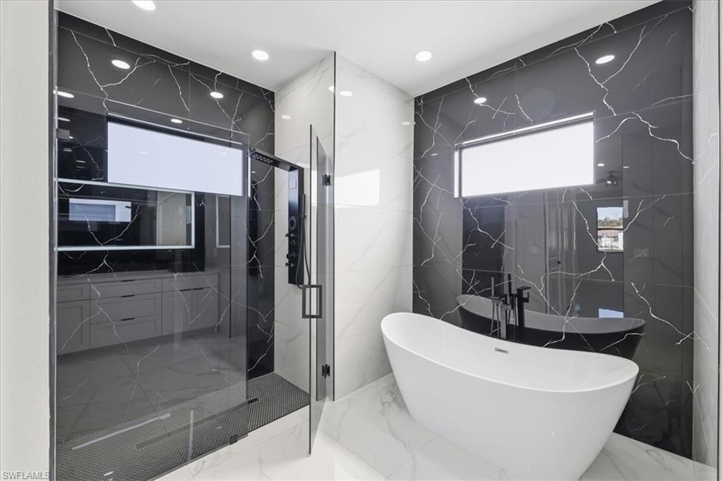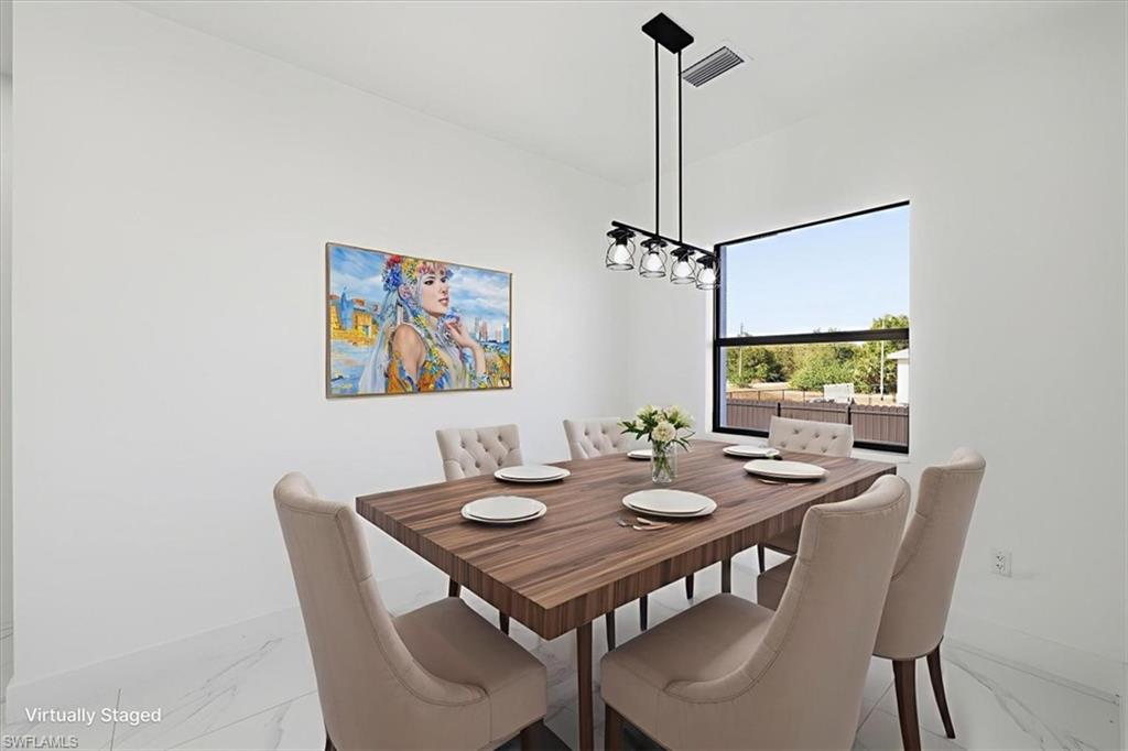 Newly built modern home in Lehigh Acres offering 1, 845 sq ft under air and 2, 595 sq ft total. This 3-bedroom plus den, 3-bath residence features 10-ft ceilings, an open-concept layout, and high-end finishes throughout. Interior highlights include white porcelain tile flooring, a custom accent wall, modern lighting and ceiling fans. The kitchen is designed with sleek cabinetry, quartz countertops, and stainless-steel appliances including washer and dryer. The primary suite offers a spa-inspired bathroom with freestanding soaking tub, floor-to-ceiling tile, illuminated mirrors, quartz countertops, and spacious his-and-hers built-in closets. Secondary bedrooms also feature built-in closets, with all bathrooms finished in modern vanities and full-height tile.